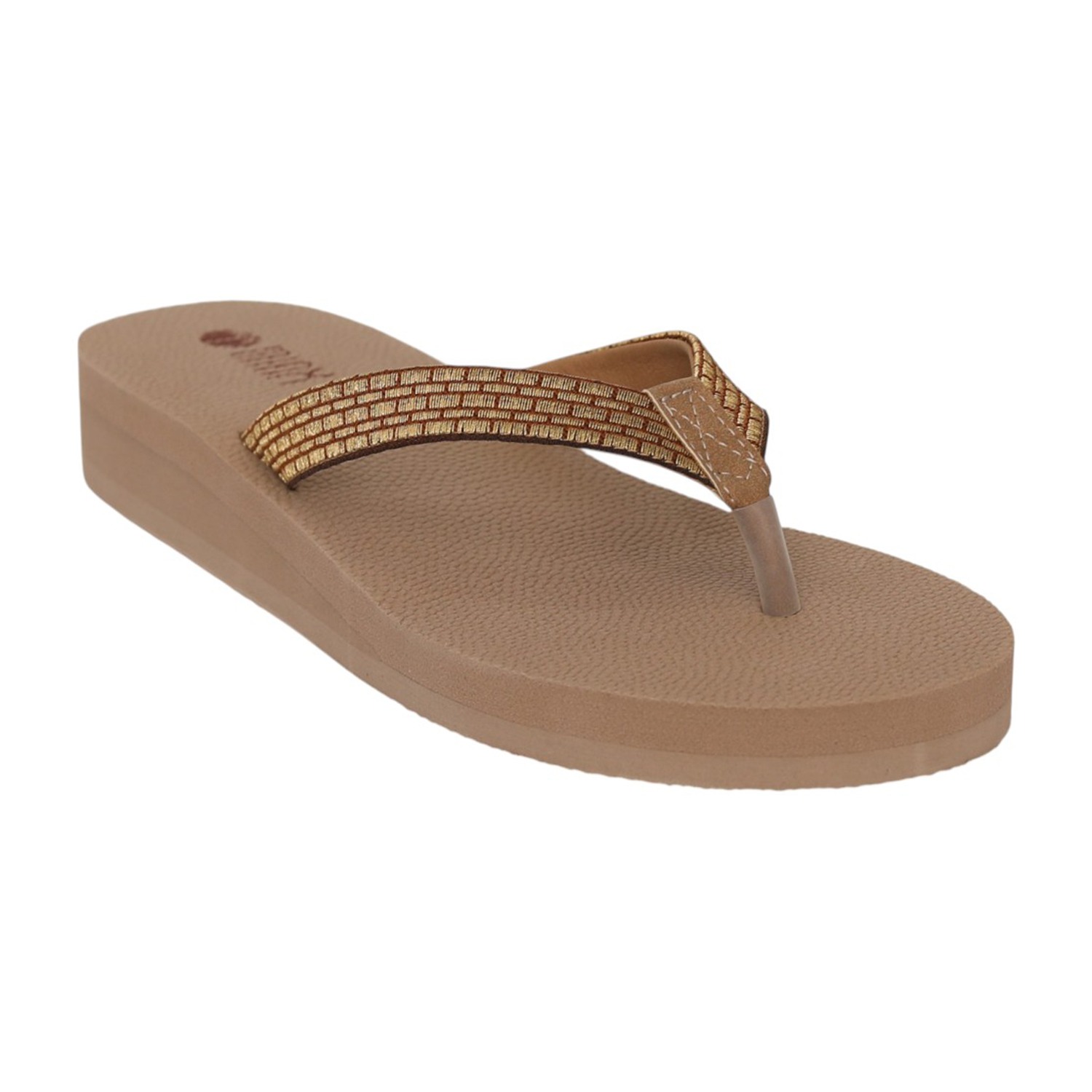 Women Beige Wedge Flip-Flops Textured Footbed Metallic Strap