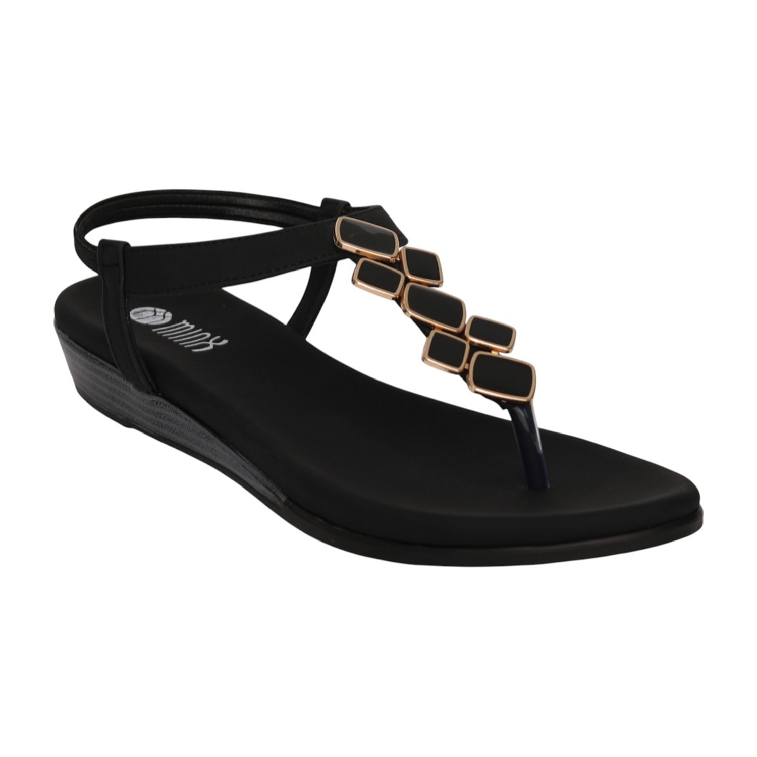 Women Black Embellished T-Strap Sandals with Metallic Accents