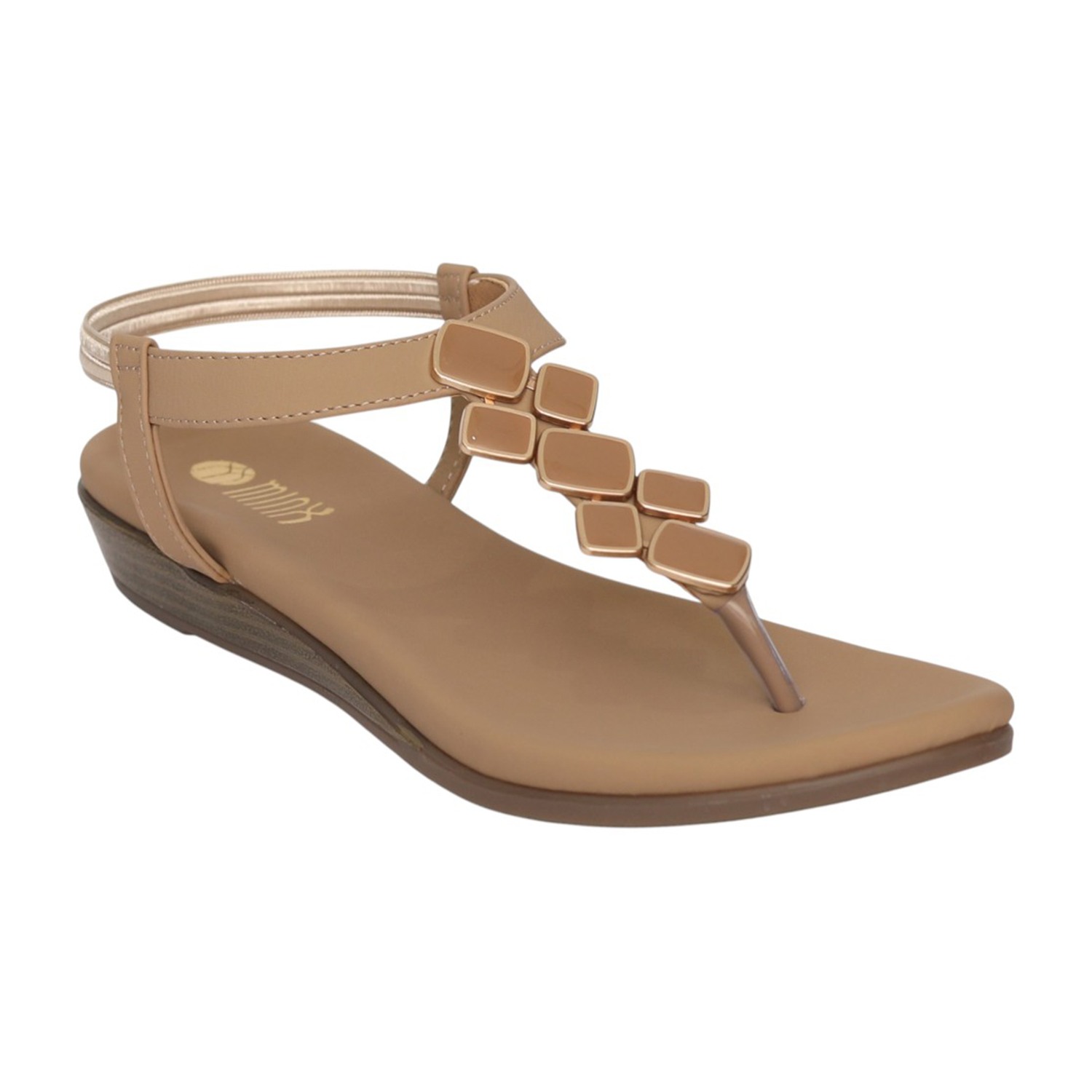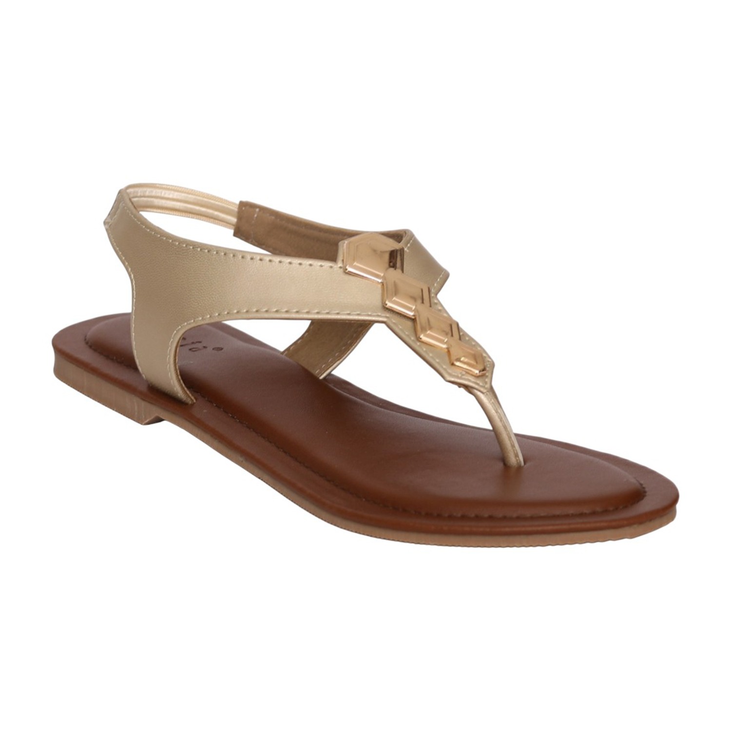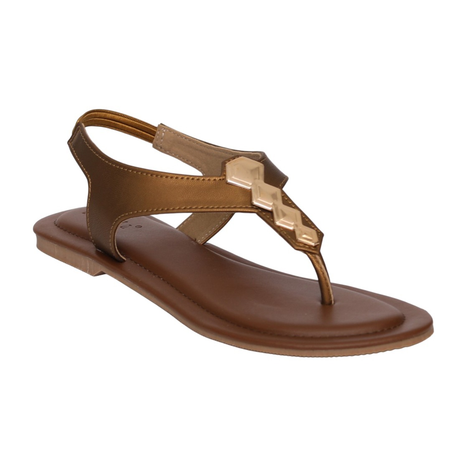 Women Tan T-Strap Flat Sandals with Metallic Embellishment