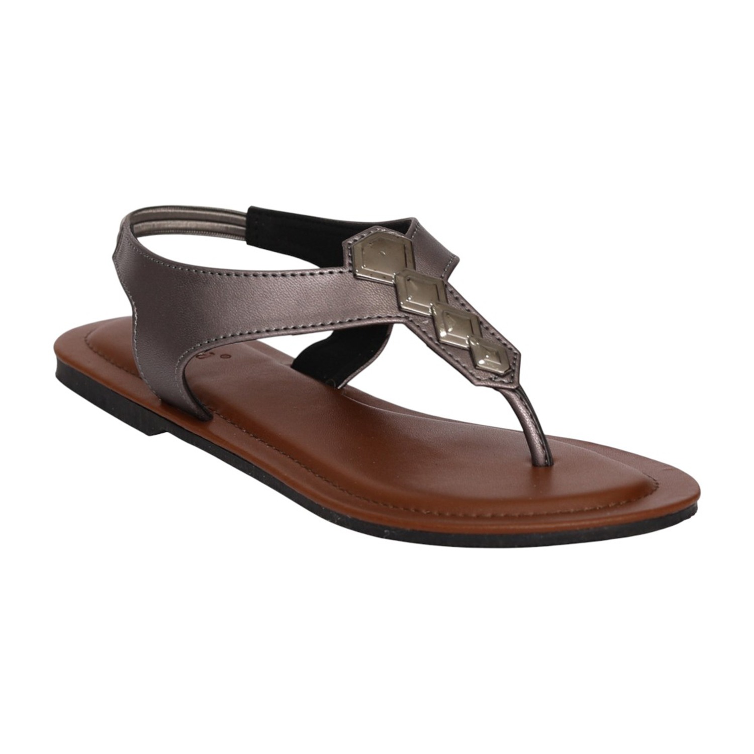 Women Grey T-Strap Flat Sandals with Metallic Embellishment