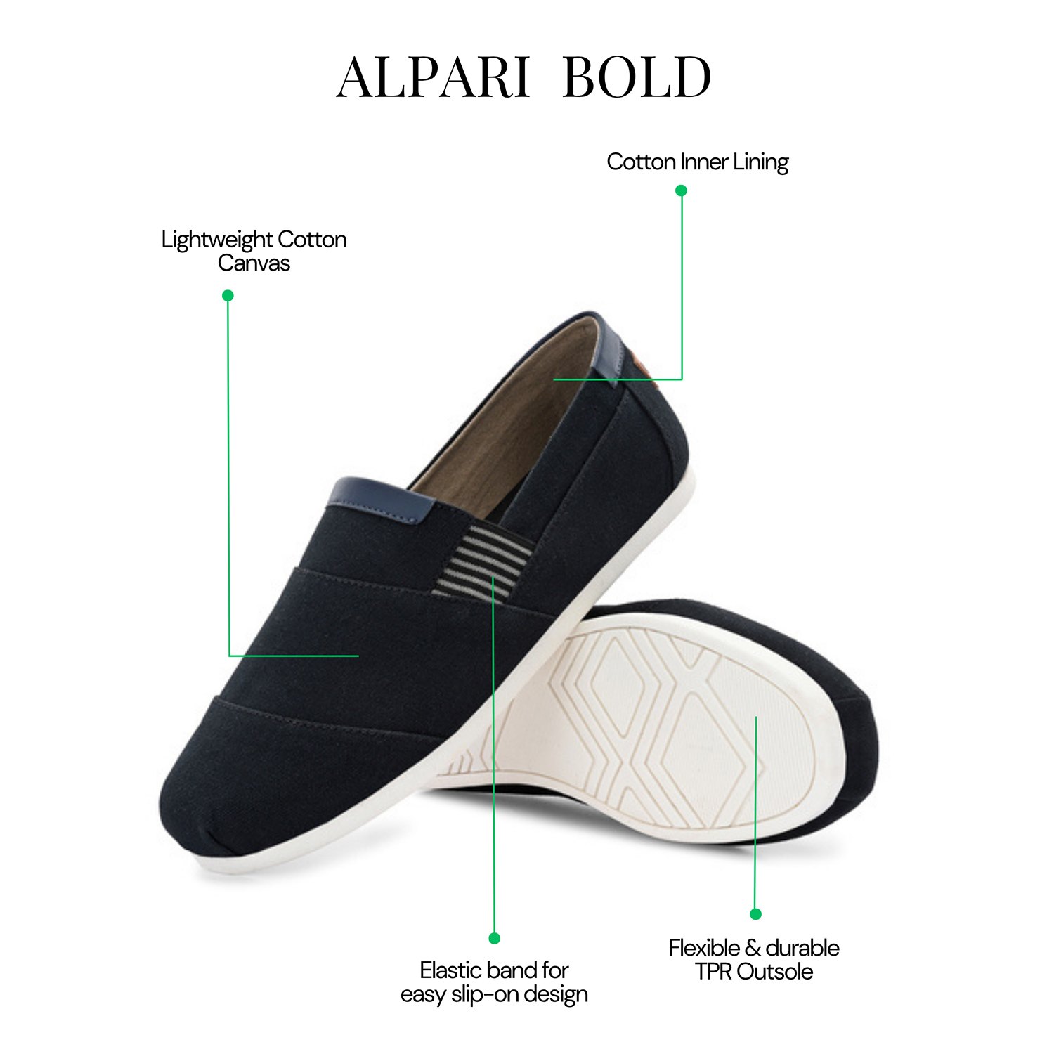 Alpari Bold navy slip-on blends the relaxed air of coastal classics with city-ready minimalism. Designed for movement and ease, its sleek upper is accented by subtle stripe panels and contrast lining details.