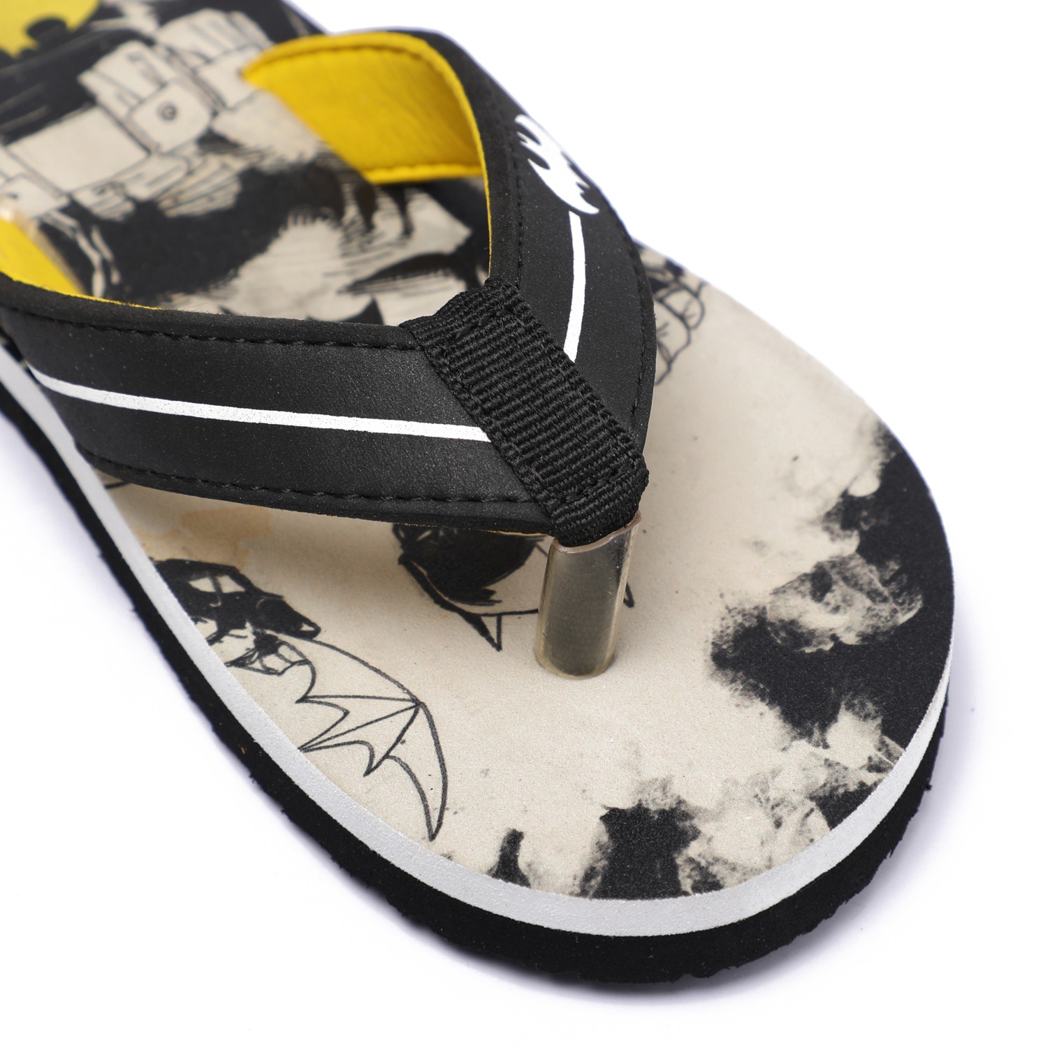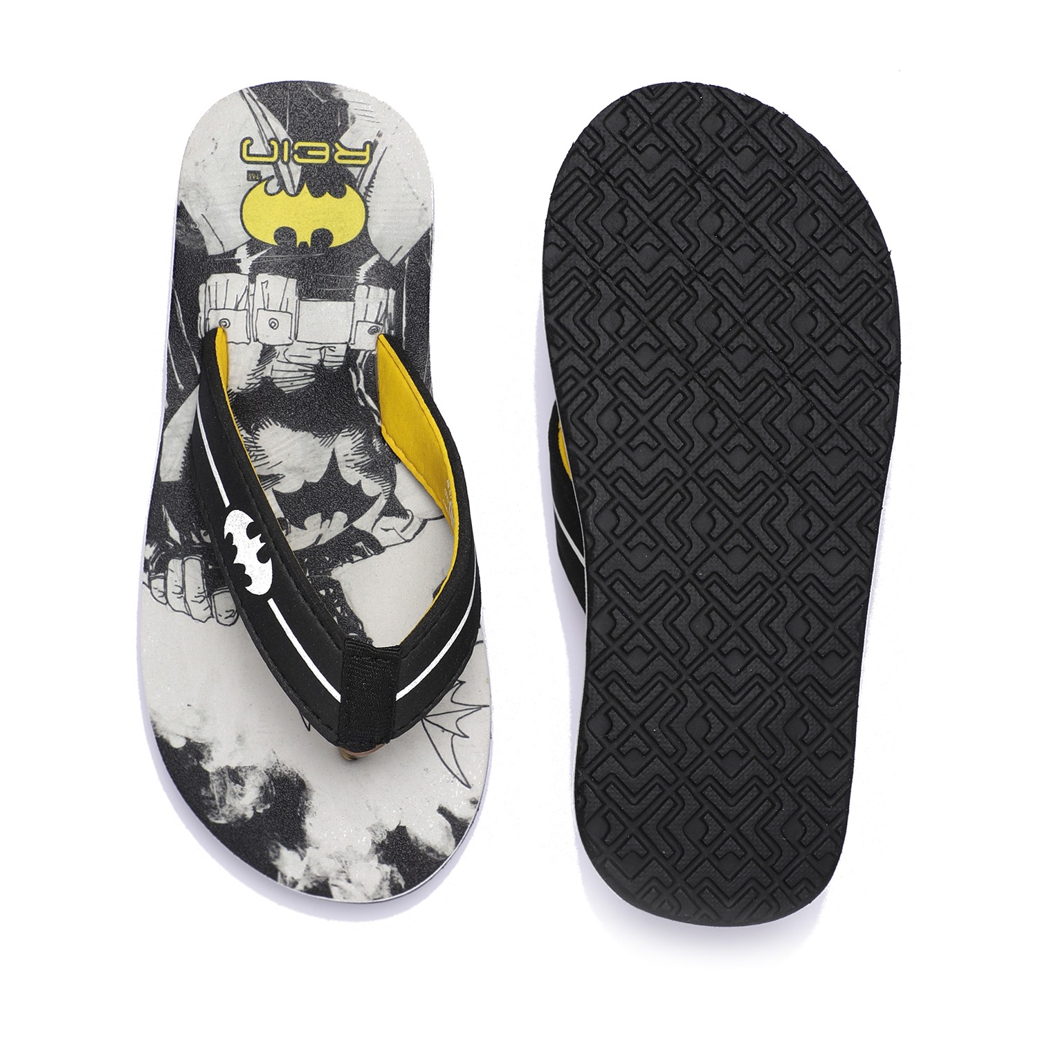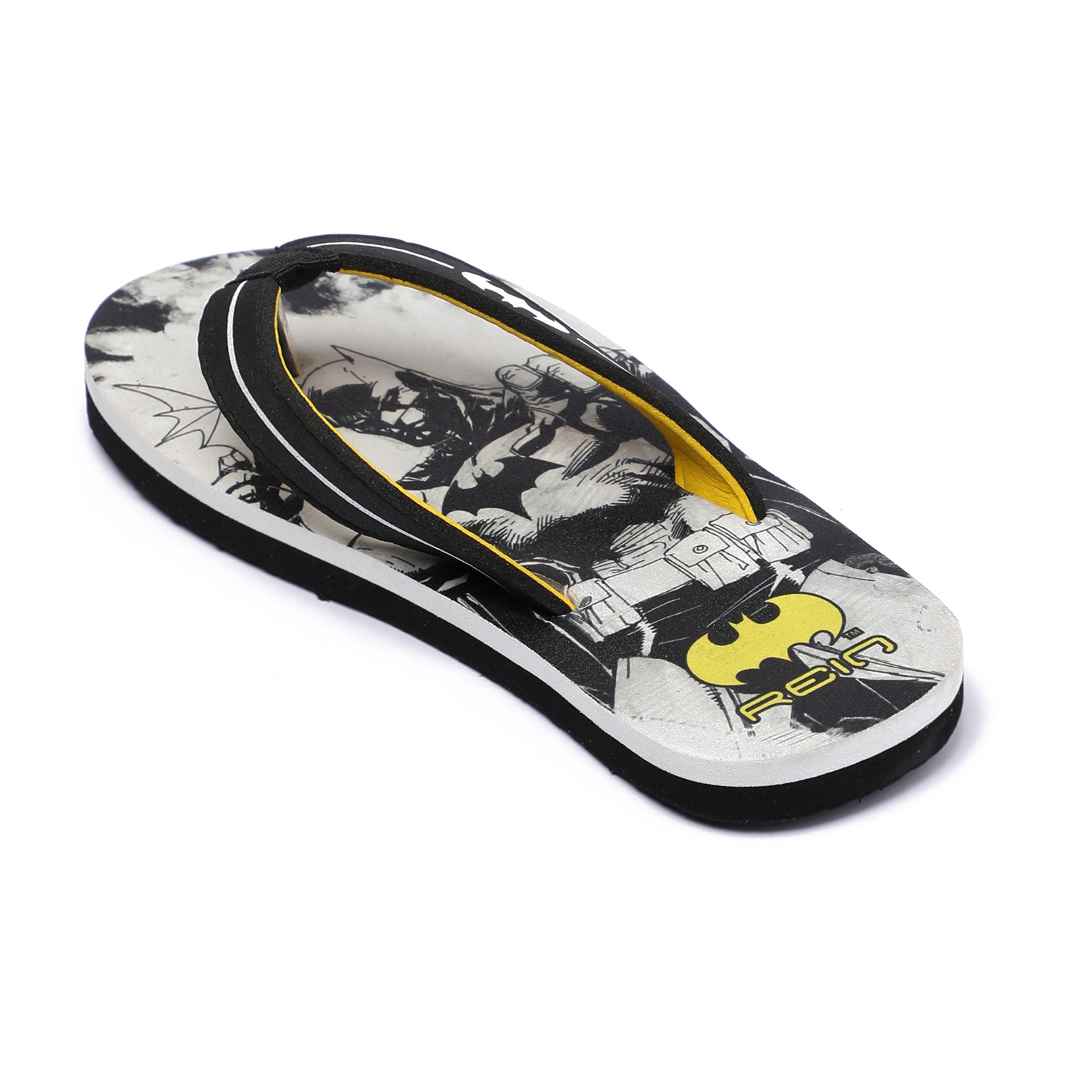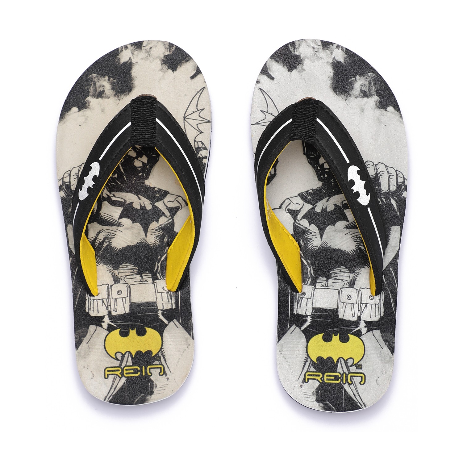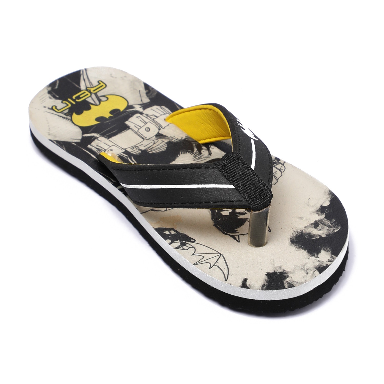 Let your Children step out in style with these fun and comfy Batman-themed flip-flops! Designed in bold black and yellow with iconic Batman graphics on the footbed, these flip-flops are perfect for casual outings or lounging around. The soft, cushioned sole ensures all-day comfort, while the sturdy thong straps provide a secure fit.
