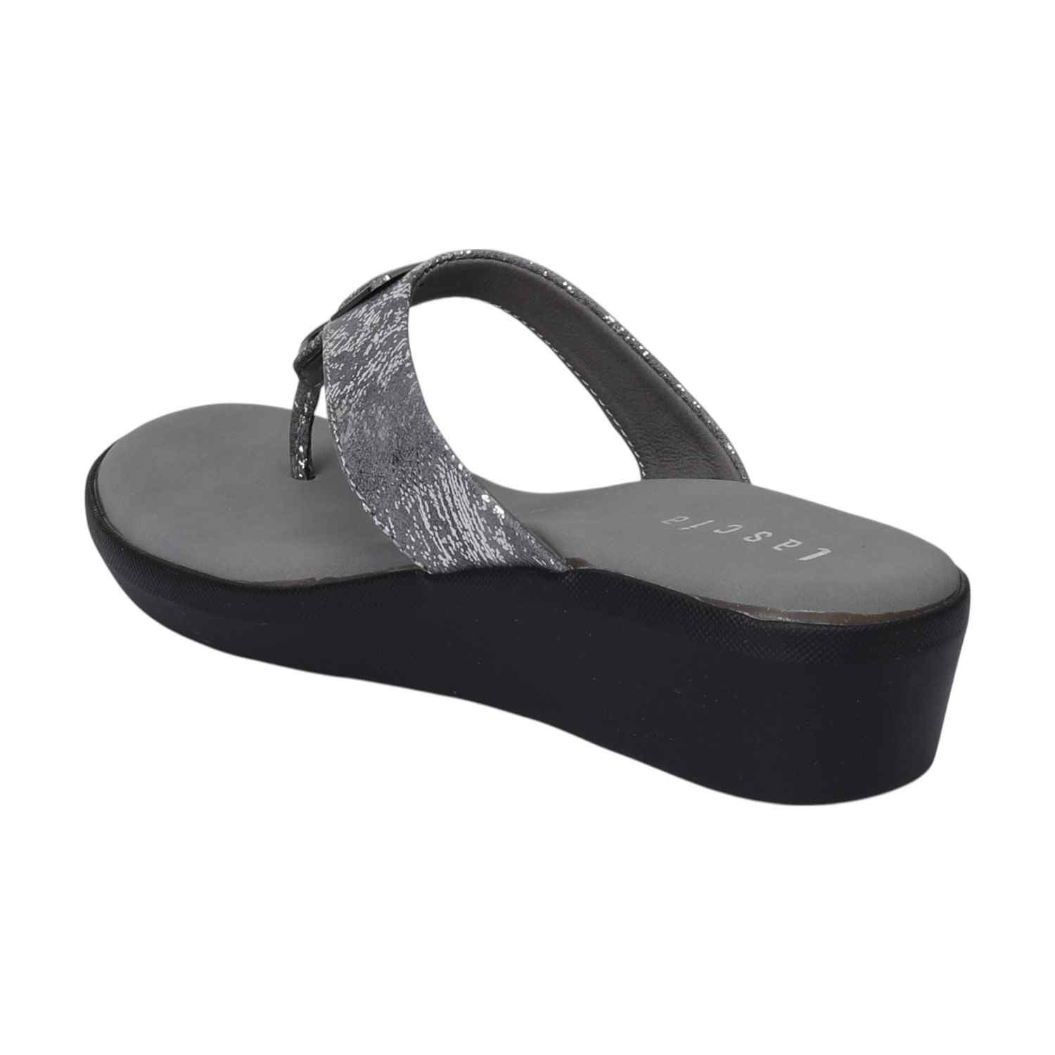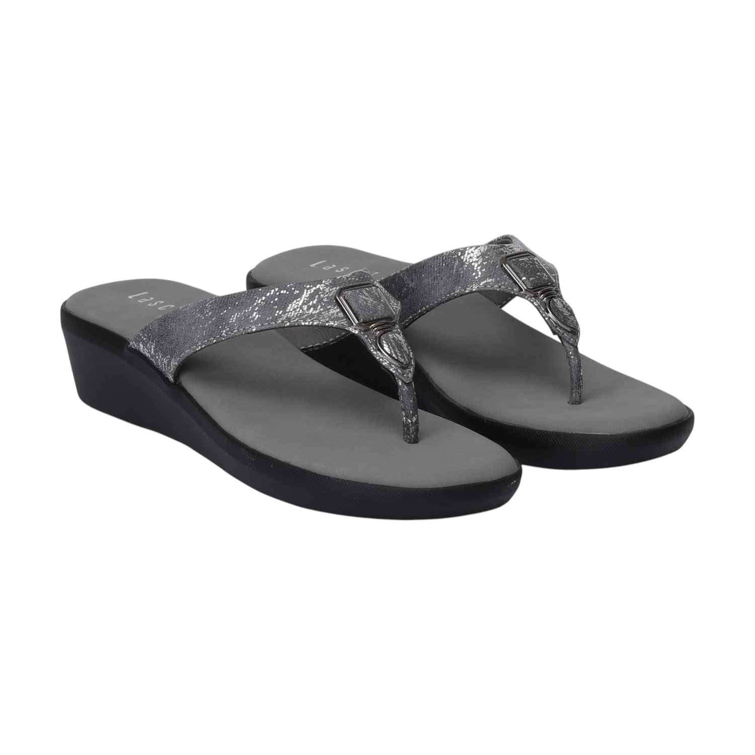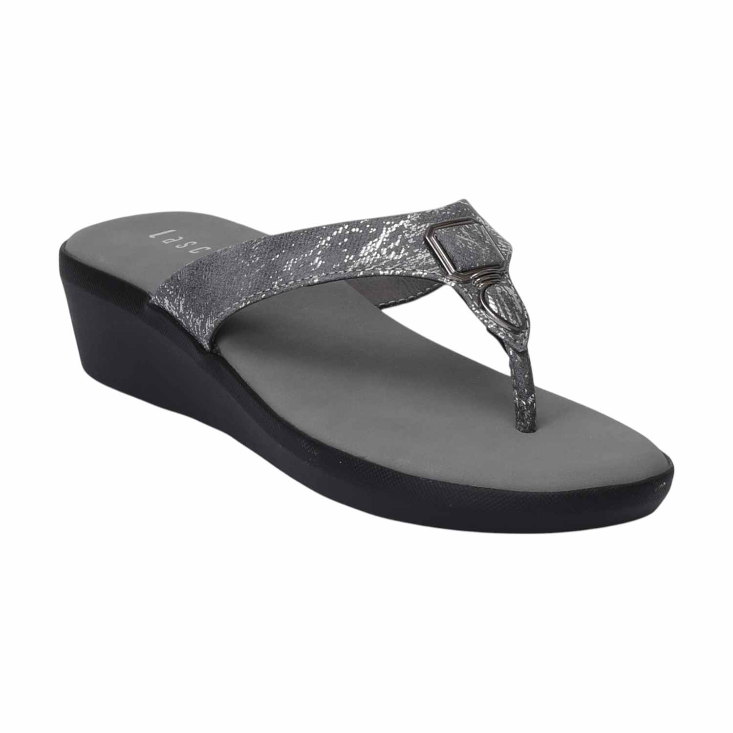 This Women Grey Wedge Flip-Flop offers a delicate blend of charm and comfortable elevation. It features a Greu toned thong strap with a subtle textured, possibly shimmering finish and a sleek metallic embellishment, set on a comfortable matching footbed and a contrasting black wedge sole, perfect for versatile daily wear.