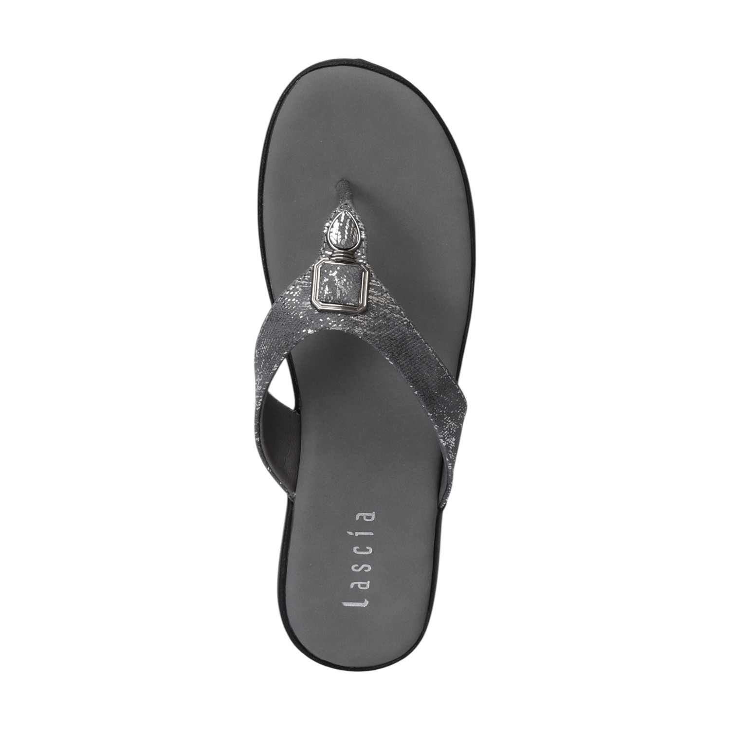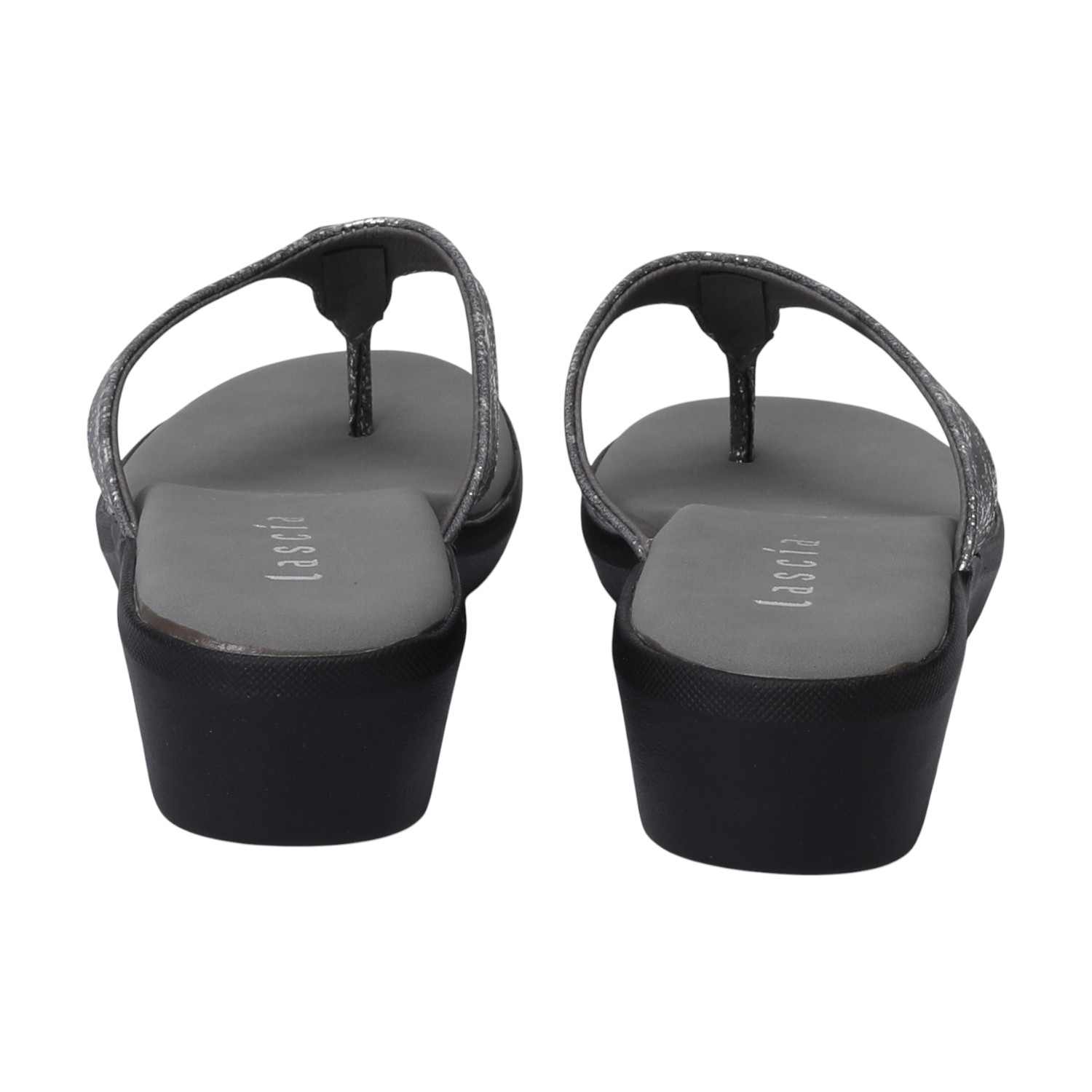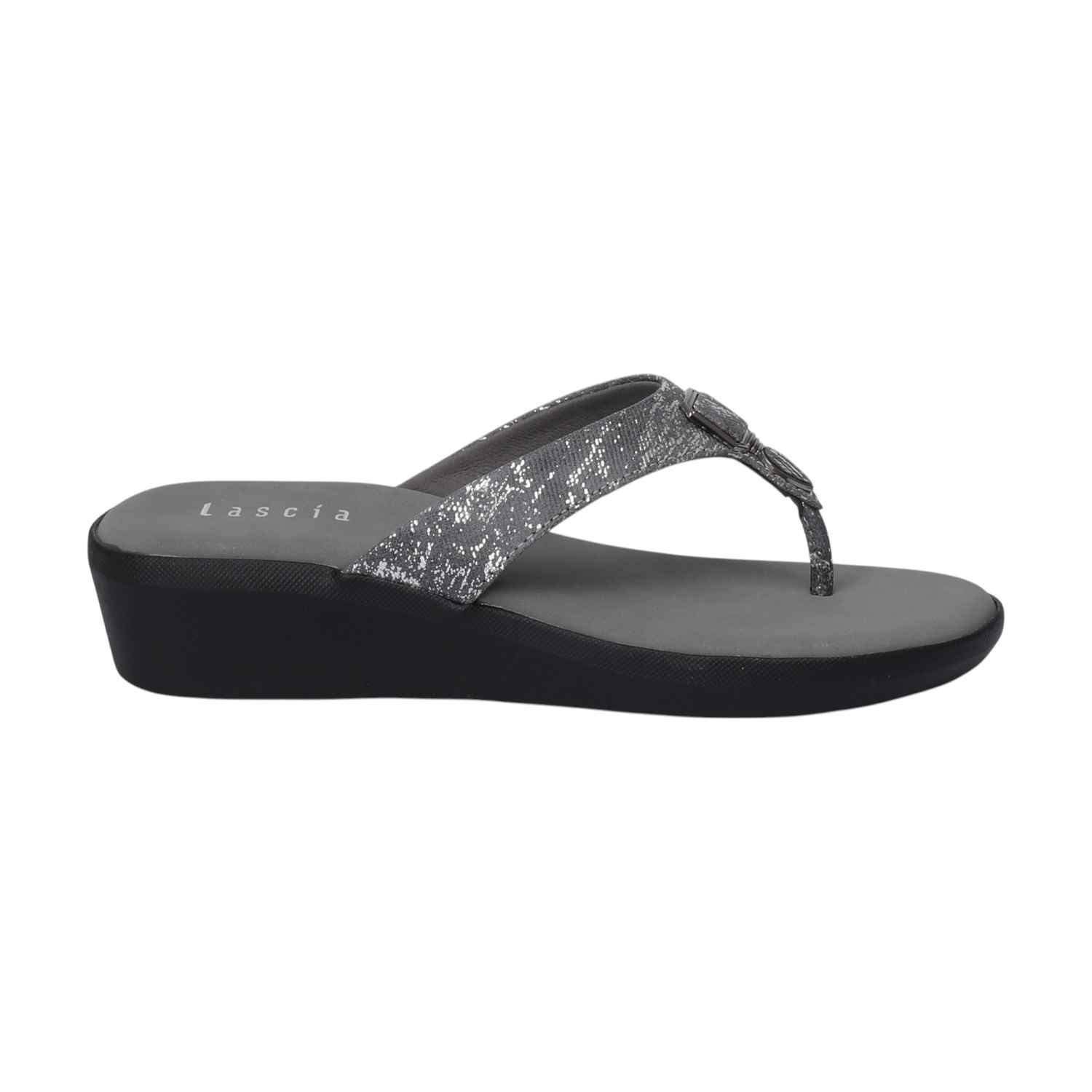 This Women Grey Wedge Flip-Flop offers a delicate blend of charm and comfortable elevation. It features a Greu toned thong strap with a subtle textured, possibly shimmering finish and a sleek metallic embellishment, set on a comfortable matching footbed and a contrasting black wedge sole, perfect for versatile daily wear.