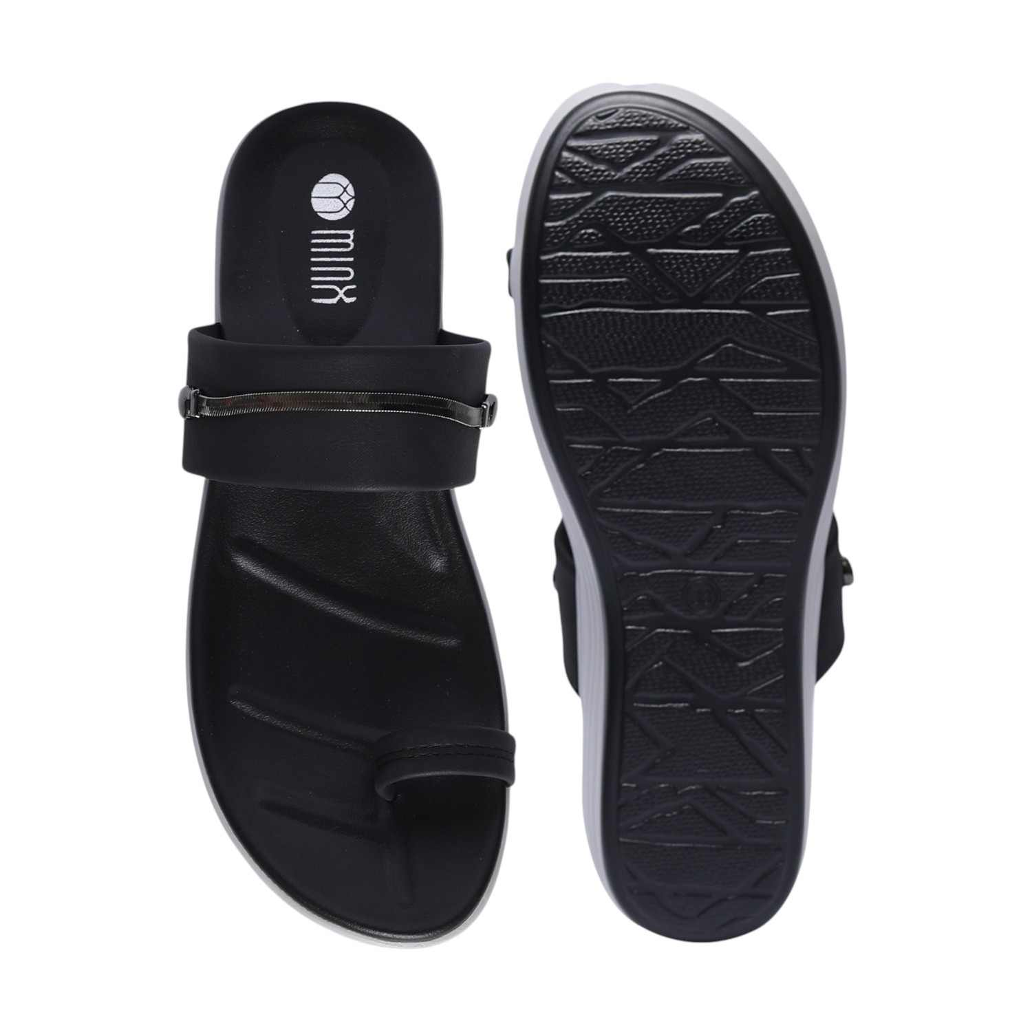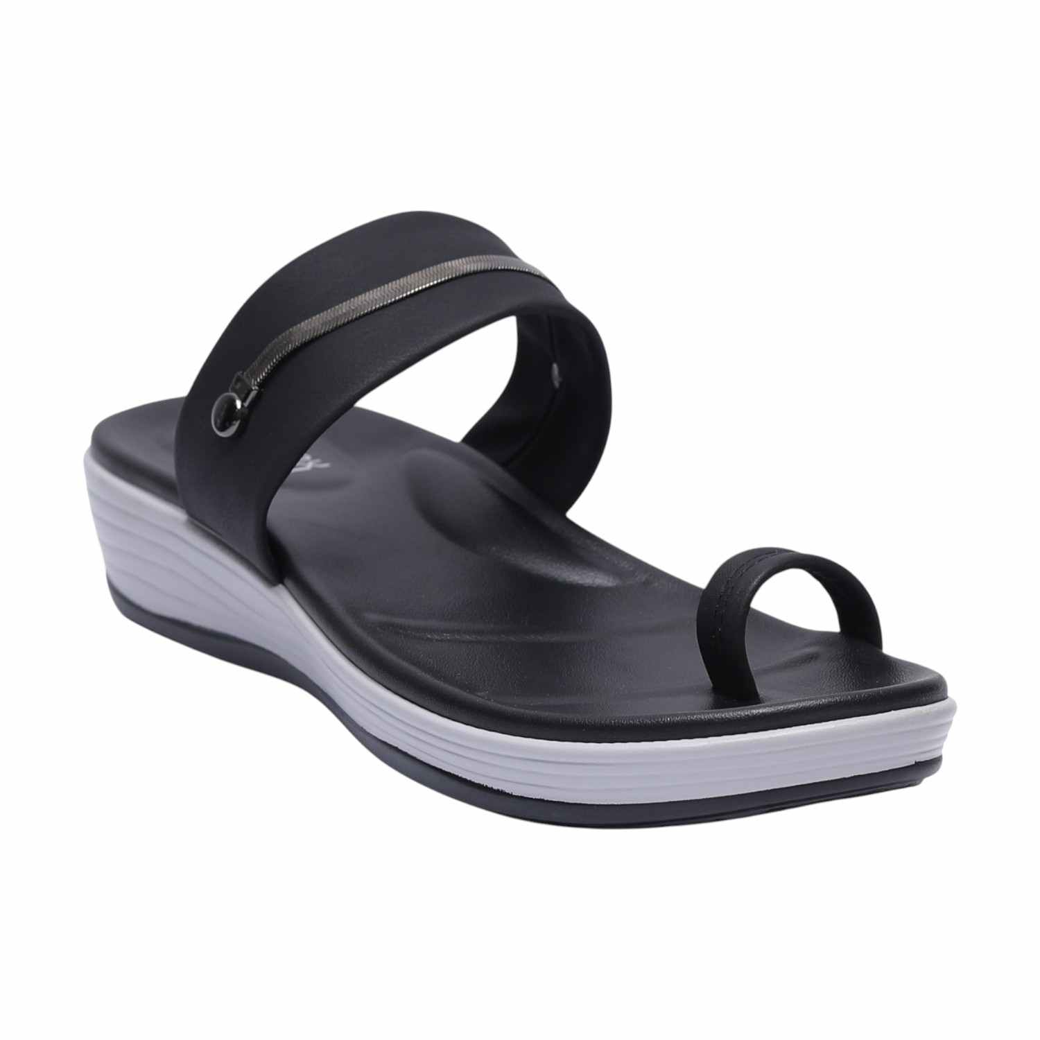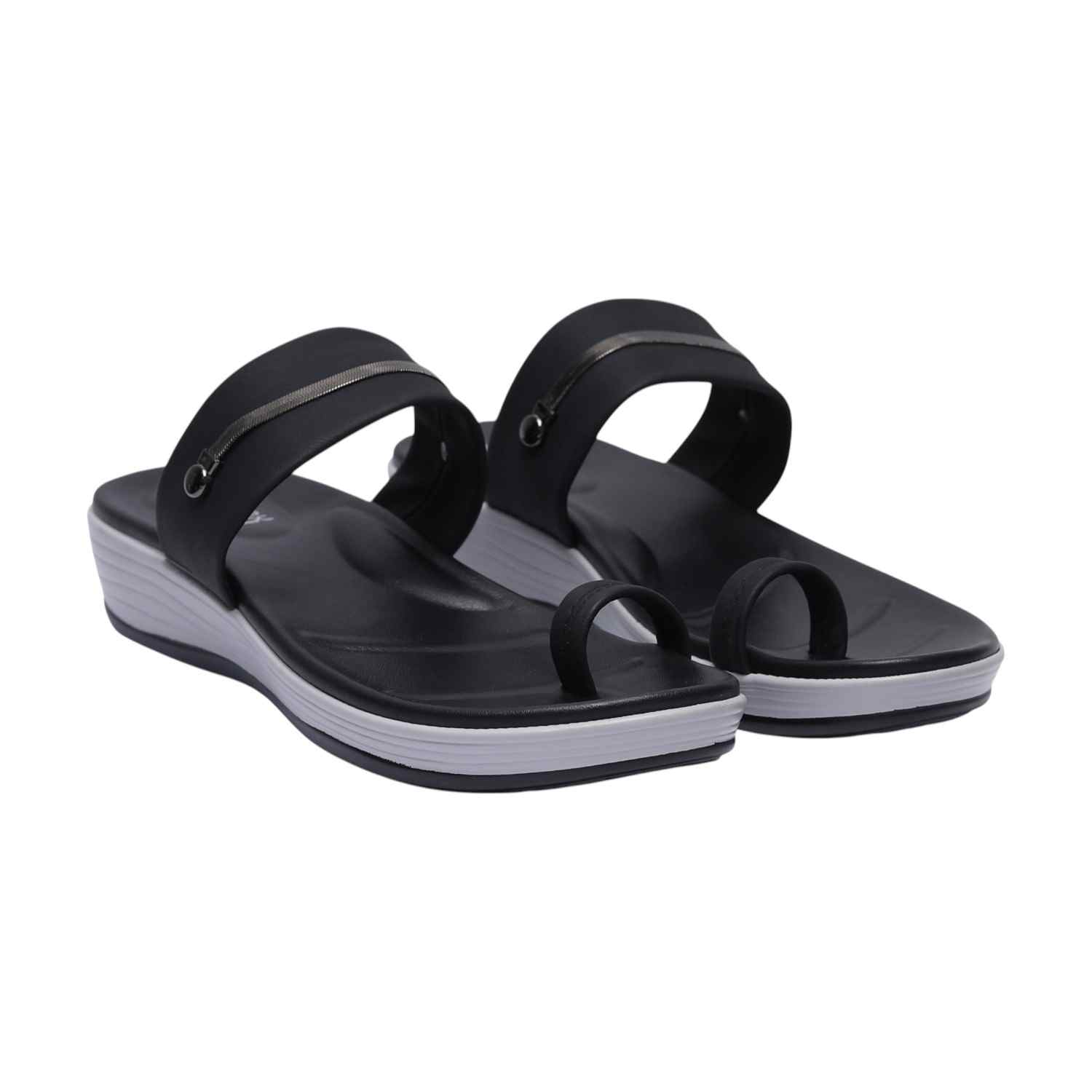 These Black Toe-Ring Sandals offer a sleek, modern aesthetic with a comfortable design. They feature a wide black strap accented with a chic horizontal metal bar, paired with a matching toe-ring, all set on a comfortable black footbed and a striking contrasting light grey wedge sole, perfect for an elevated casual look