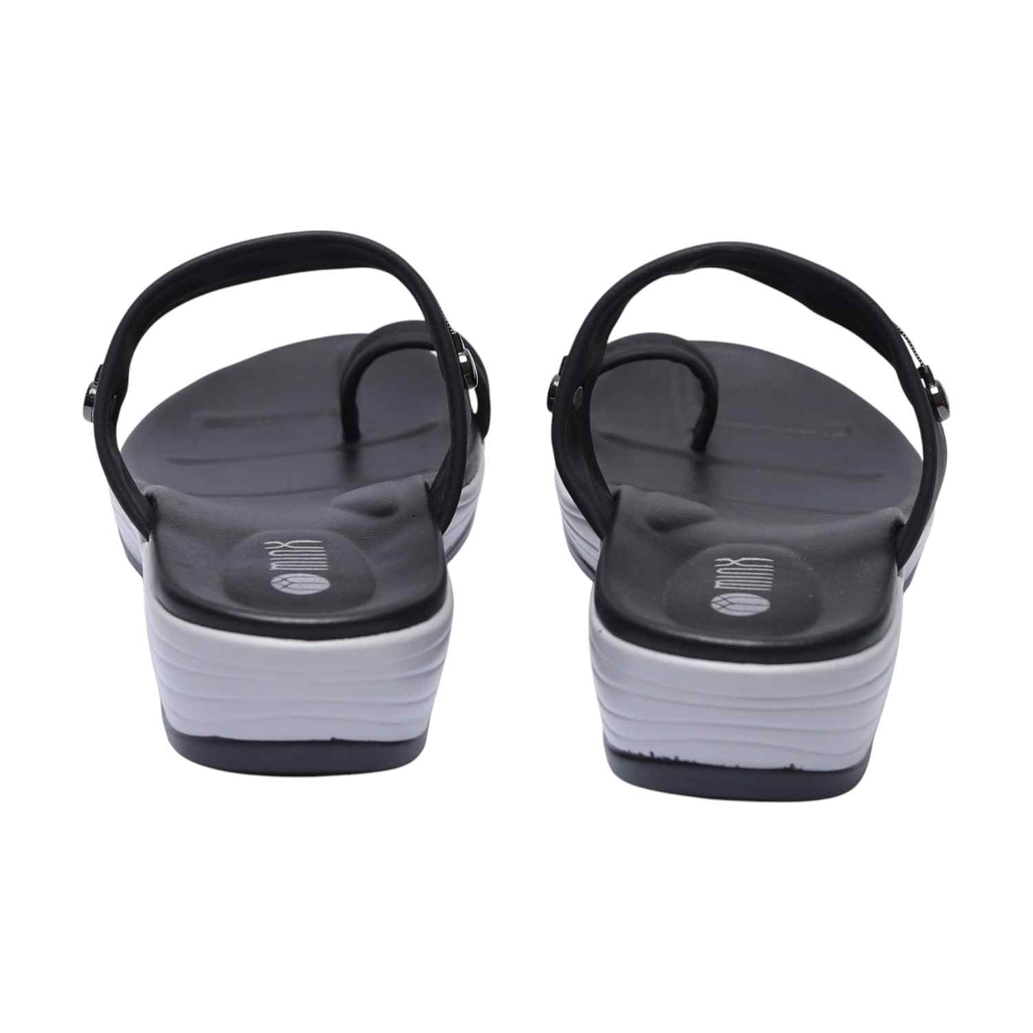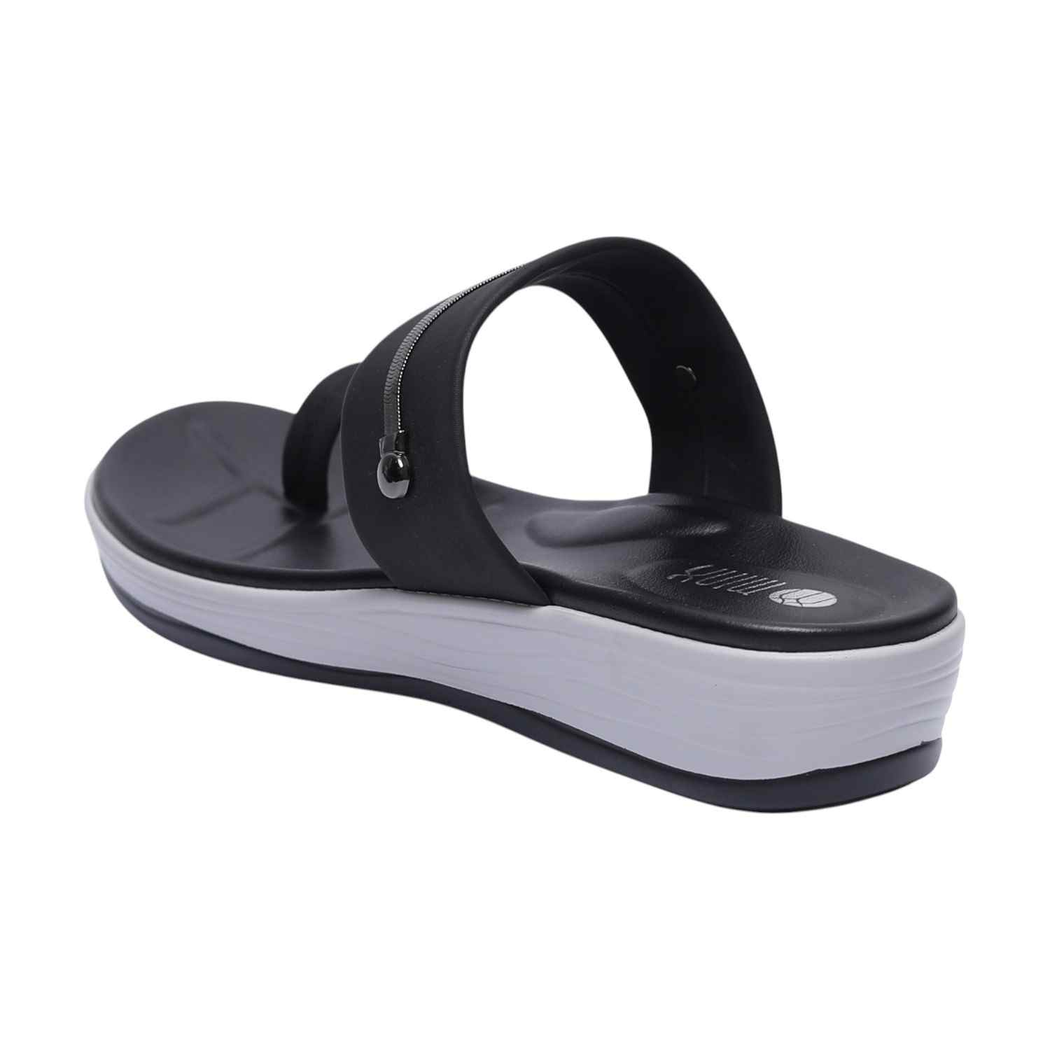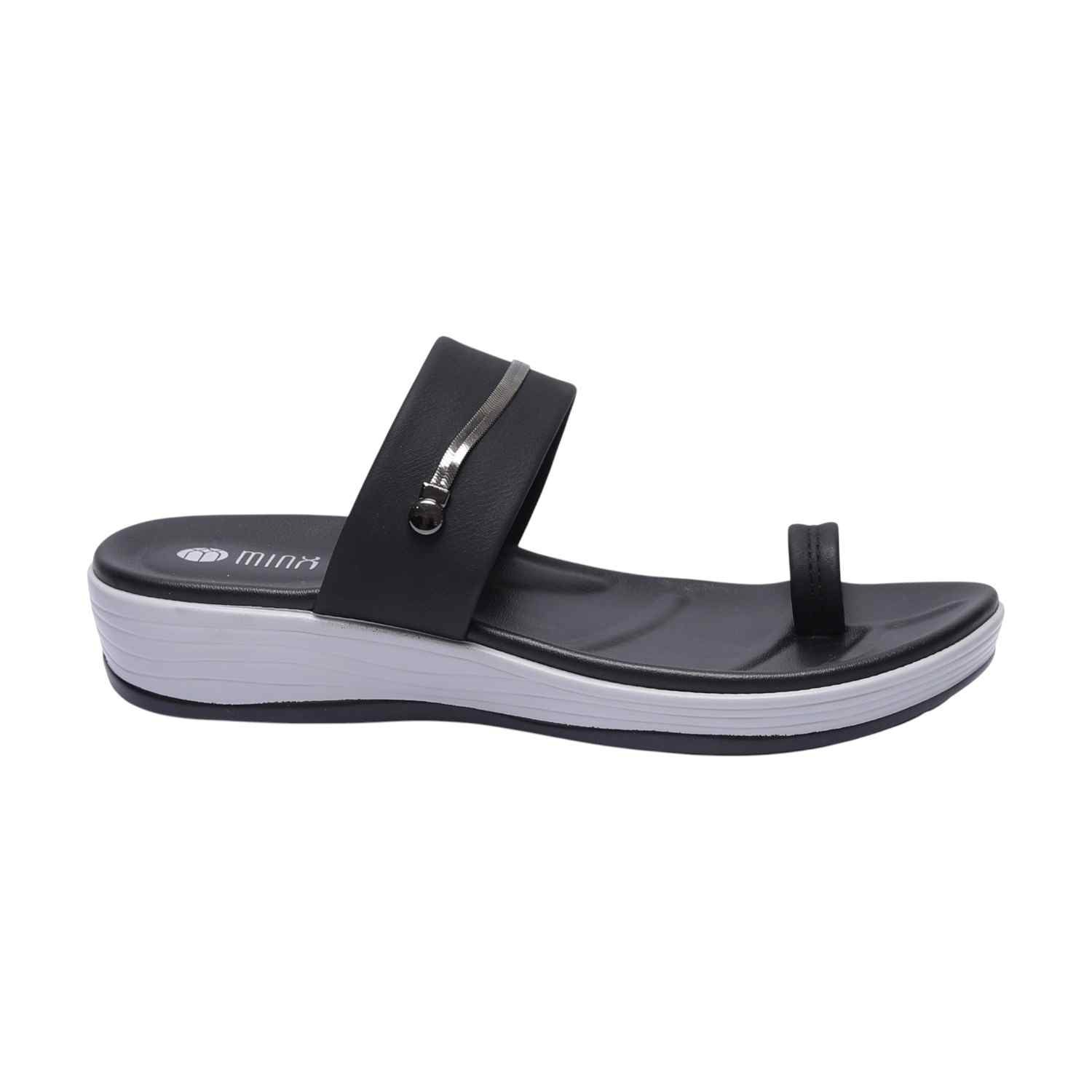 These Black Toe-Ring Sandals offer a sleek, modern aesthetic with a comfortable design. They feature a wide black strap accented with a chic horizontal metal bar, paired with a matching toe-ring, all set on a comfortable black footbed and a striking contrasting light grey wedge sole, perfect for an elevated casual look