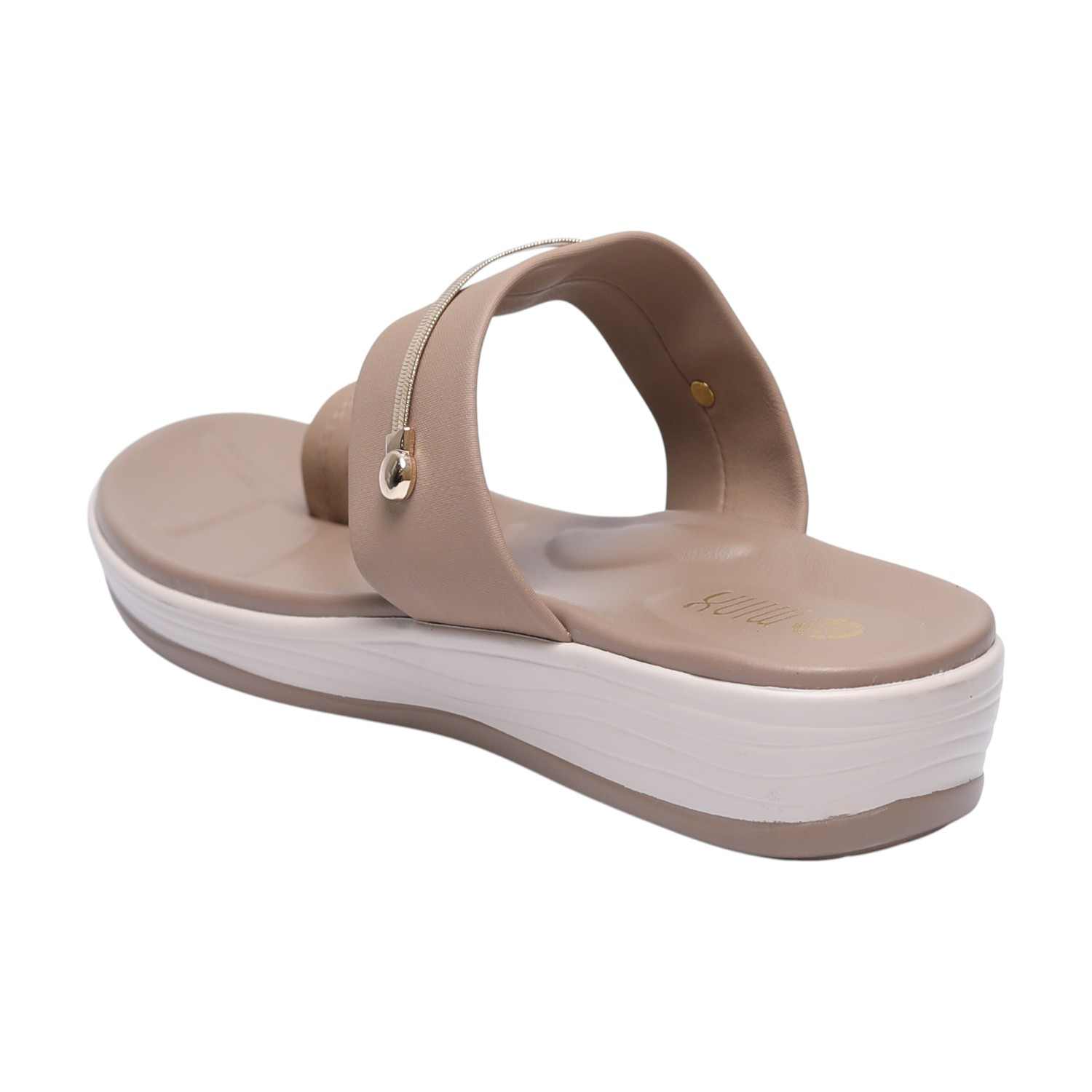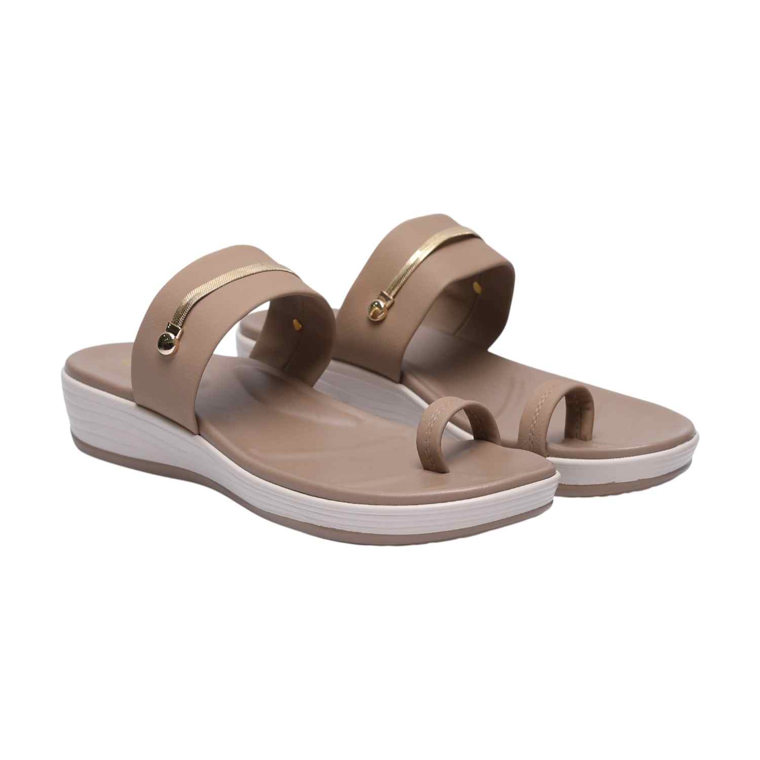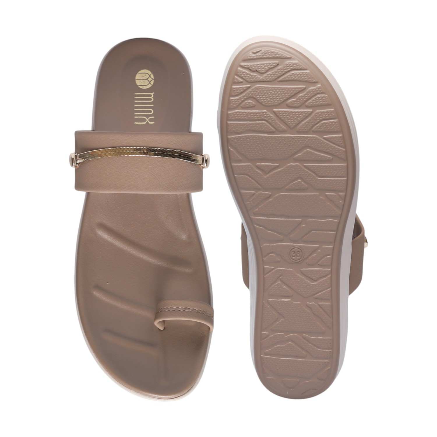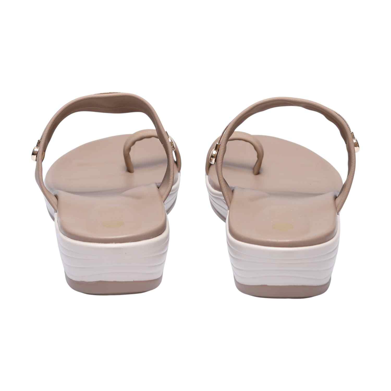 These Beige Toe-Ring Sandals offer a sleek, modern aesthetic with a comfortable design. They feature a wide black strap accented with a chic horizontal metal bar, paired with a matching toe-ring, all set on a comfortable beige footbed and a striking contrasting Off-white wedge sole, perfect for an elevated casual look