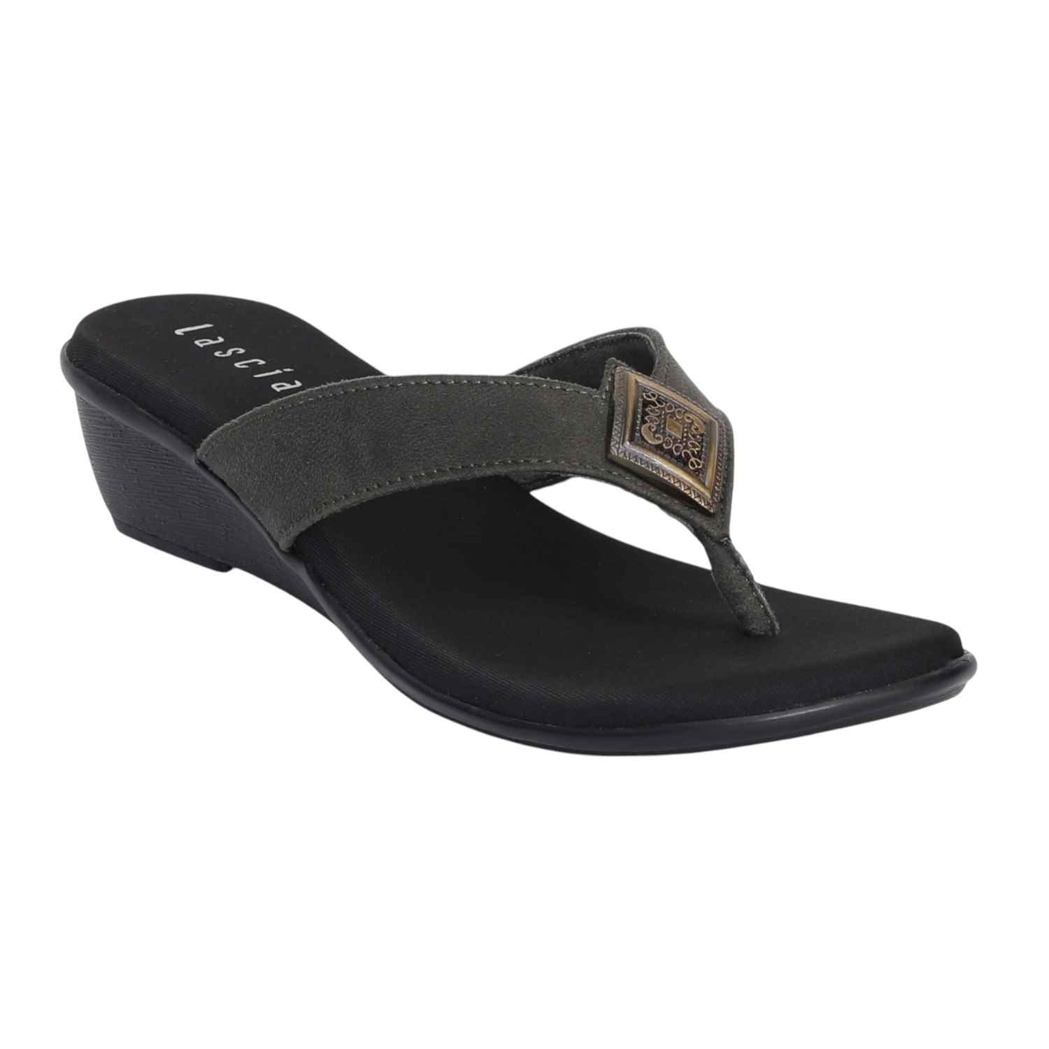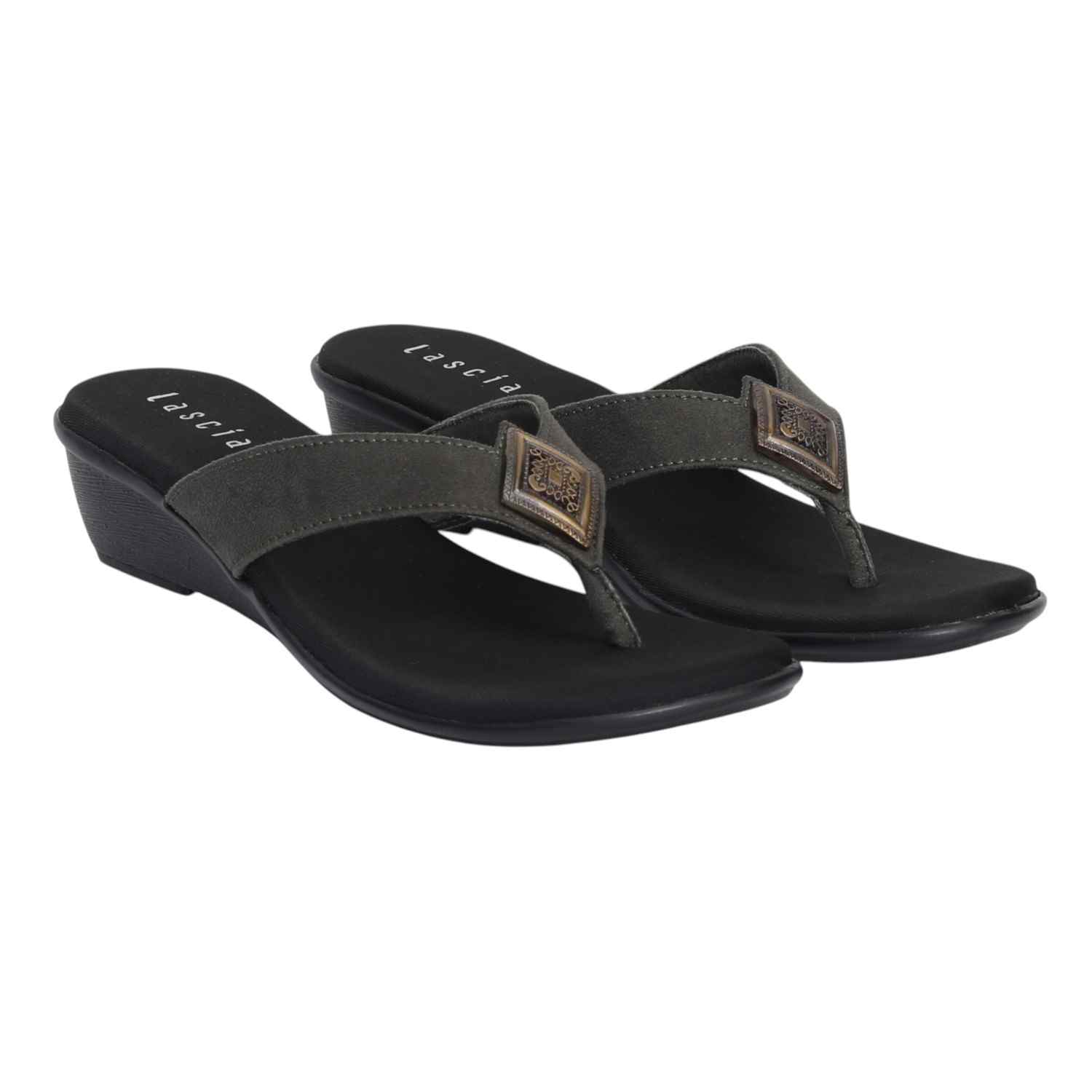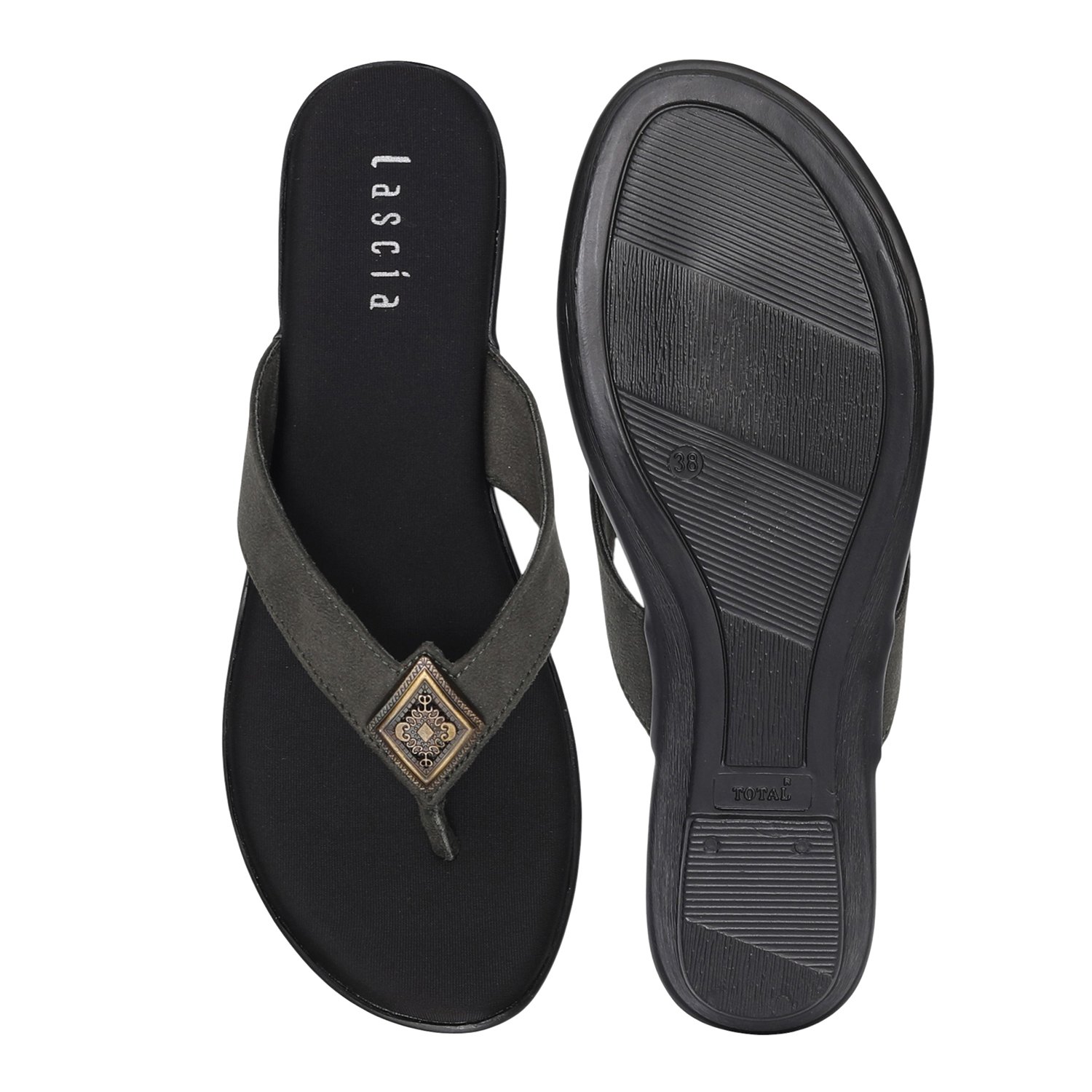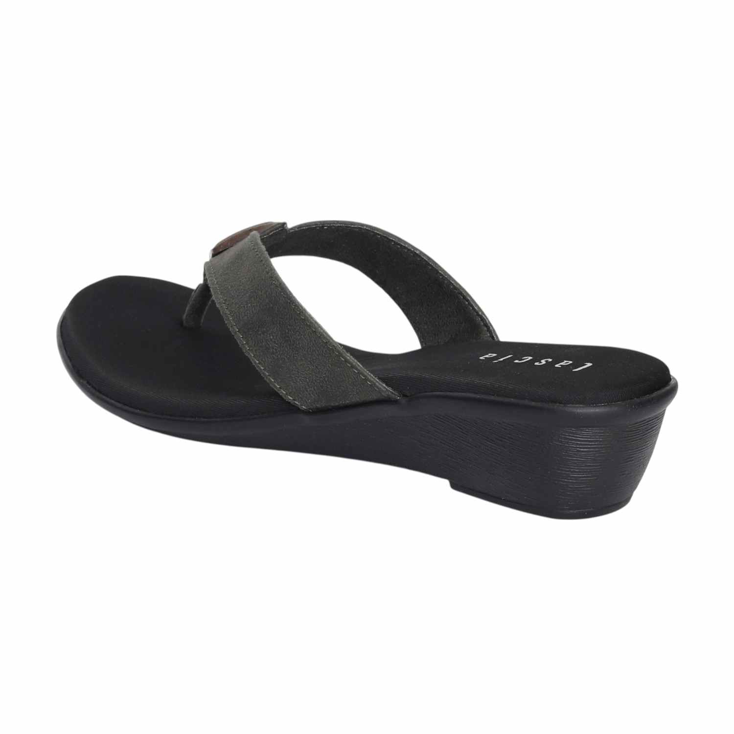 These Olive Luxe Wedge Sandals offer a sophisticated blend of natural tones and unique style. They feature a soft, olive green thong strap adorned with an elegant antique-gold metallic medallion, set on a comfortable black footbed and a contrasting black wedge sole, perfect for adding a refined touch to your everyday look.