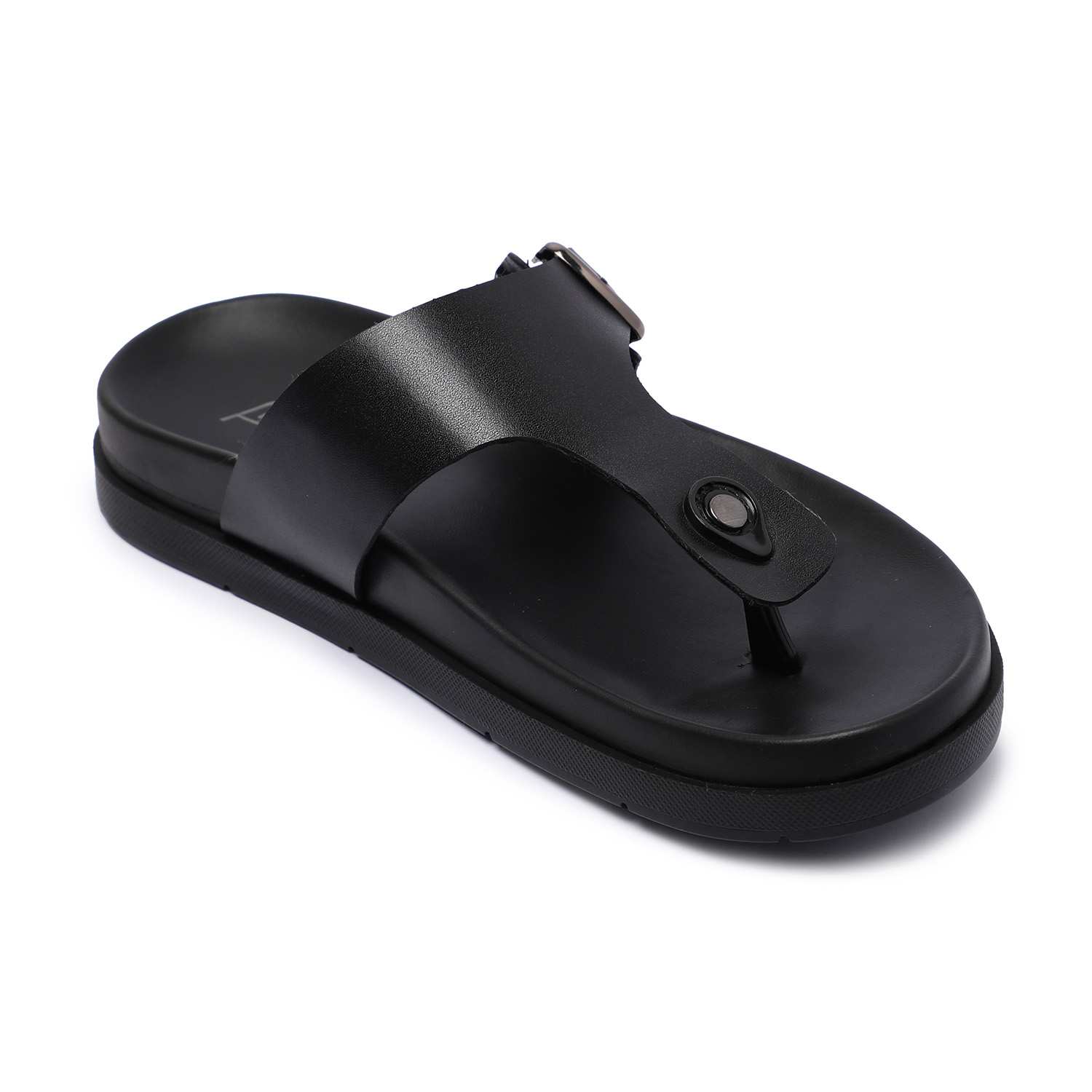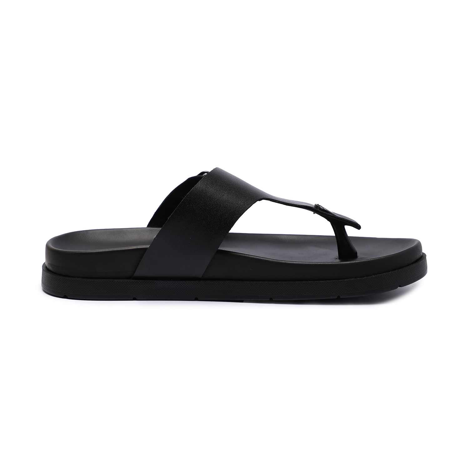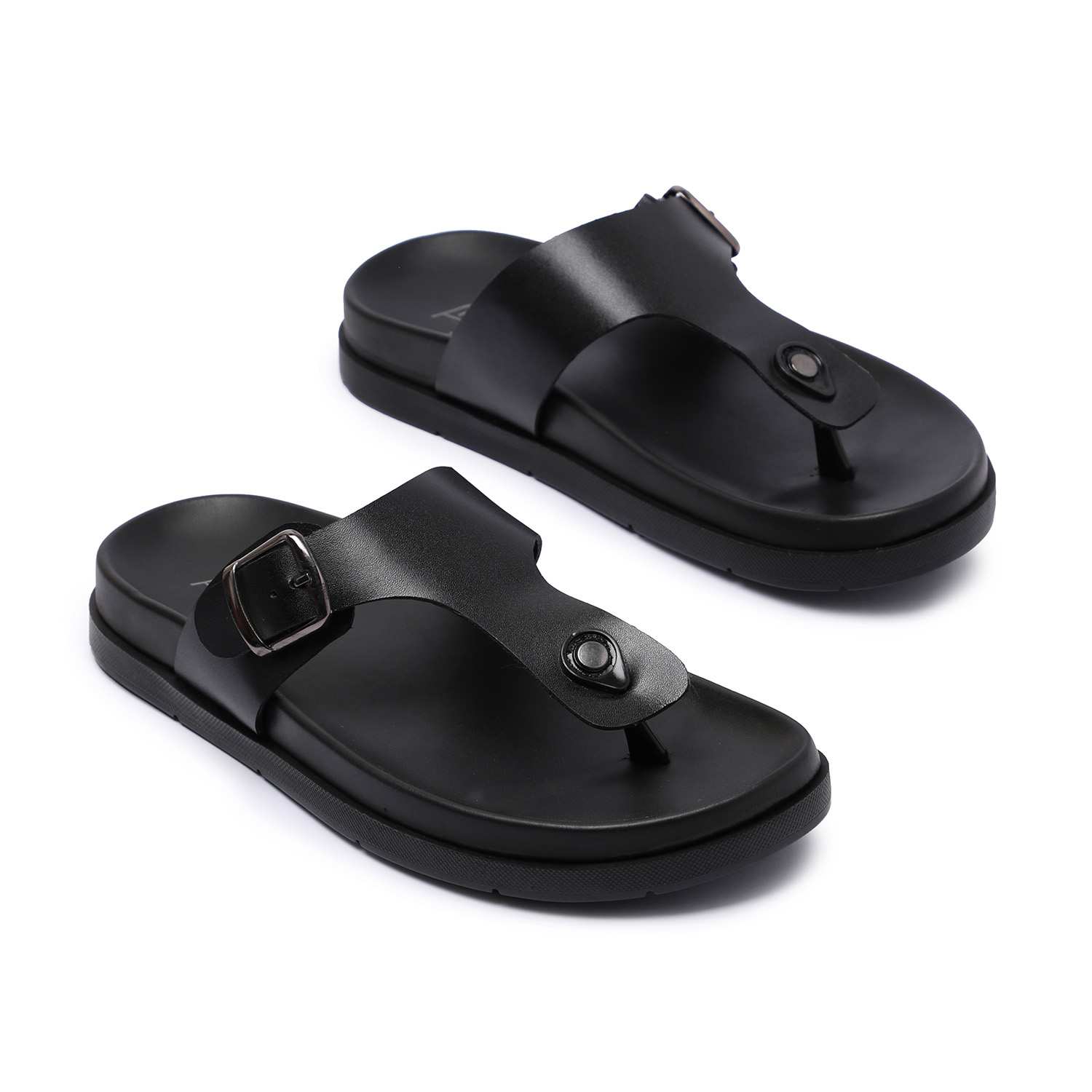 Step into everyday comfort with these men's black chappals, designed for a laid-back yet stylish look. Featuring a sturdy upper with a central toe post and a supportive buckle strap, these chappals offer a secure fit.The textured footbed enhances grip and cushioning, making them perfect for long wear.