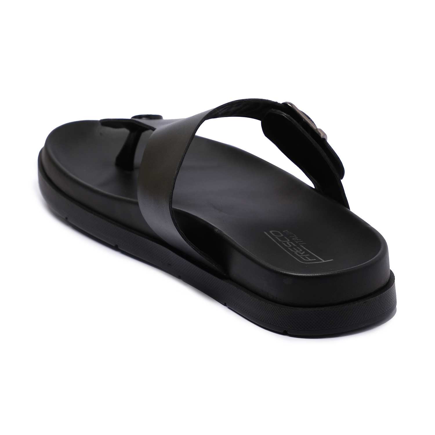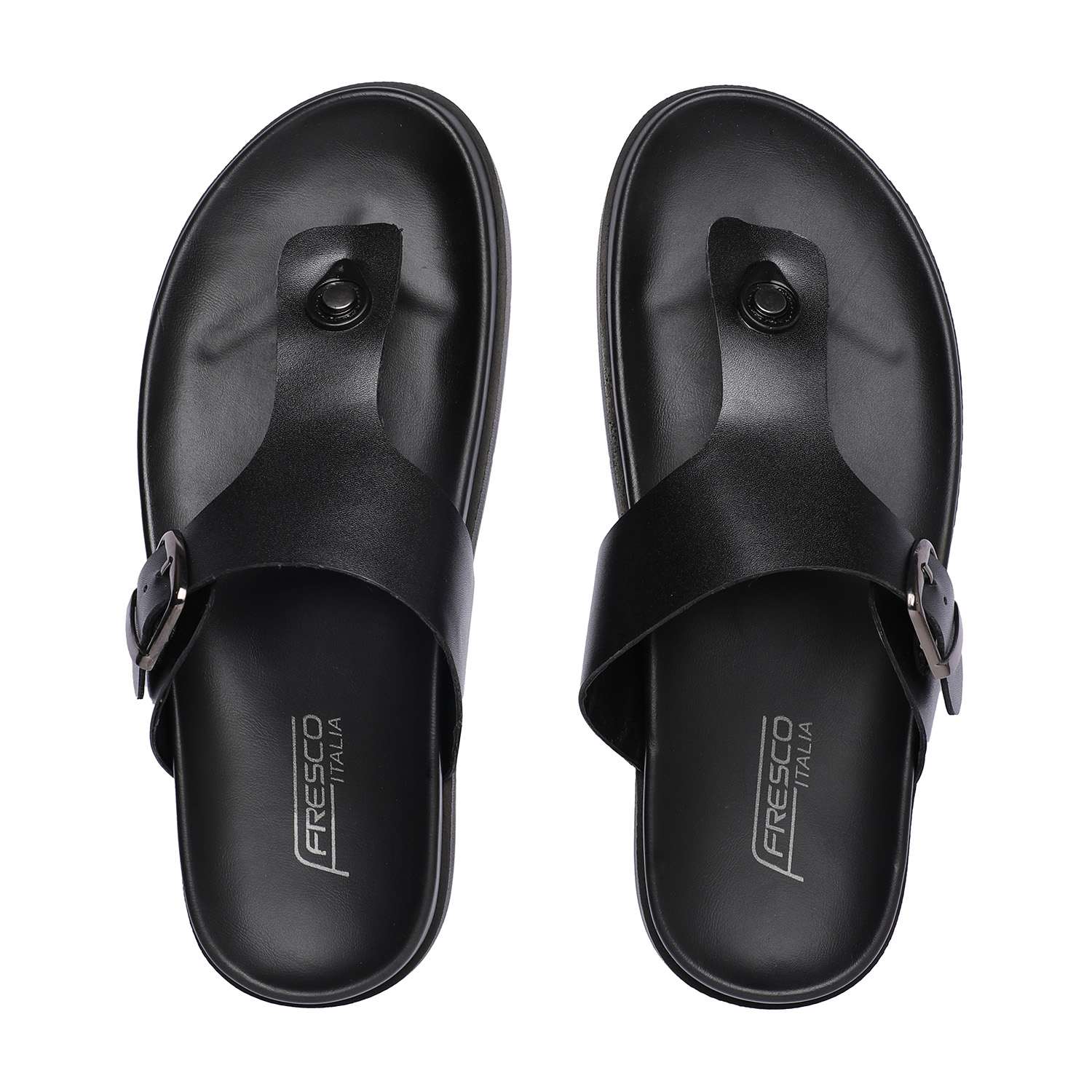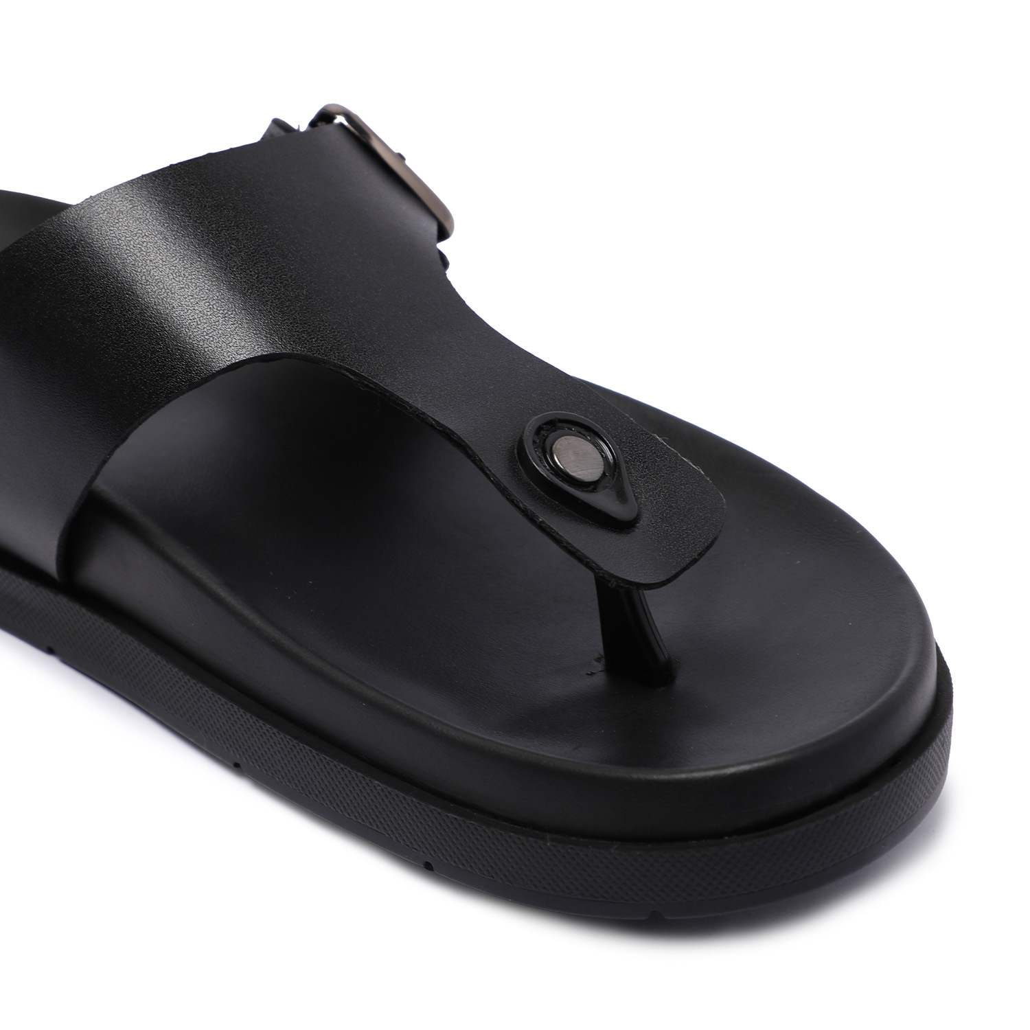Step into everyday comfort with these men's black chappals, designed for a laid-back yet stylish look. Featuring a sturdy upper with a central toe post and a supportive buckle strap, these chappals offer a secure fit.The textured footbed enhances grip and cushioning, making them perfect for long wear.