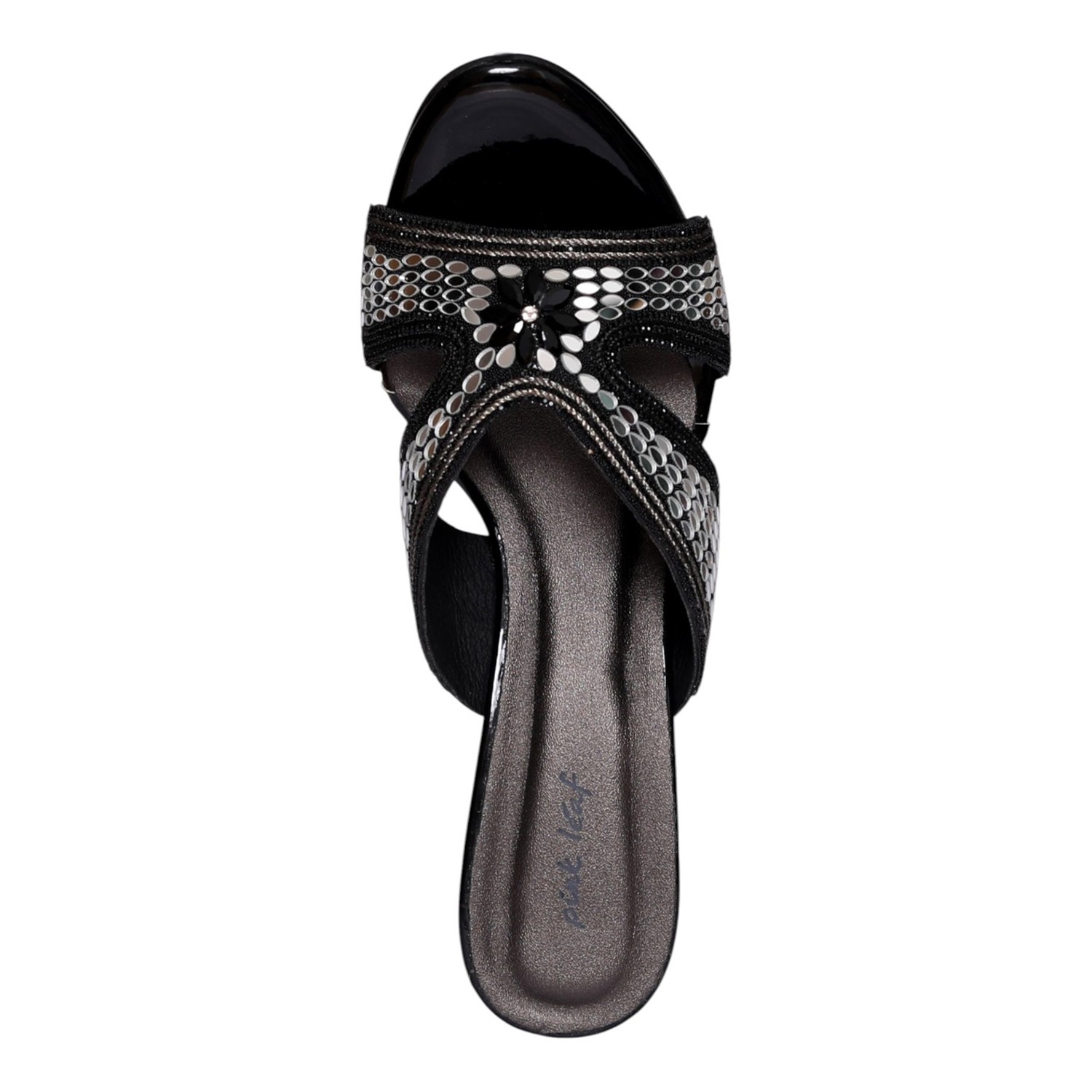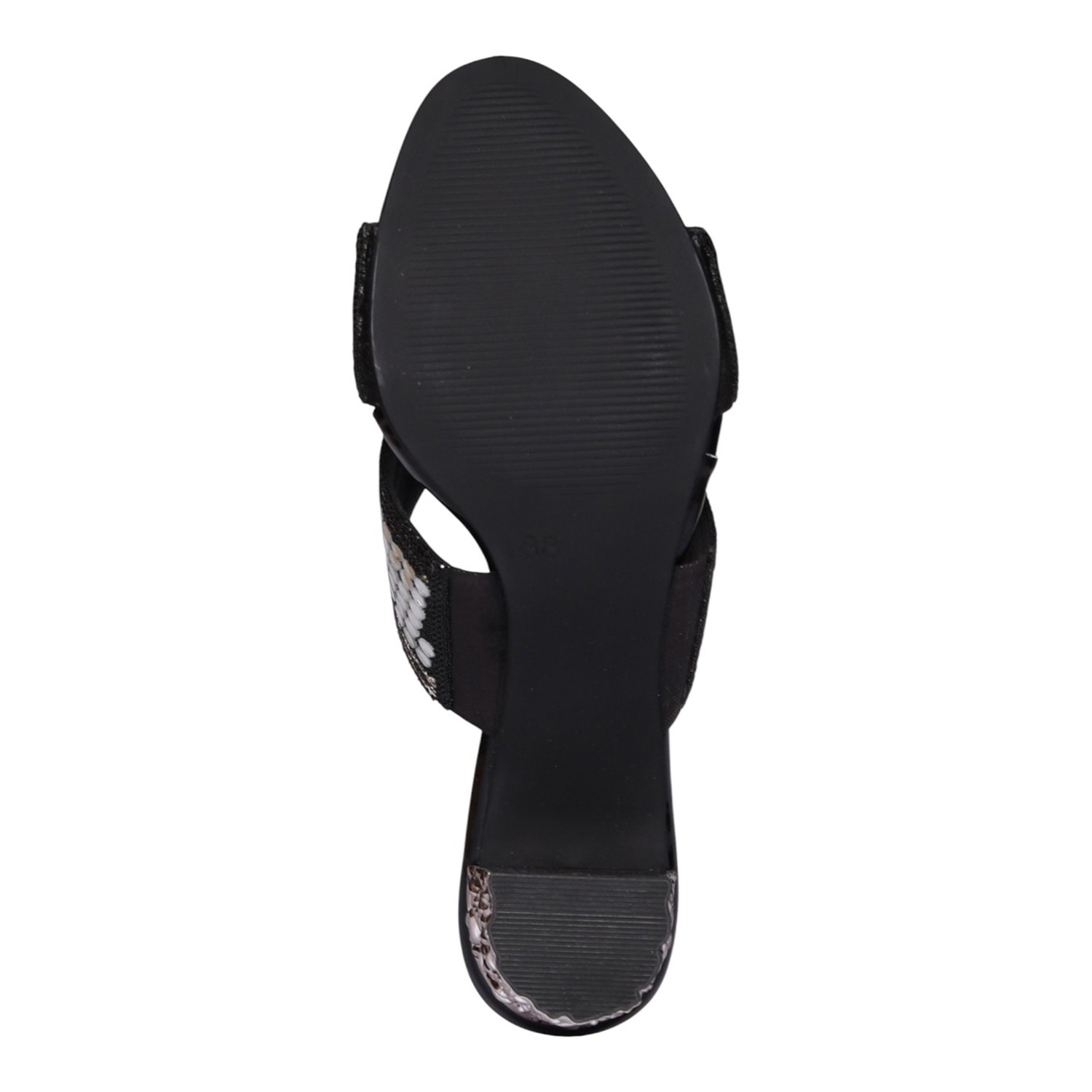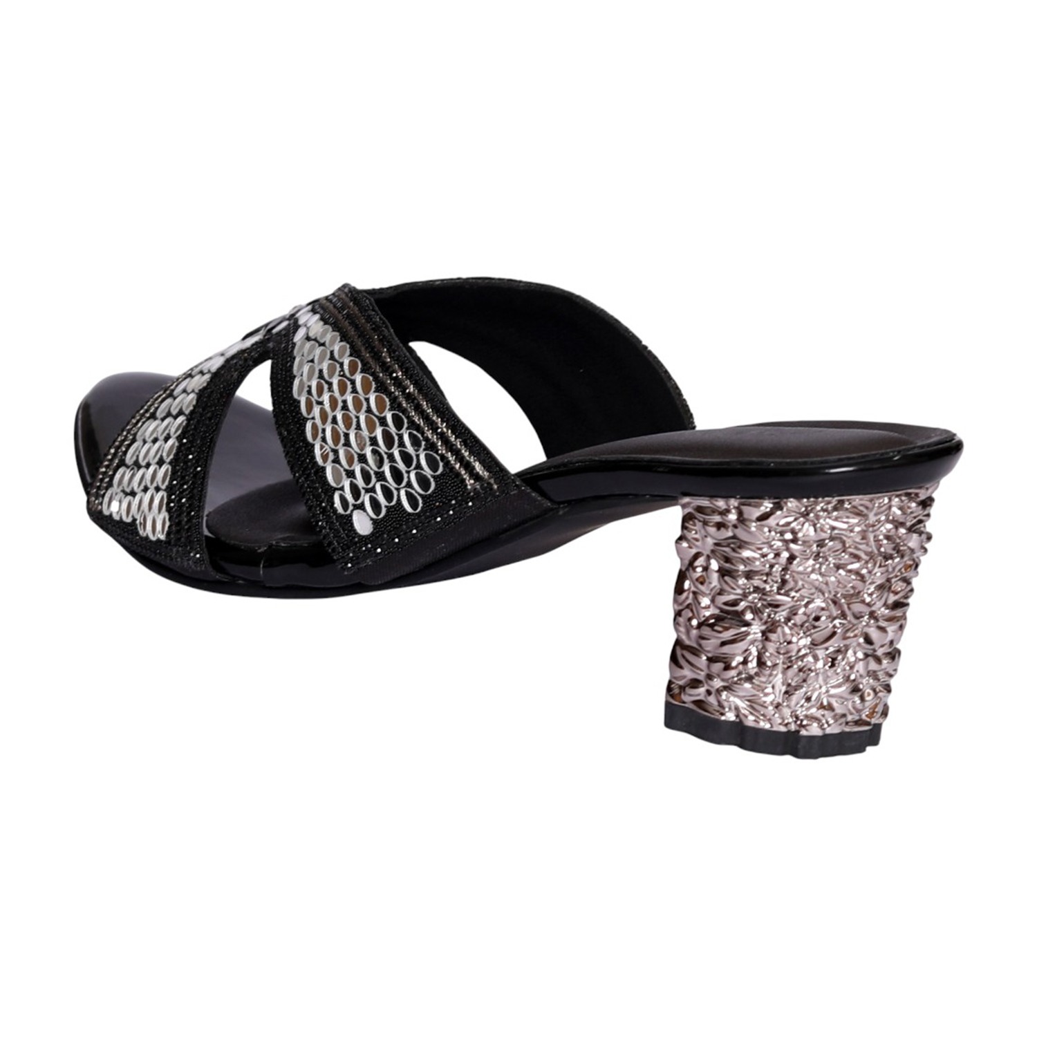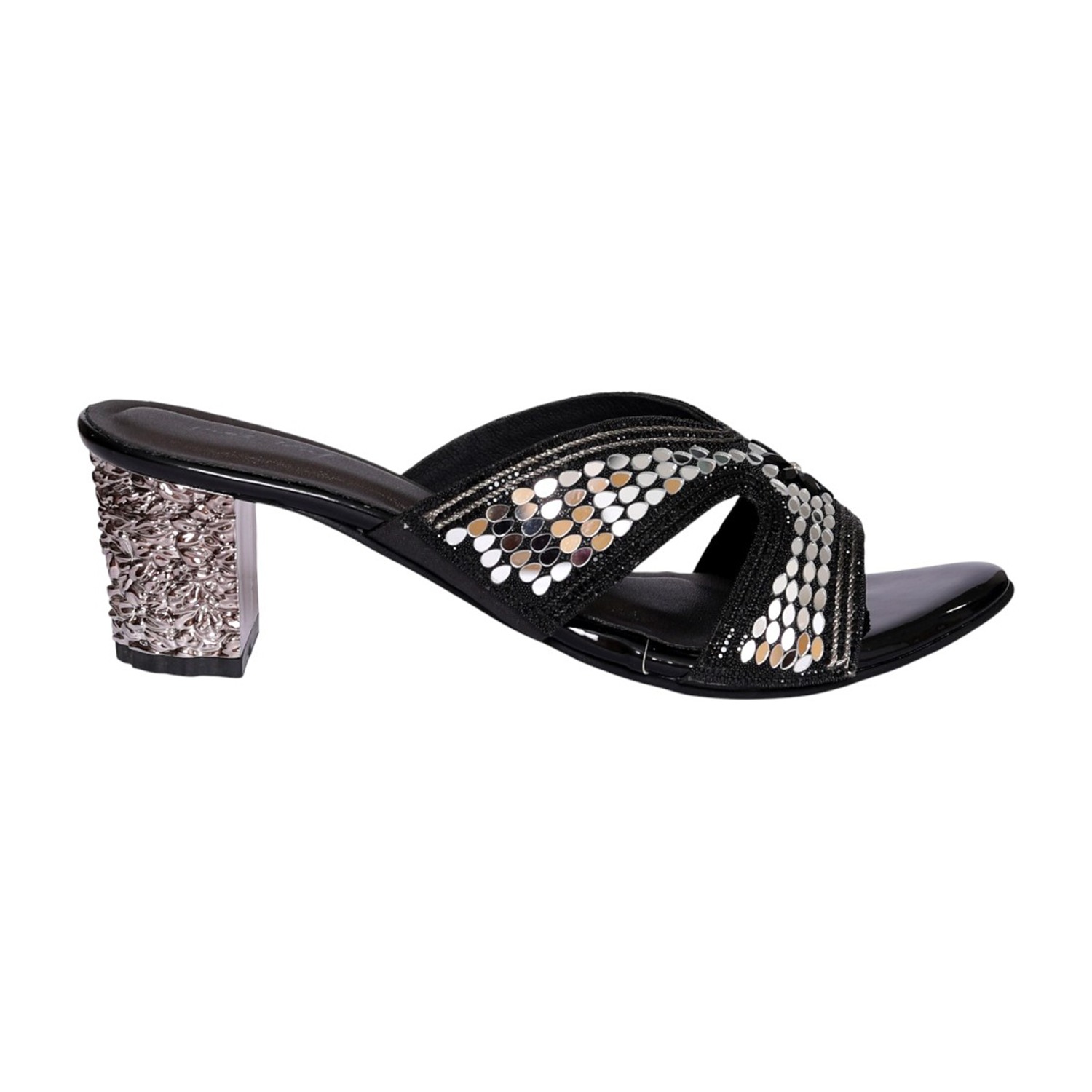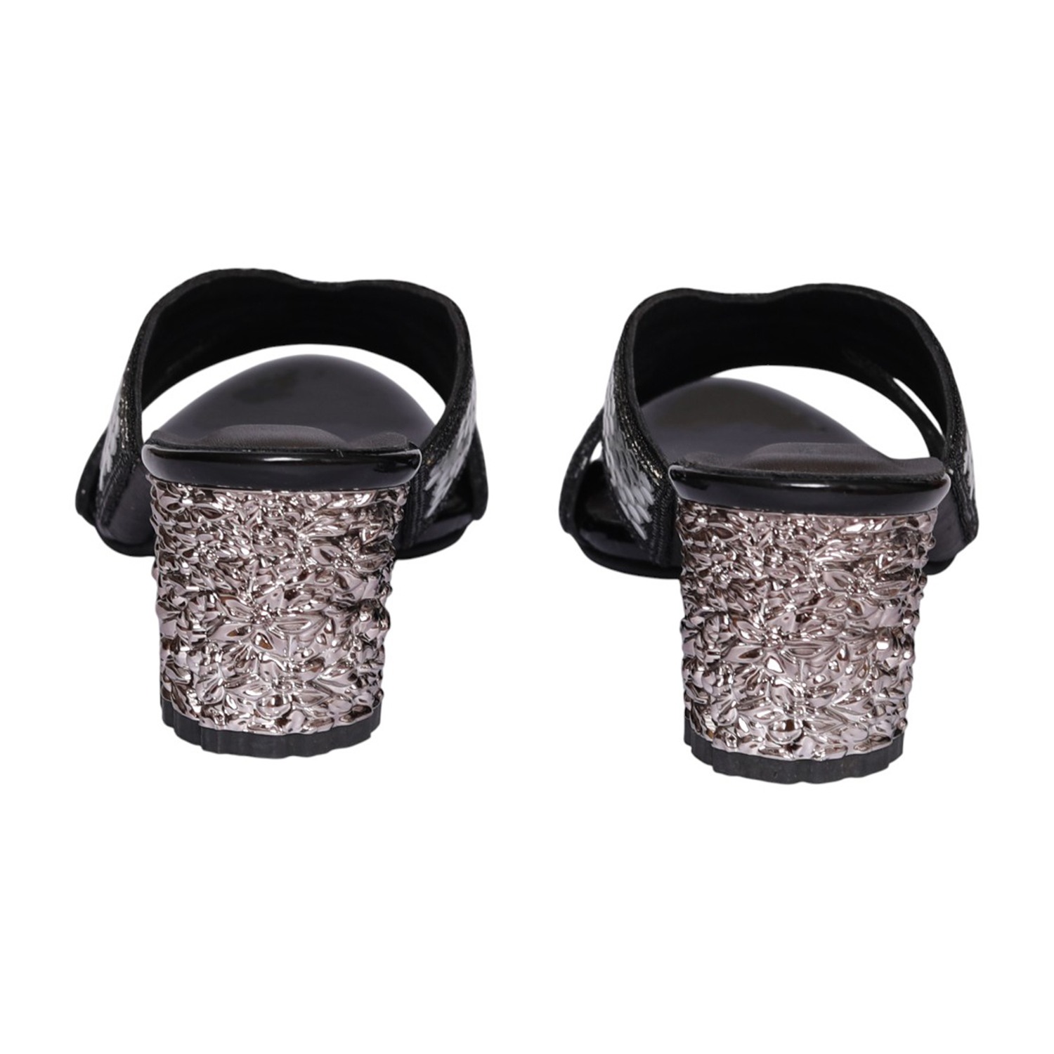 Add a touch of sophistication to your wardrobe with these stunning black mule sandals. Featuring intricately designed cross straps adorned with metallic accents and subtle sparkle, these heels offer a perfect balance of elegance and modern style. The sturdy block heel with a textured metallic finish ensures stability and comfort, making them ideal for evening wear, parties, or special occasions.