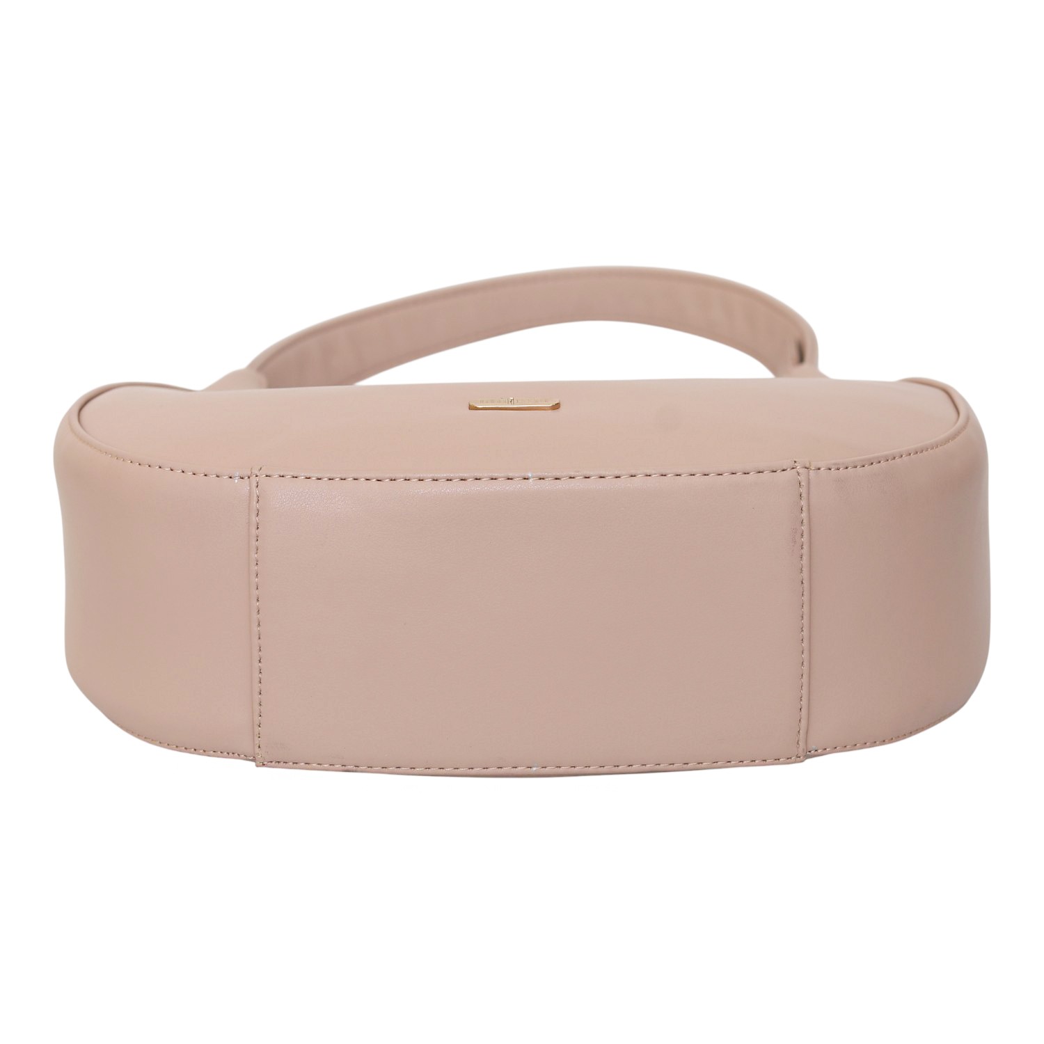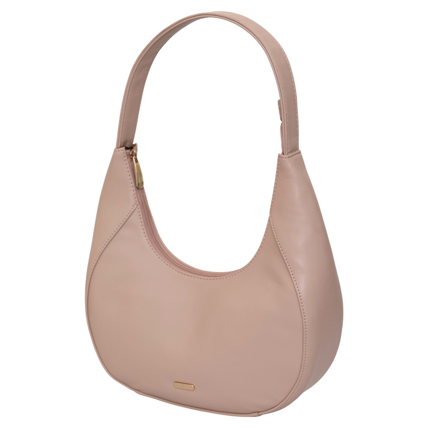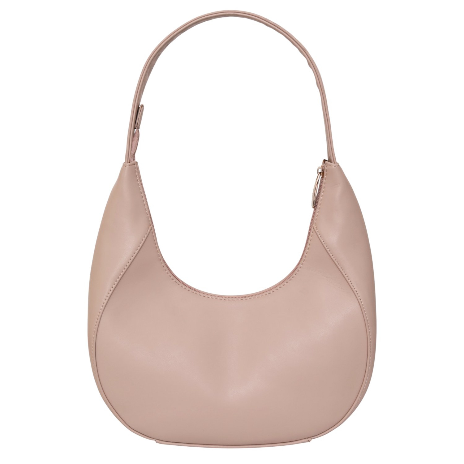 This elegant crescent-shaped shoulder bag blends soft blush tones with a sleek, modern silhouette. Crafted from smooth vegan leather, it sits comfortably under the arm and adds a refined touch to both casual and dressed-up looks. A secure top zipper opens to a neatly organized interior, making it a stylish yet practical choice for everyday use.