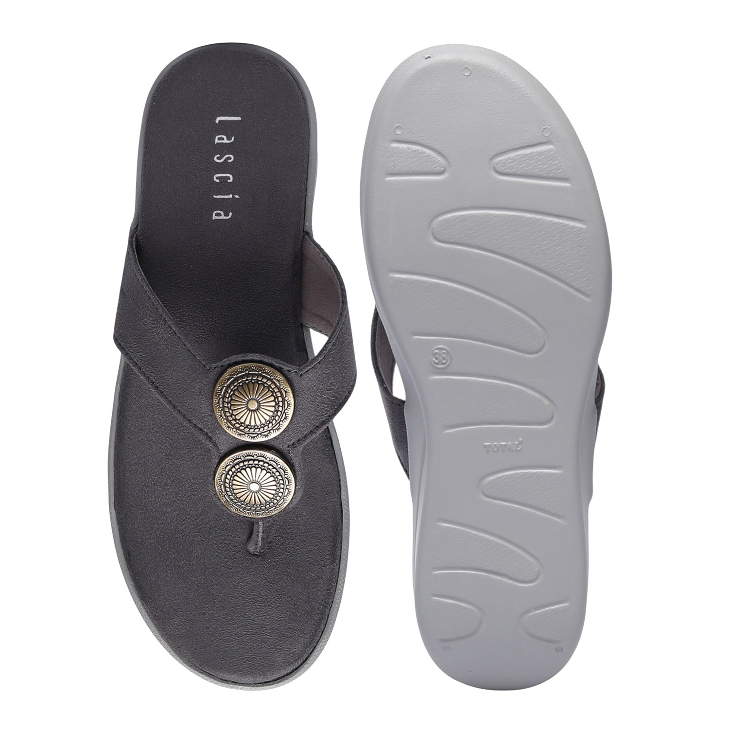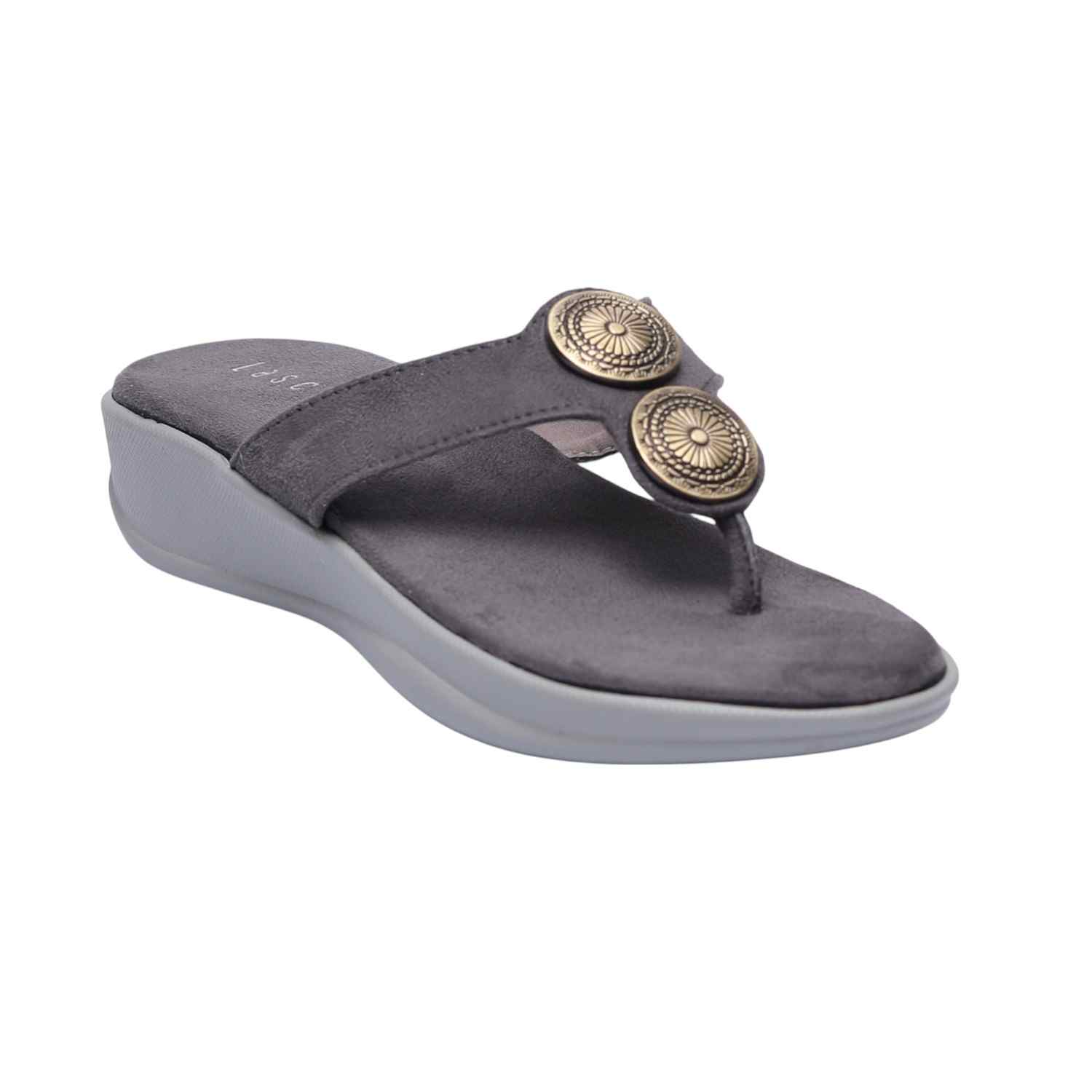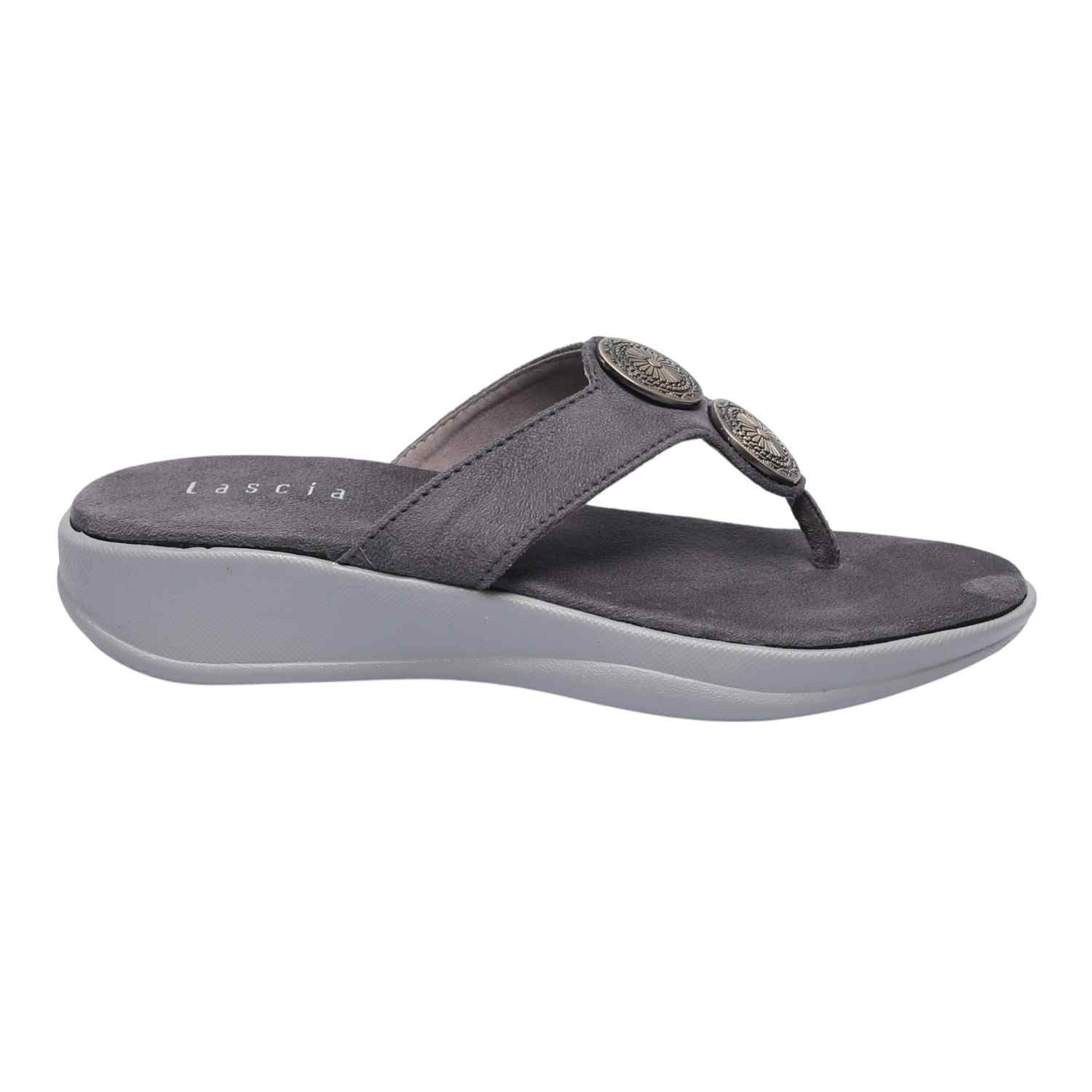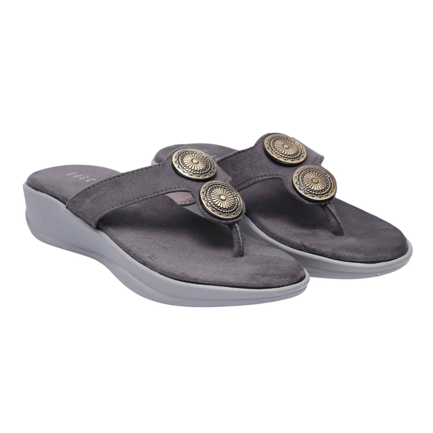 Infuse your ensemble with a touch of bohemian chic and modern comfort with these Grey metallic detail thongs. Their stylish metallic disc embellishments make them an ideal choice for adding understated glamour to any outfit, from daytime errands to relaxed evening gatherings, ensuring both flair and ease