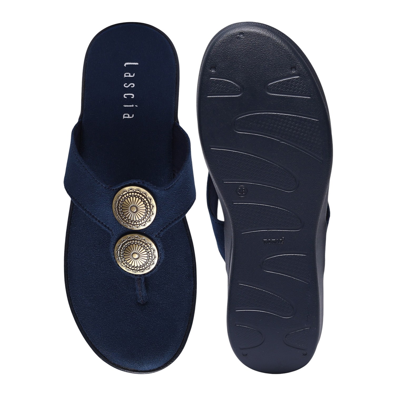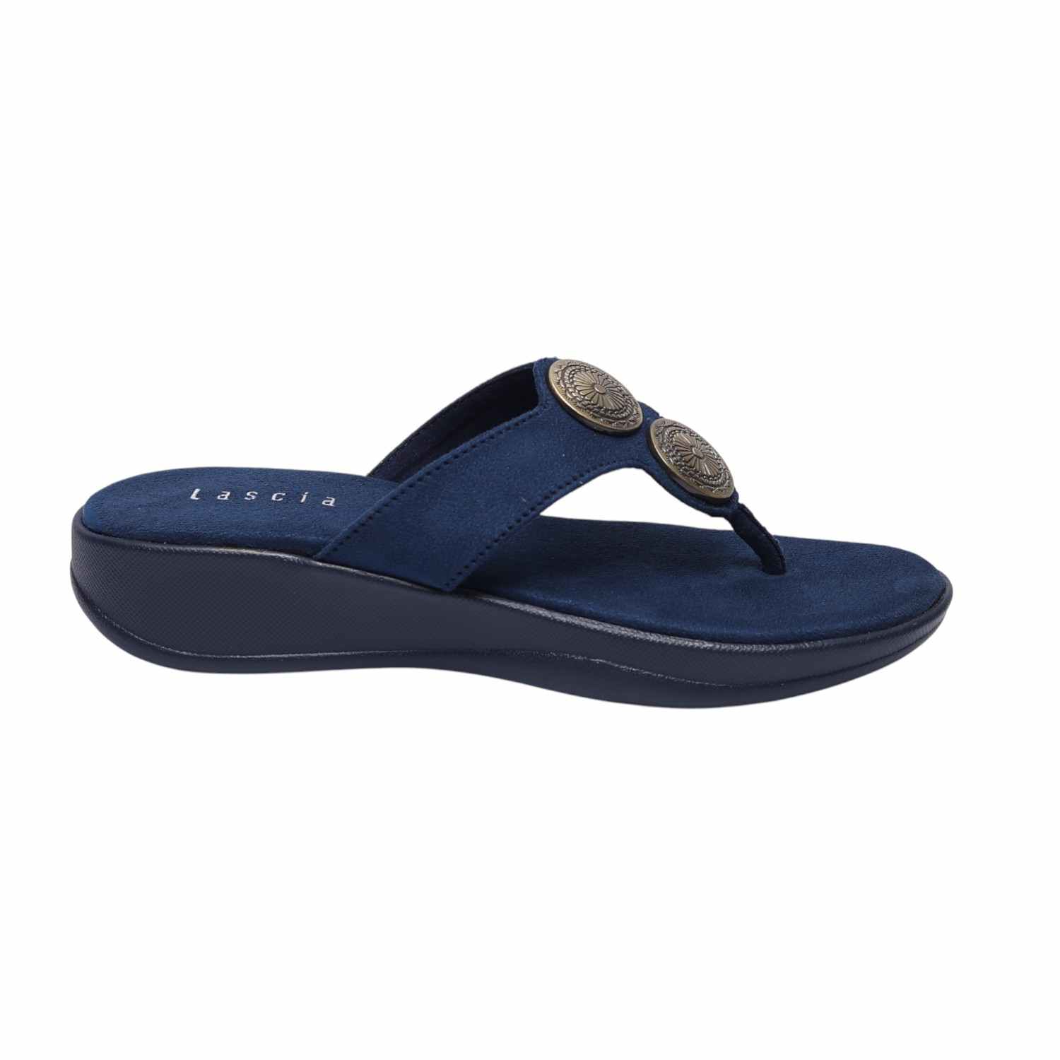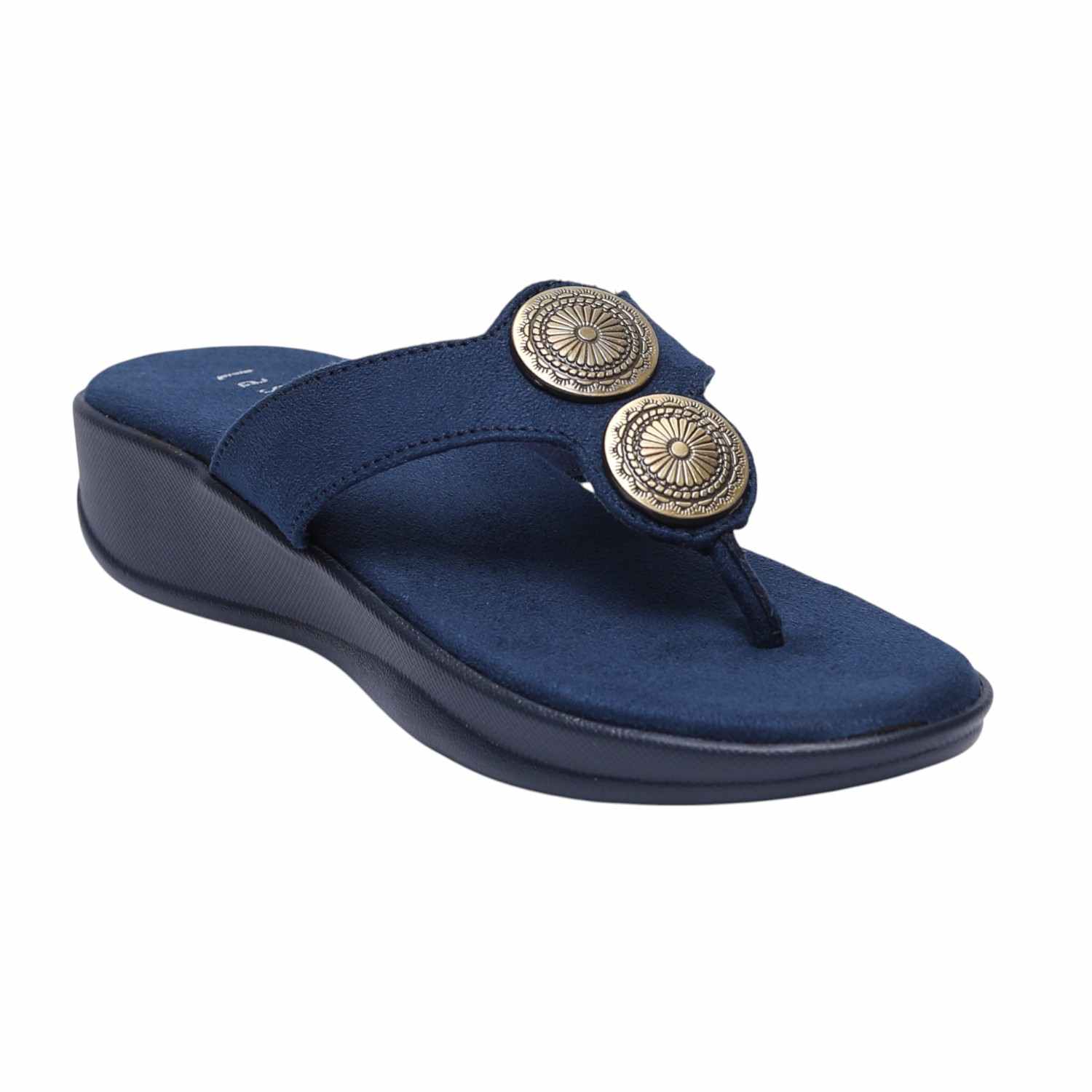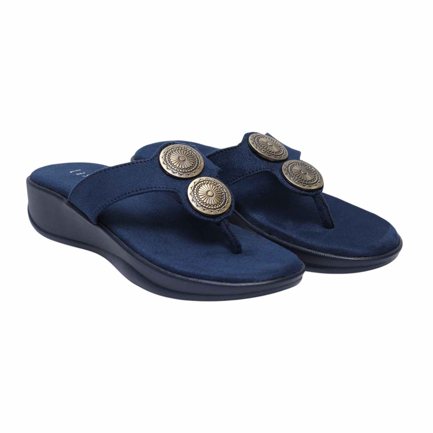 Infuse your ensemble with a touch of bohemian chic and modern comfort with these Blue metallic detail thongs. Their stylish metallic disc embellishments make them an ideal choice for adding understated glamour to any outfit, from daytime errands to relaxed evening gatherings, ensuring both flair and ease