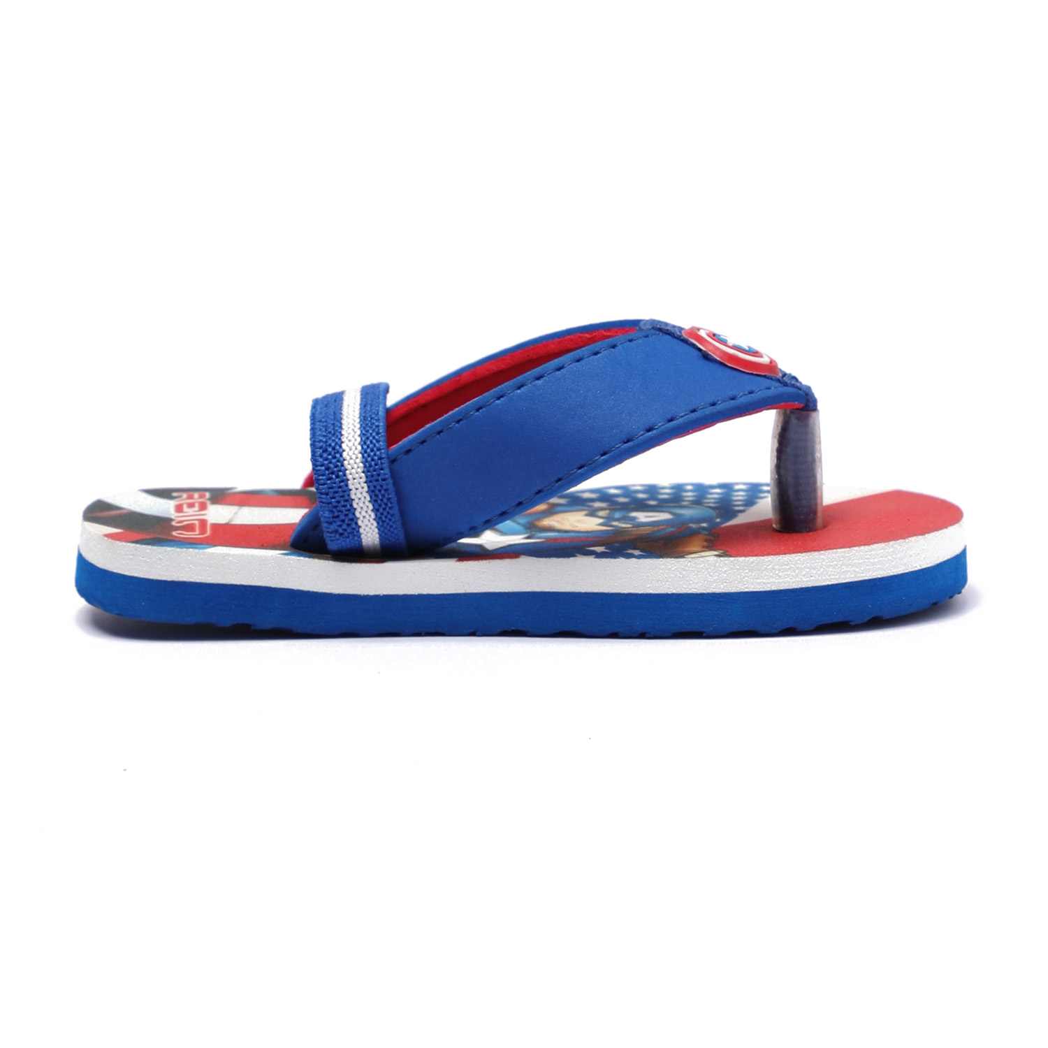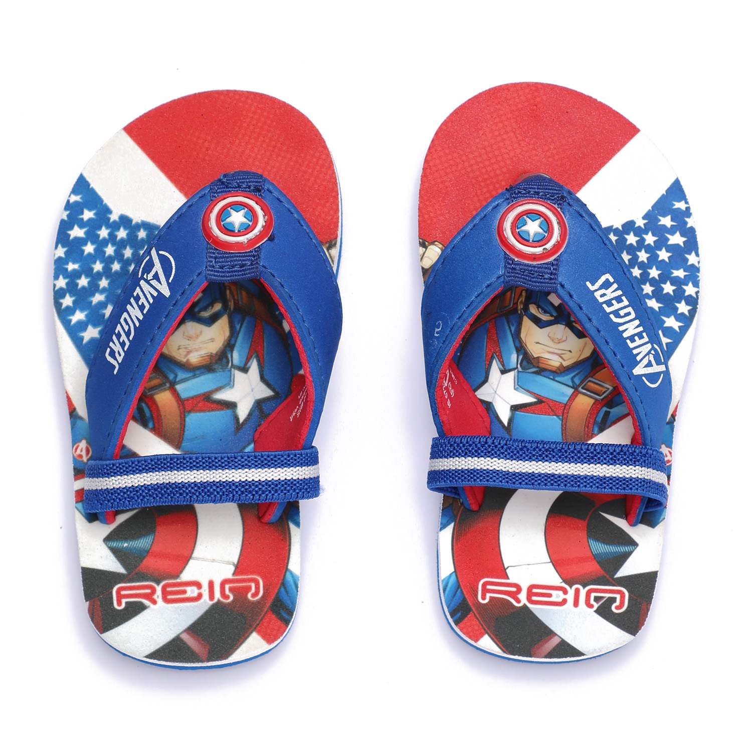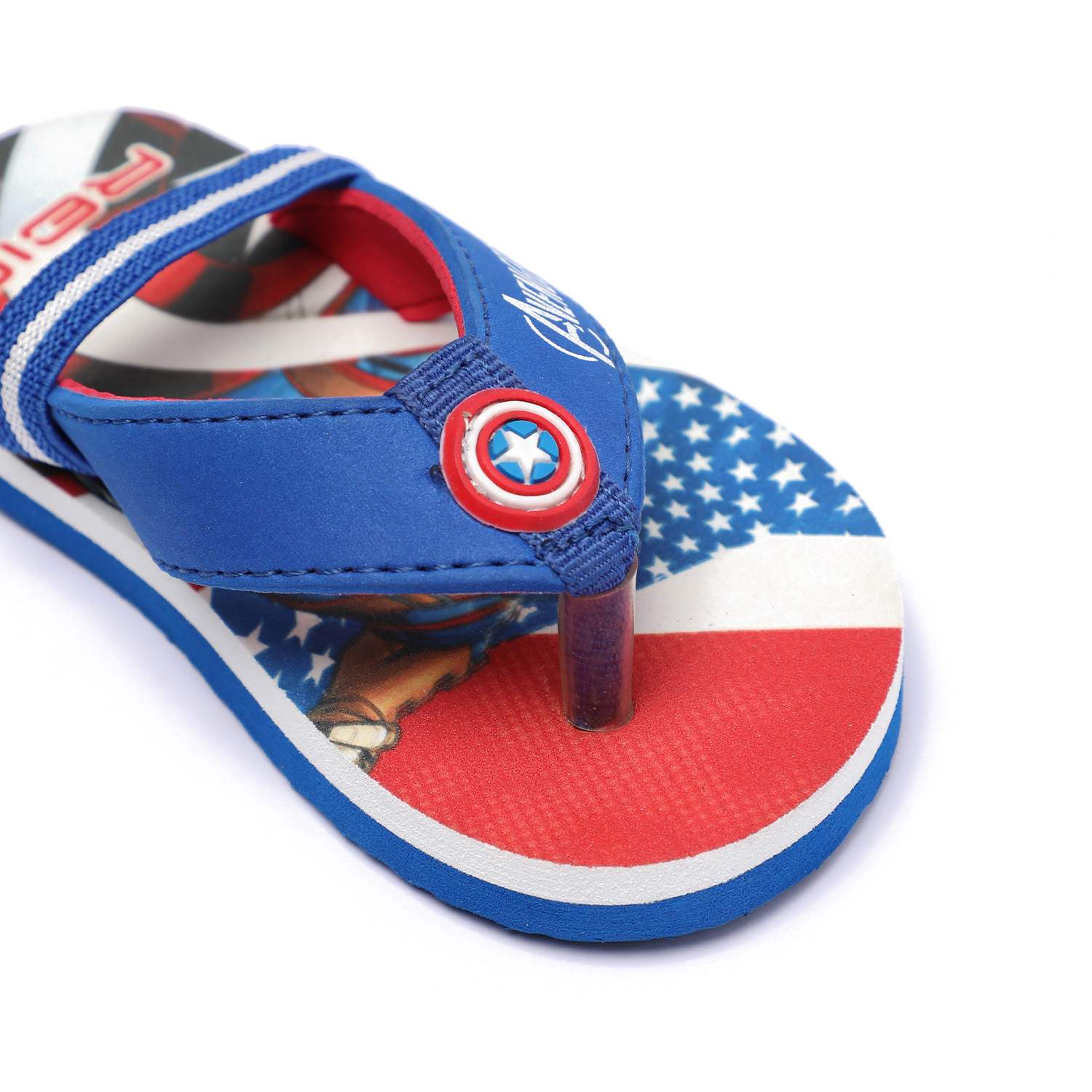 Unleash superhero vibes with these awesome Captain America flip flops for kids! Designed in bold red, white, and blue, these flip flops feature a vibrant Avengers graphic and signature shield detail on the strap. Made with a soft and durable sole, they offer comfort for all-day play while adding a heroic flair to your child's outfit.