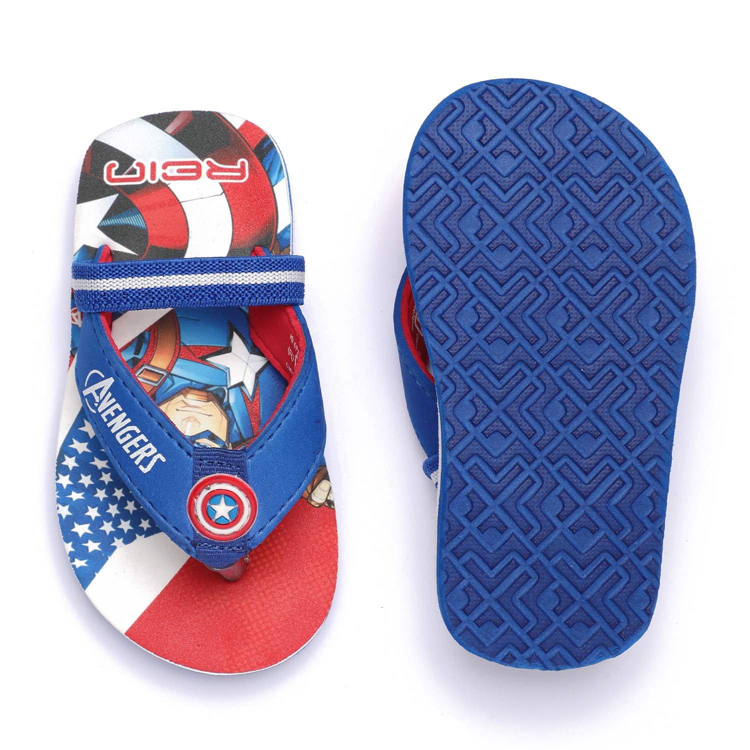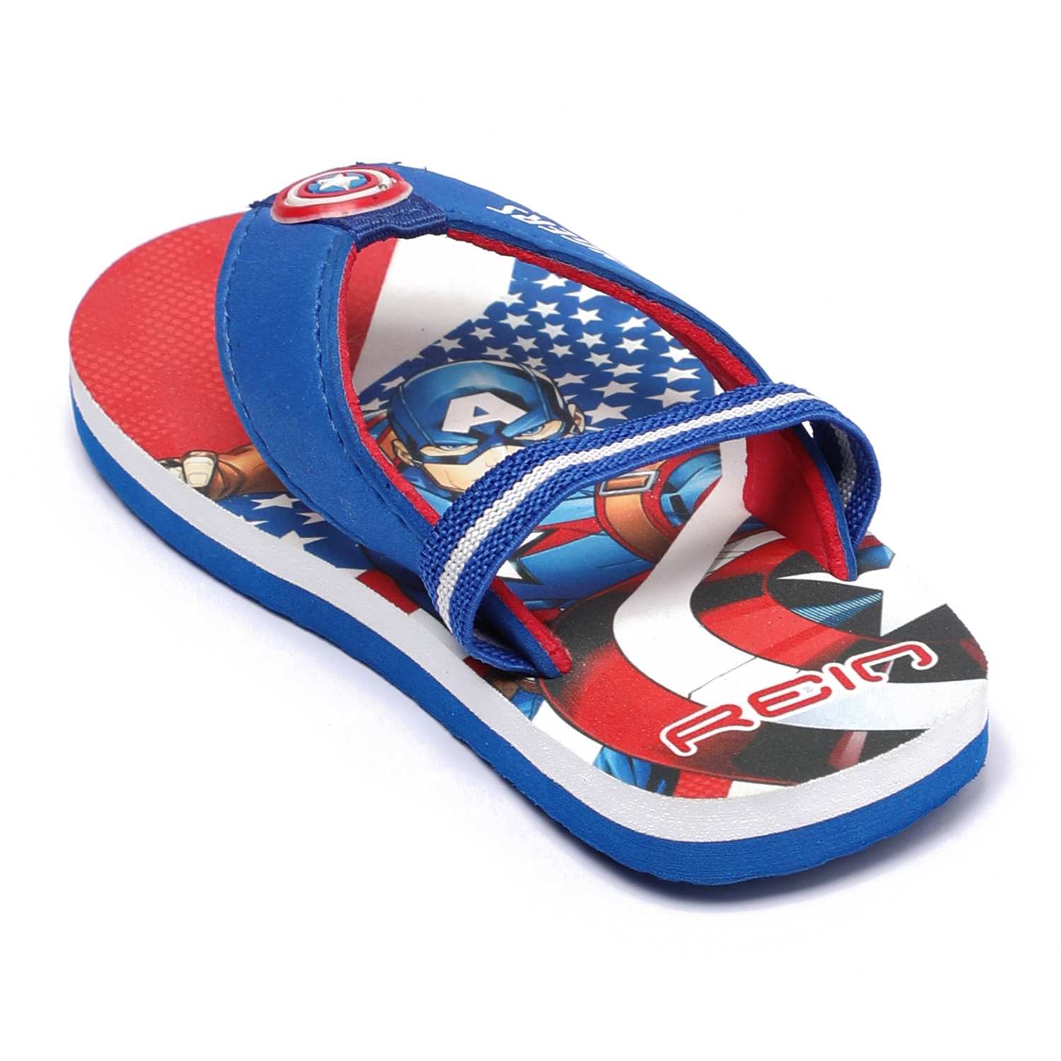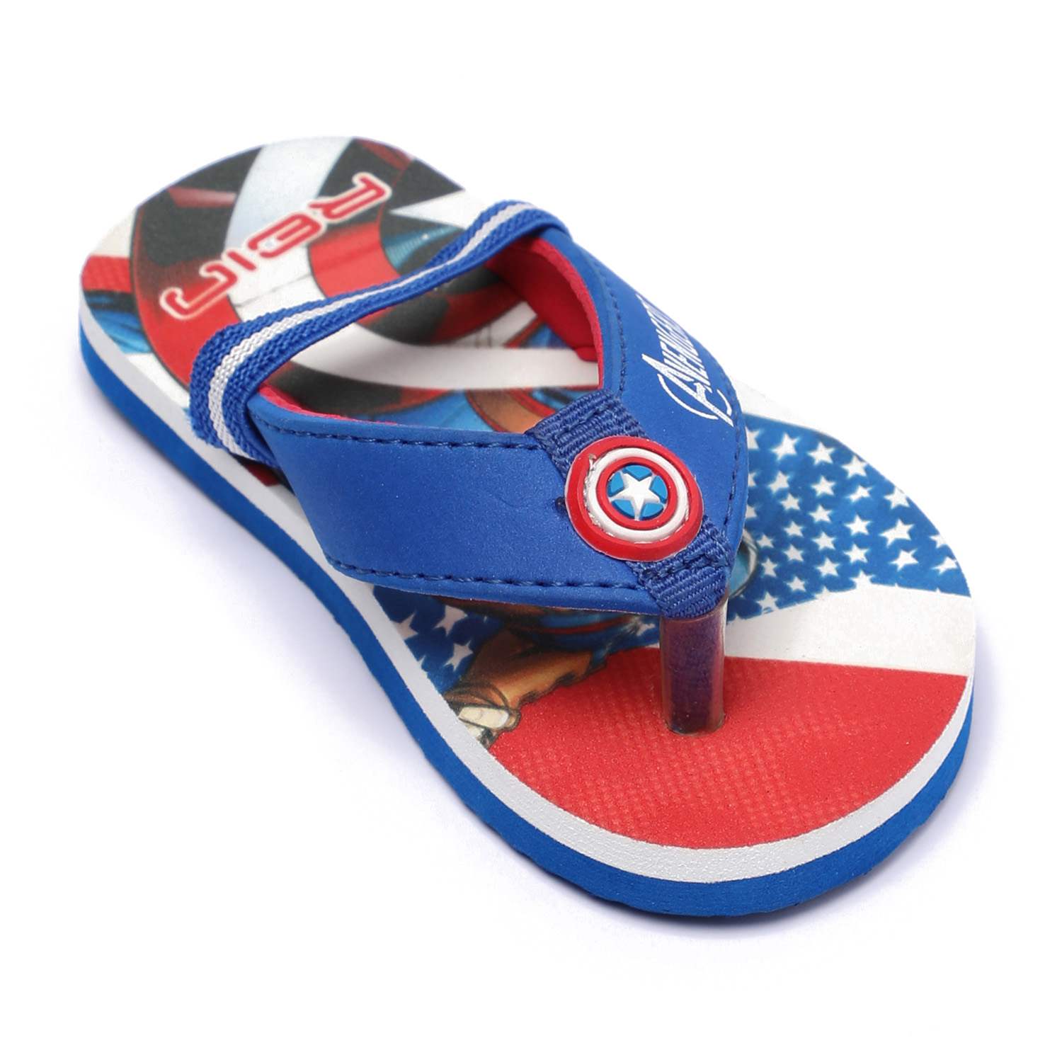 Unleash superhero vibes with these awesome Captain America flip flops for kids! Designed in bold red, white, and blue, these flip flops feature a vibrant Avengers graphic and signature shield detail on the strap. Made with a soft and durable sole, they offer comfort for all-day play while adding a heroic flair to your child's outfit.
