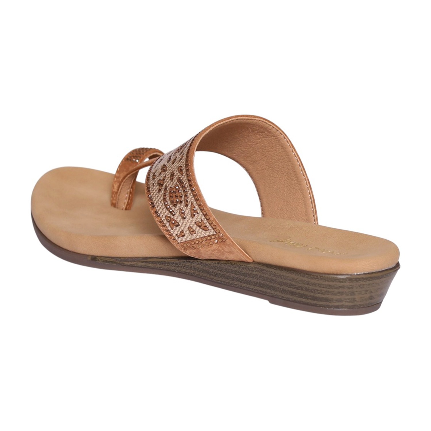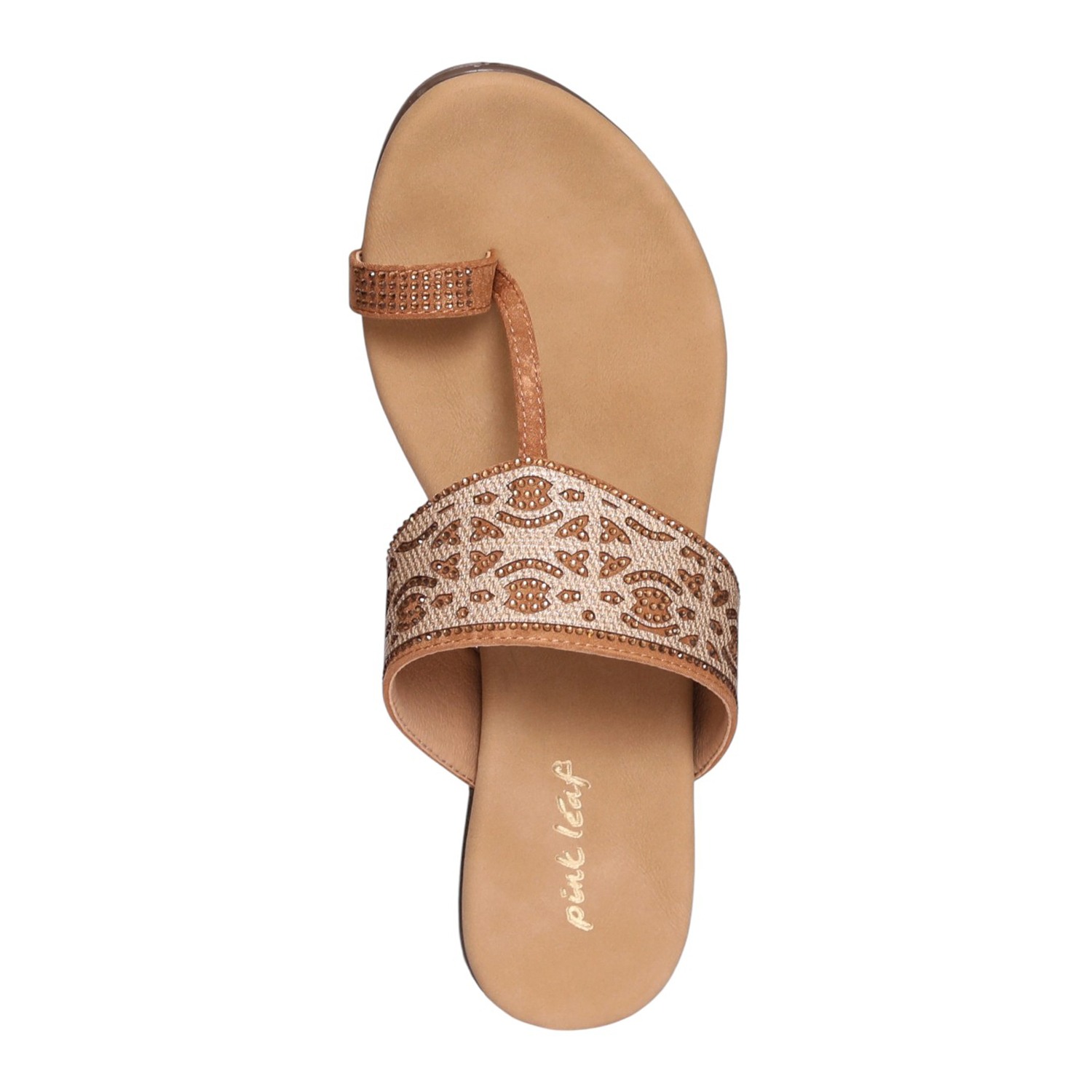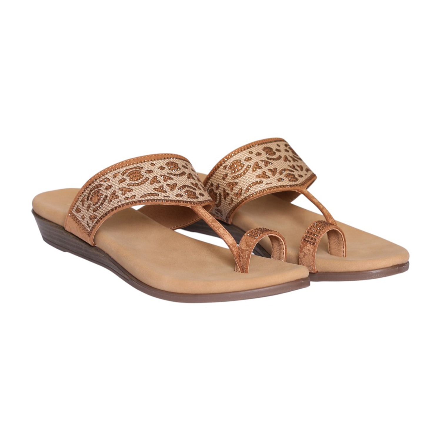 This elegant toe-ring slip-on sandal is designed to offer a secure yet stylish fit, featuring a beautifully crafted embellished upper strap with intricate patterns that add a sophisticated touch. The rich tan/antique finish complements both casual and ethnic outfits effortlessly, making it a versatile addition to your wardrobe. With a soft cushioned footbed for enhanced all-day comfort and a lightweight sole that ensures easy, effortless movement, this sandal is perfect for everyday use. The minimal heel provides subtle elevation and stability, making it ideal for daily wear, casual outings, and festive occasions.