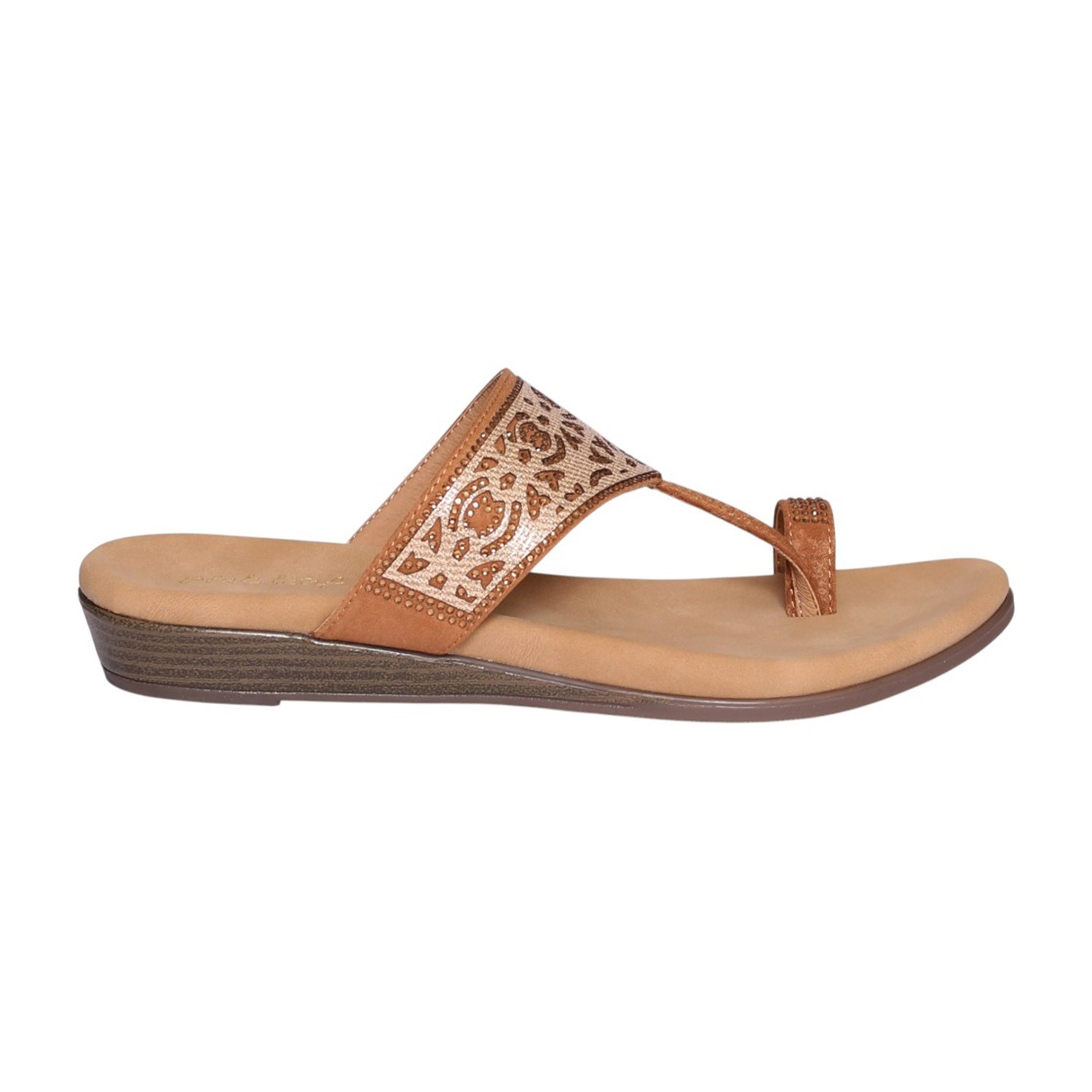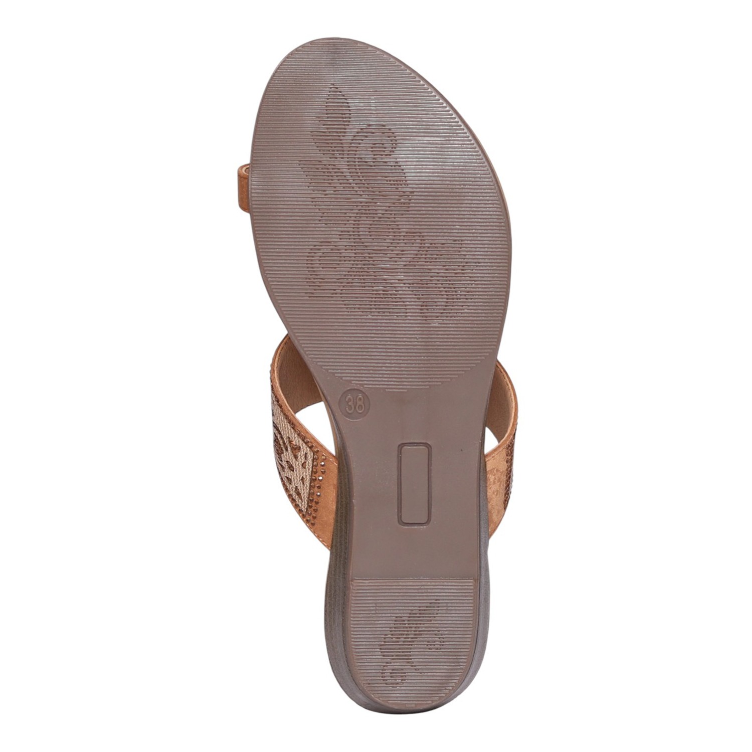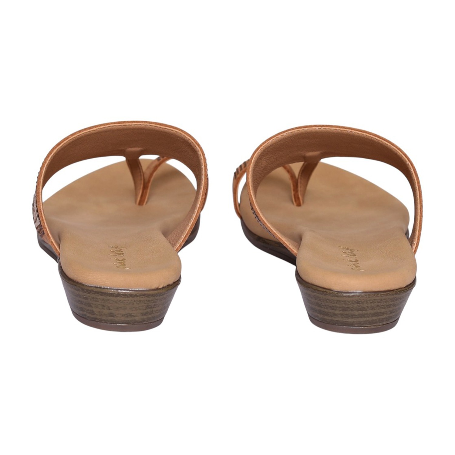 This elegant toe-ring slip-on sandal is designed to offer a secure yet stylish fit, featuring a beautifully crafted embellished upper strap with intricate patterns that add a sophisticated touch. The rich tan/antique finish complements both casual and ethnic outfits effortlessly, making it a versatile addition to your wardrobe. With a soft cushioned footbed for enhanced all-day comfort and a lightweight sole that ensures easy, effortless movement, this sandal is perfect for everyday use. The minimal heel provides subtle elevation and stability, making it ideal for daily wear, casual outings, and festive occasions.