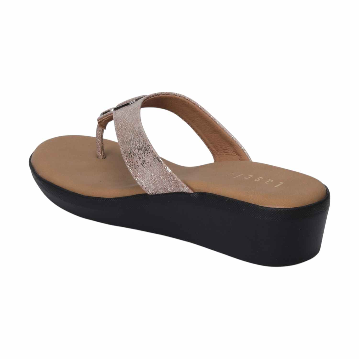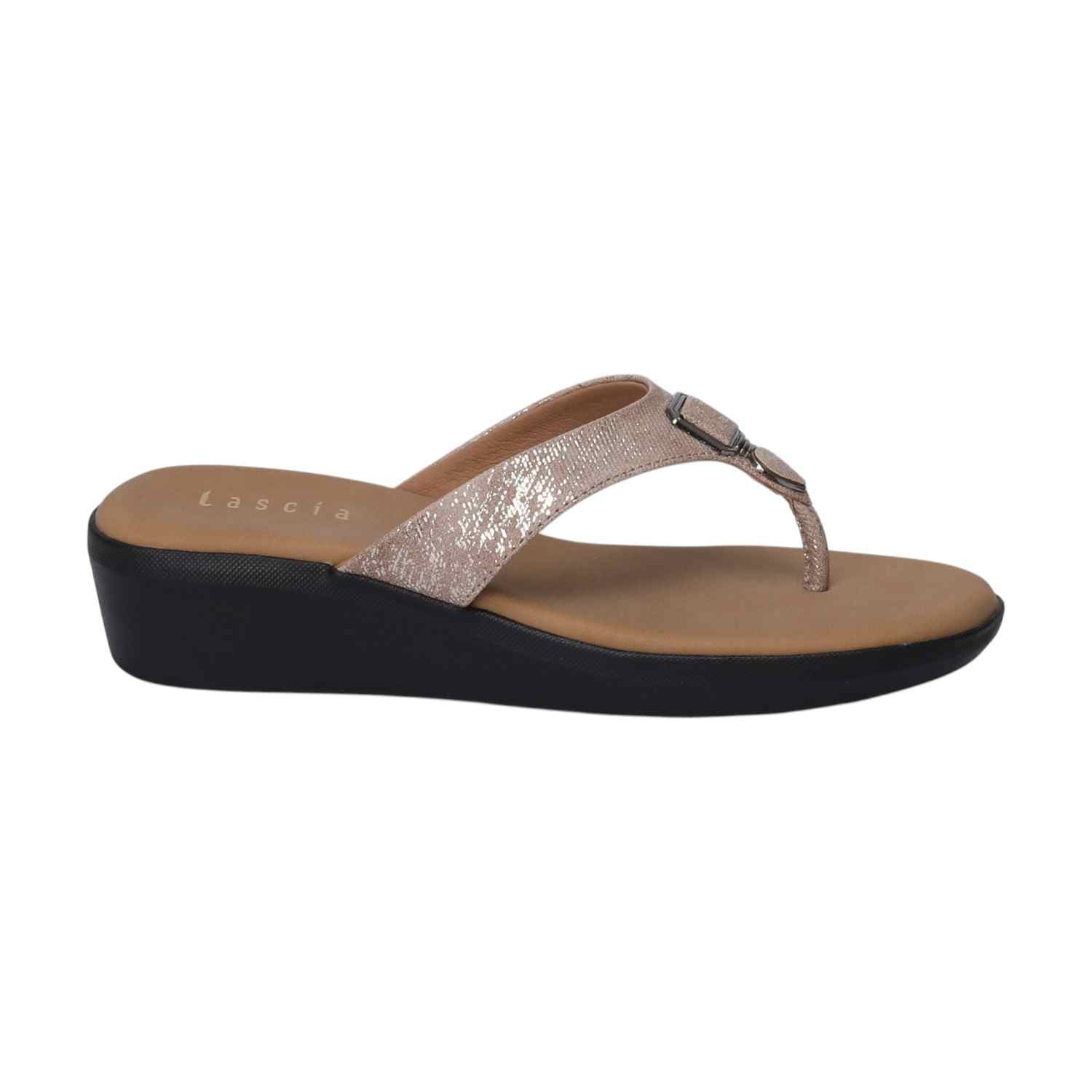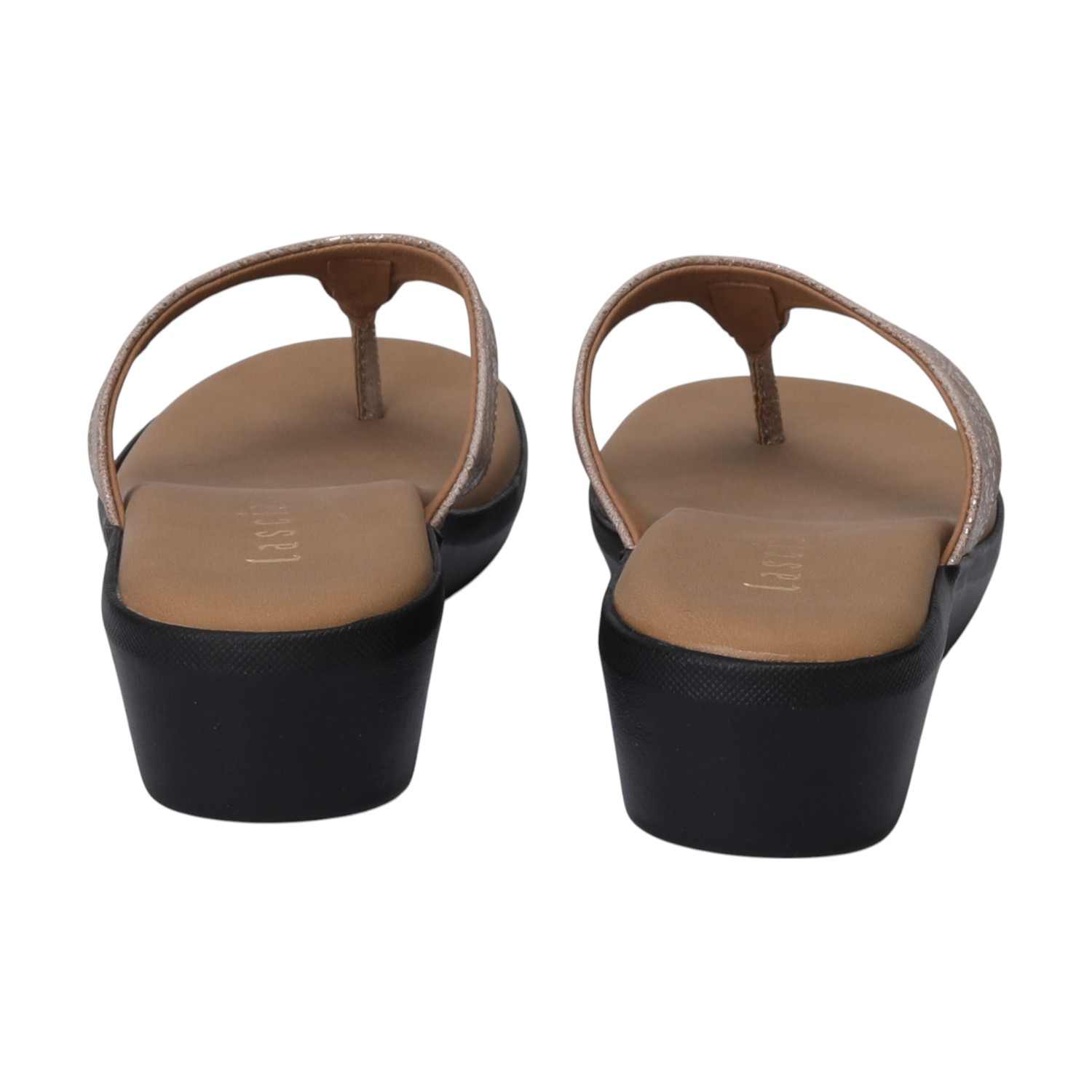 This Women Beige Wedge Flip-Flop offers a delicate blend of charm and comfortable elevation. It features a soft, Beige-toned thong strap with a subtle textured, possibly shimmering finish and a sleek metallic embellishment, set on a comfortable matching footbed and a contrasting black wedge sole, perfect for versatile daily wear.