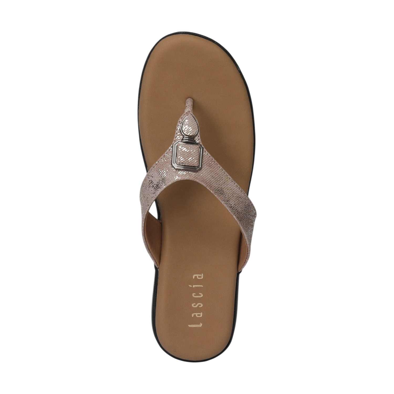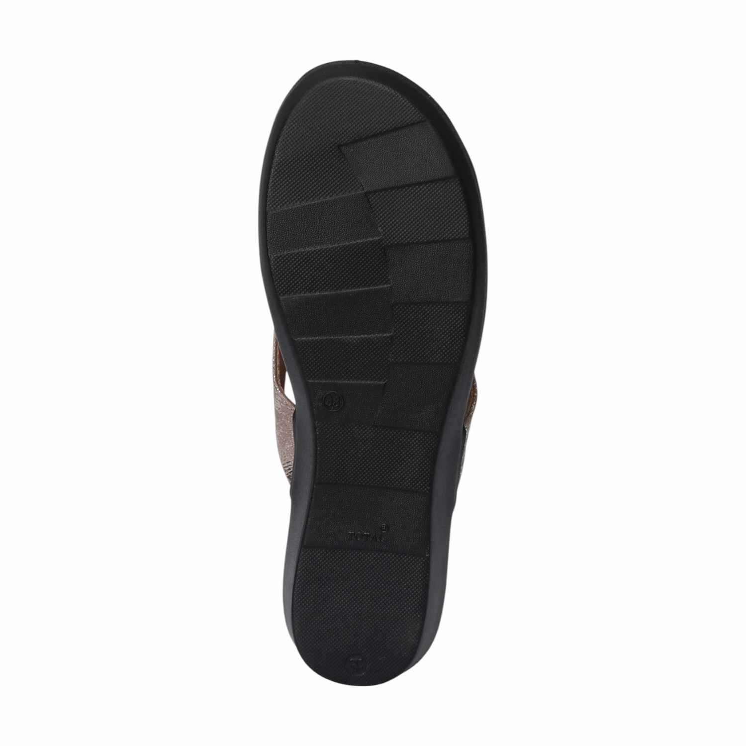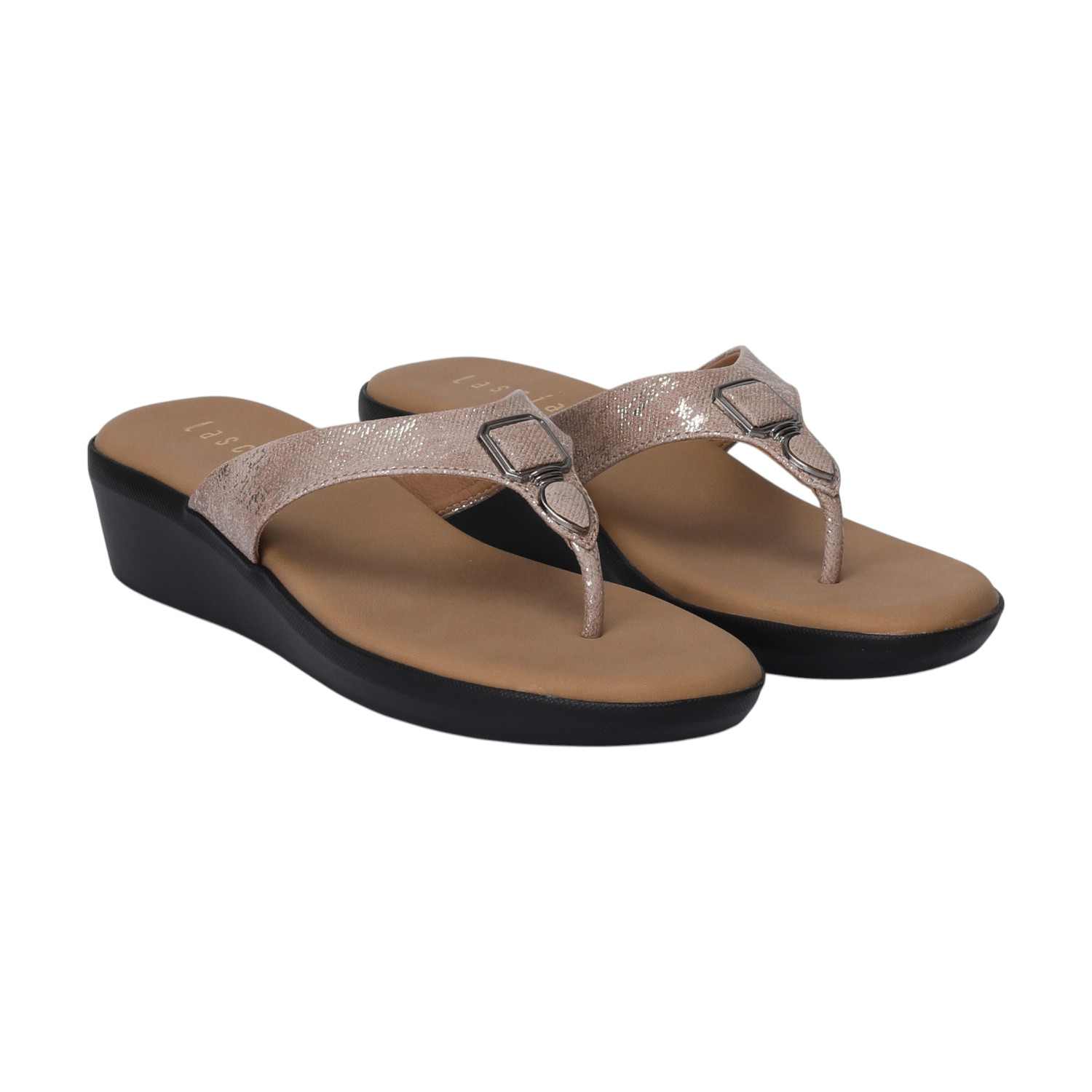 This Women Beige Wedge Flip-Flop offers a delicate blend of charm and comfortable elevation. It features a soft, Beige-toned thong strap with a subtle textured, possibly shimmering finish and a sleek metallic embellishment, set on a comfortable matching footbed and a contrasting black wedge sole, perfect for versatile daily wear.