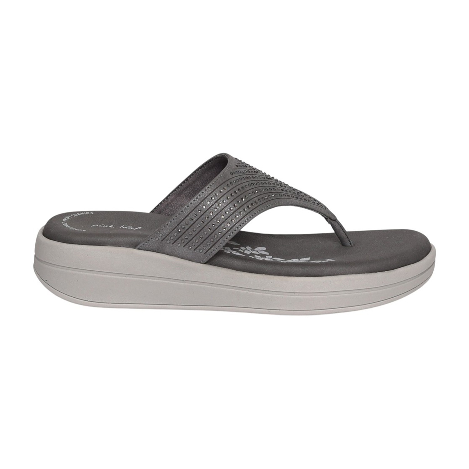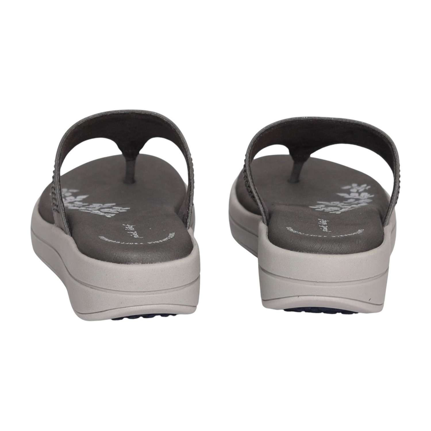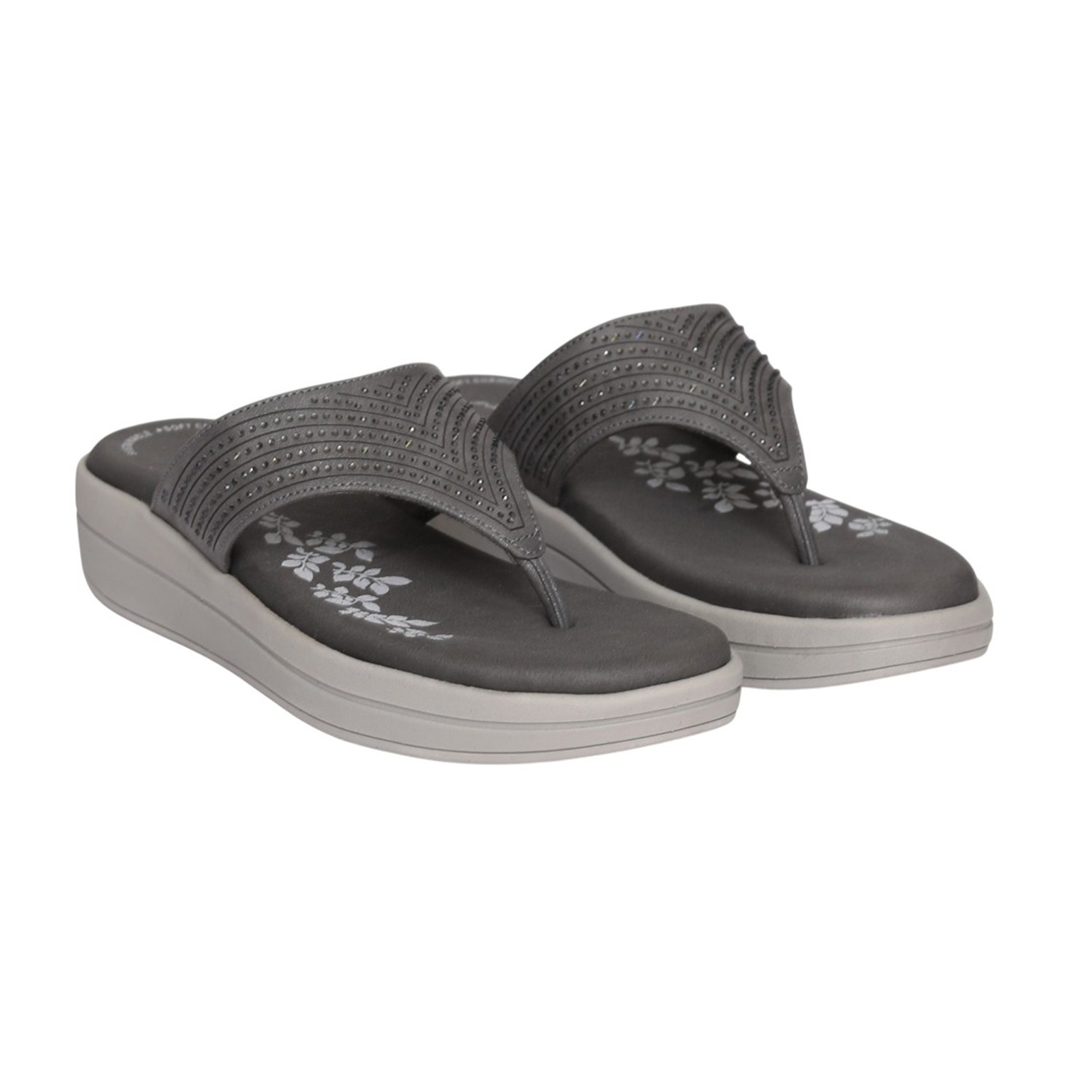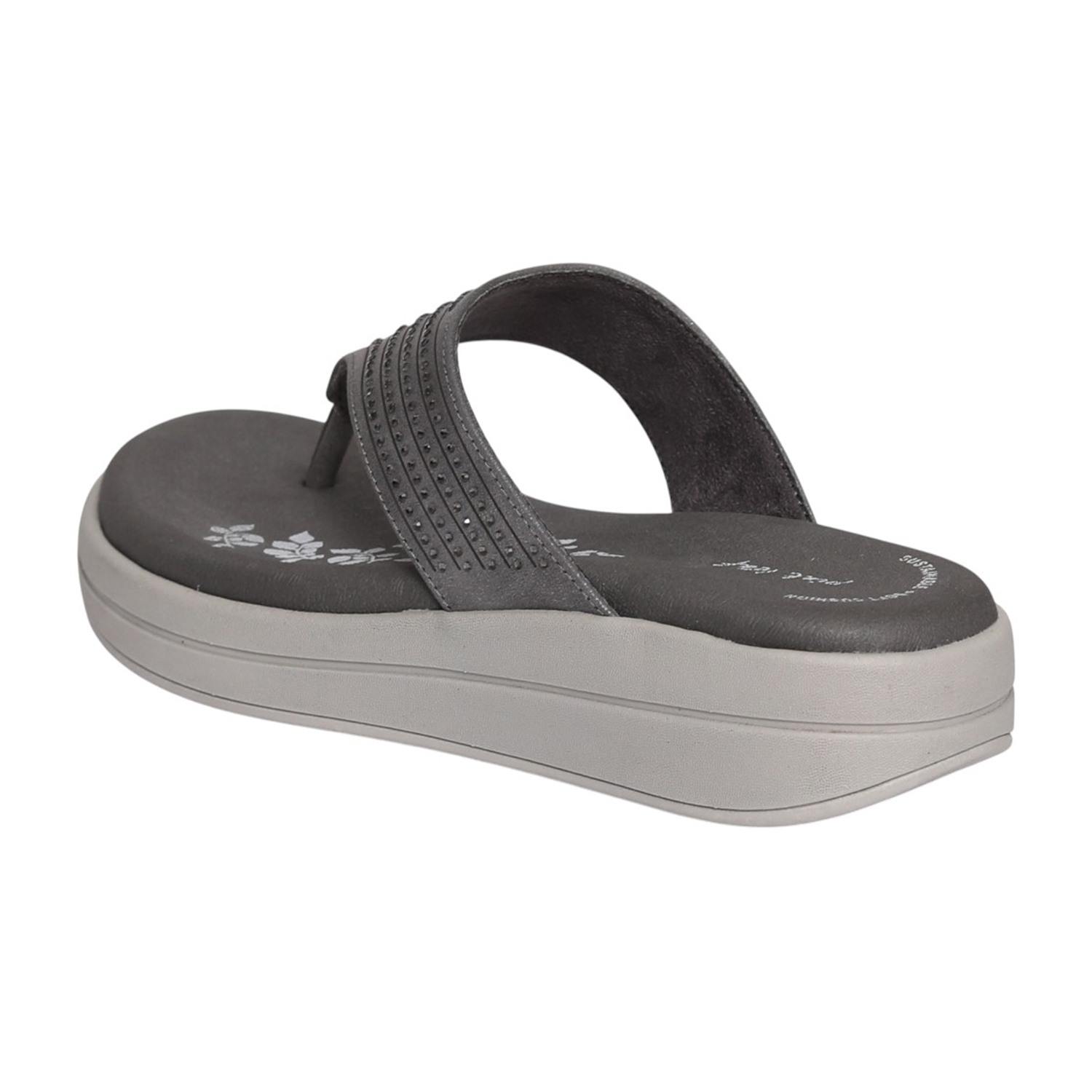 These stylish grey flip-flops feature a soft cushioned footbed and a lightweight wedge sole designed for all-day comfort. The upper is adorned with subtle stud detailing in a chevron pattern, adding a modern yet understated elegance. Perfect for daily wear, travel, casual outings, or pairing with everyday ethnic and western outfits.