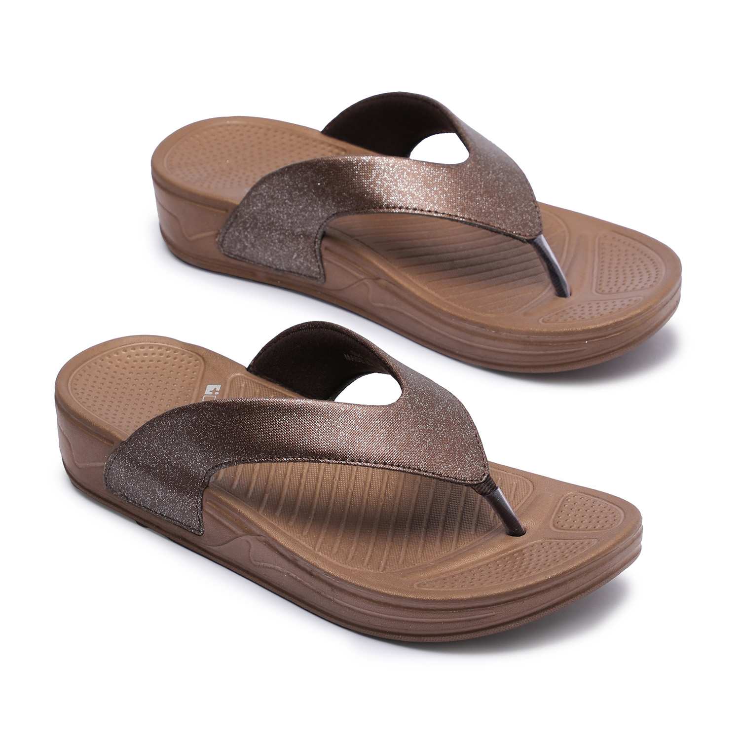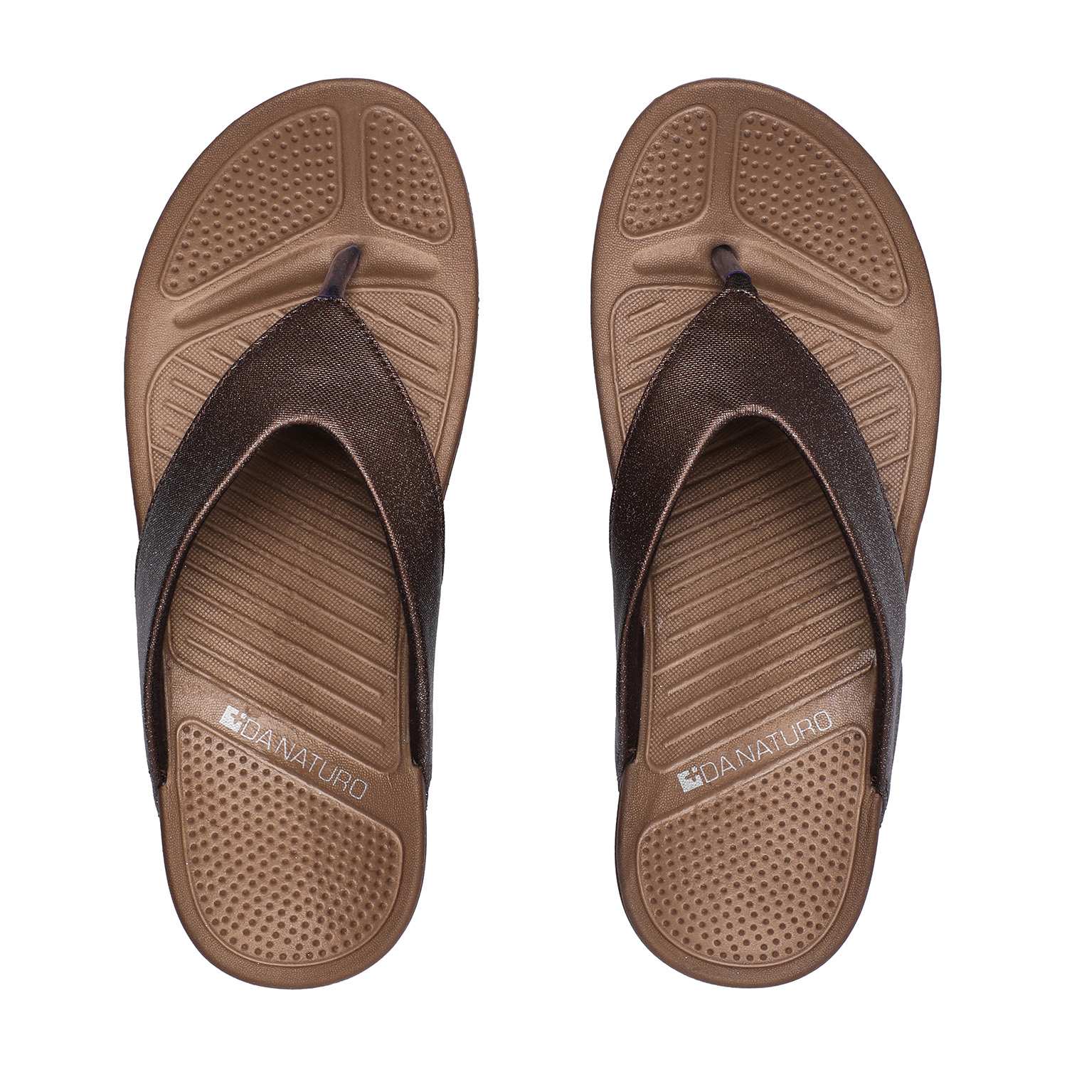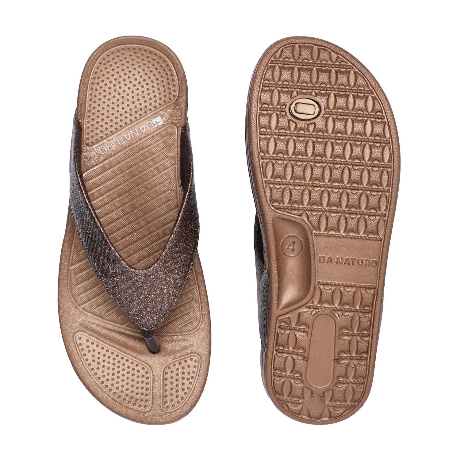 Bask in effortless elegance with our Brown Radiance Comfort Slides. These women's thong sandals feature a luxurious brown glitter-finished strap that shimmers with every step, perfectly complementing the soft, matching tan sole for ultimate ease. Designed for both dazzling style and plush support, they are branded with 'DA NATURO' on the insole, making them ideal for adding a touch of Antique finish to your casual look while ensuring all-day comfort