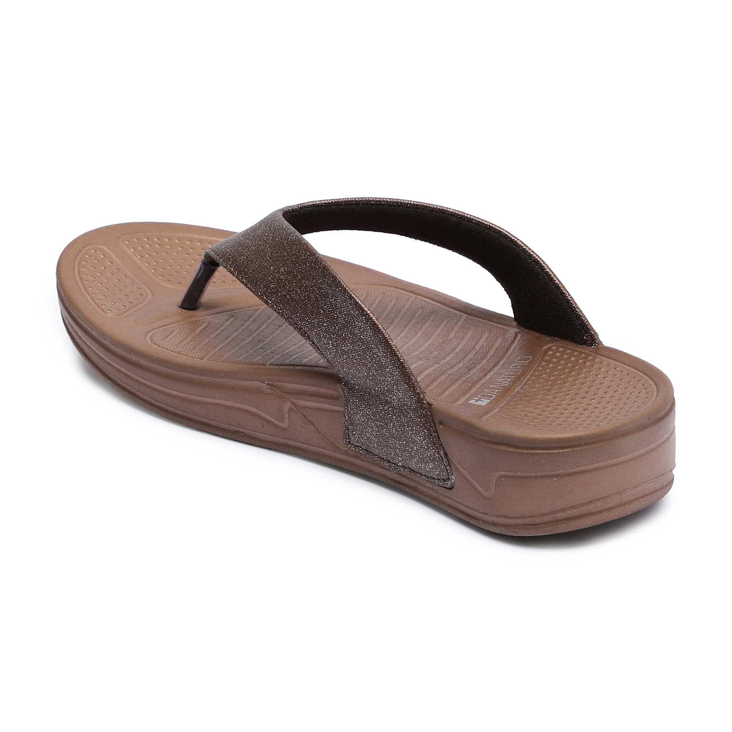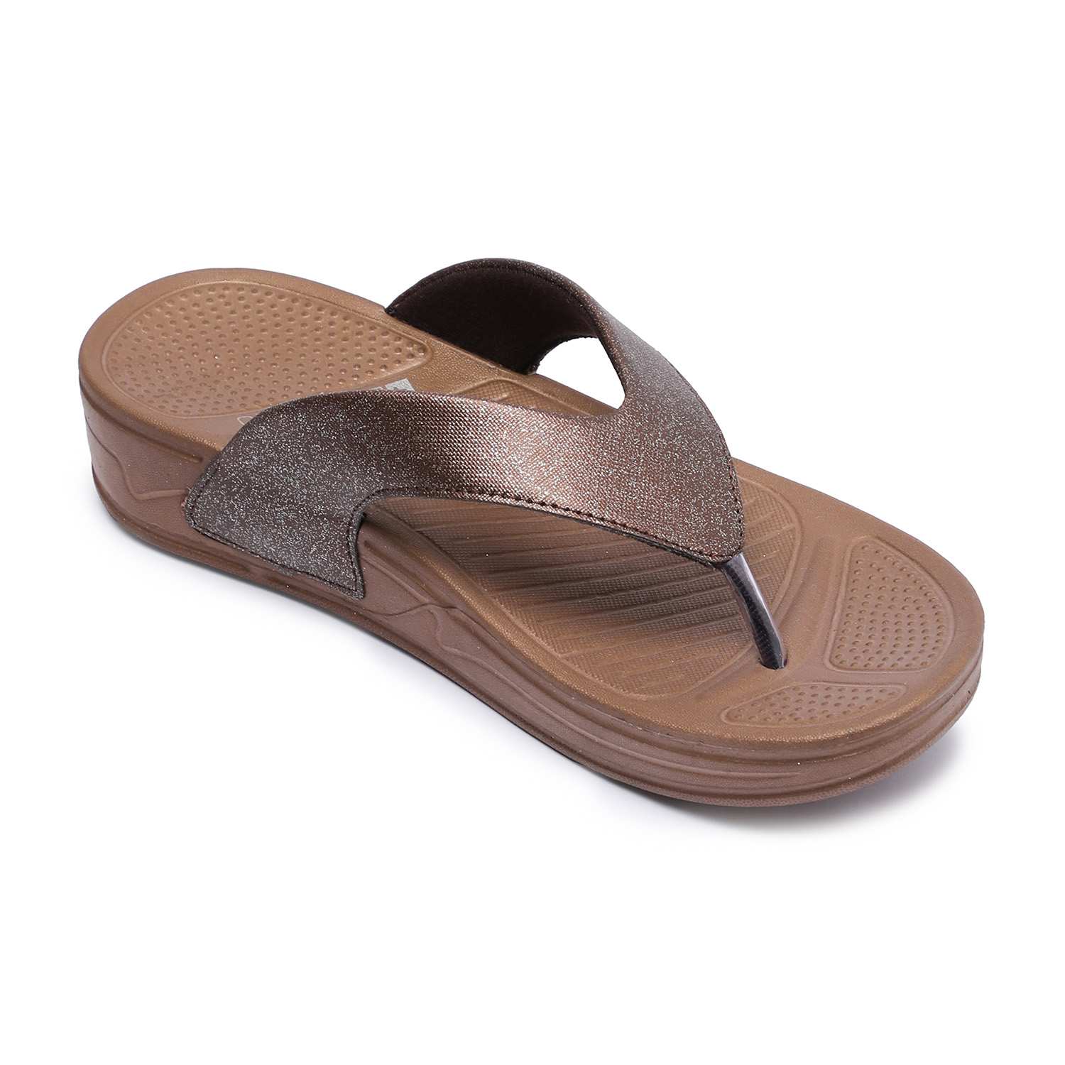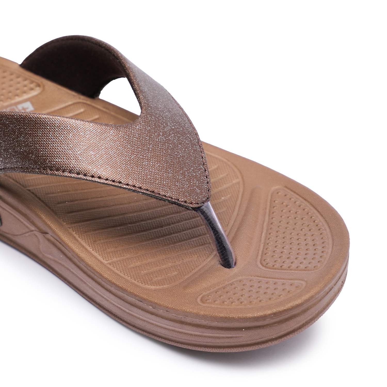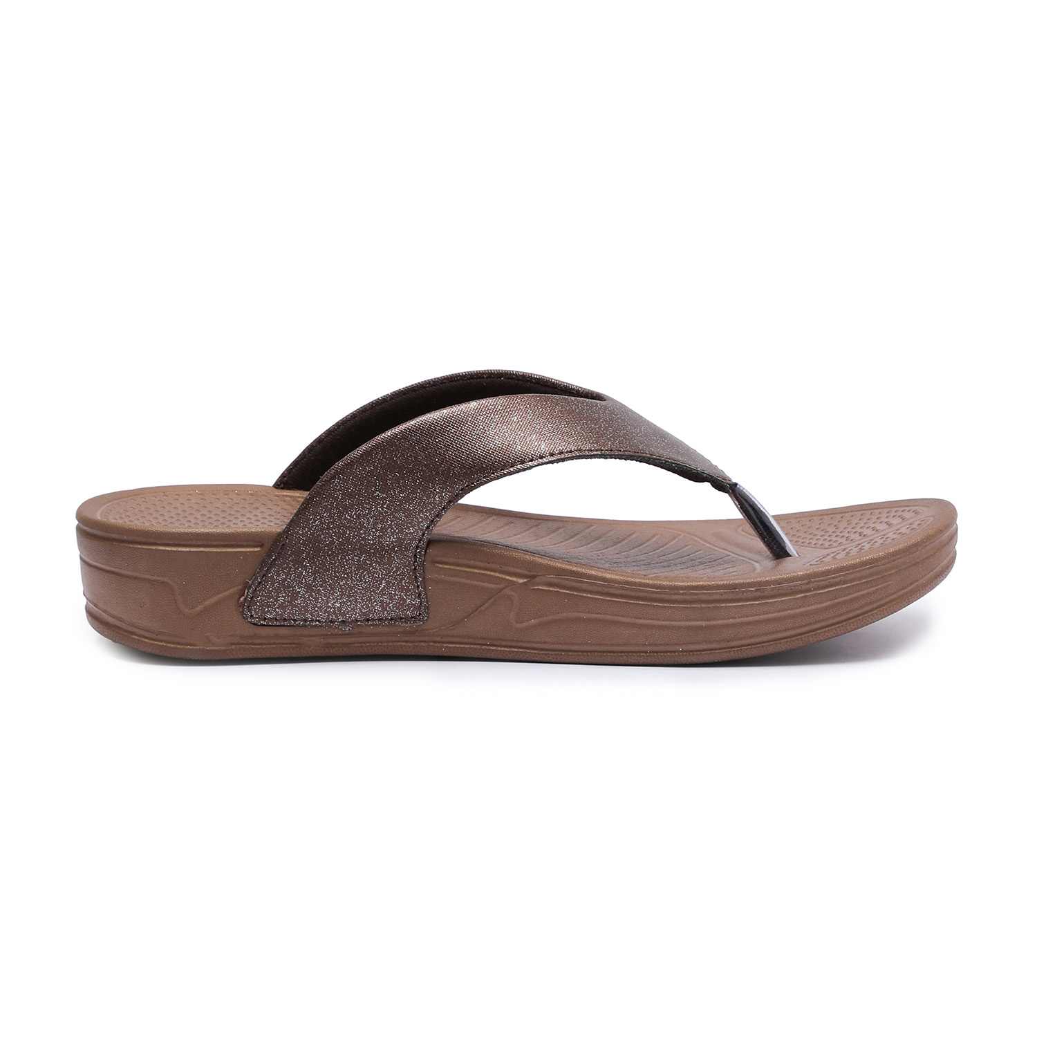 Bask in effortless elegance with our Brown Radiance Comfort Slides. These women's thong sandals feature a luxurious brown glitter-finished strap that shimmers with every step, perfectly complementing the soft, matching tan sole for ultimate ease. Designed for both dazzling style and plush support, they are branded with 'DA NATURO' on the insole, making them ideal for adding a touch of Antique finish to your casual look while ensuring all-day comfort