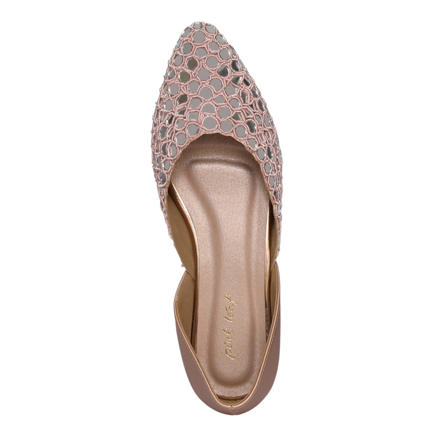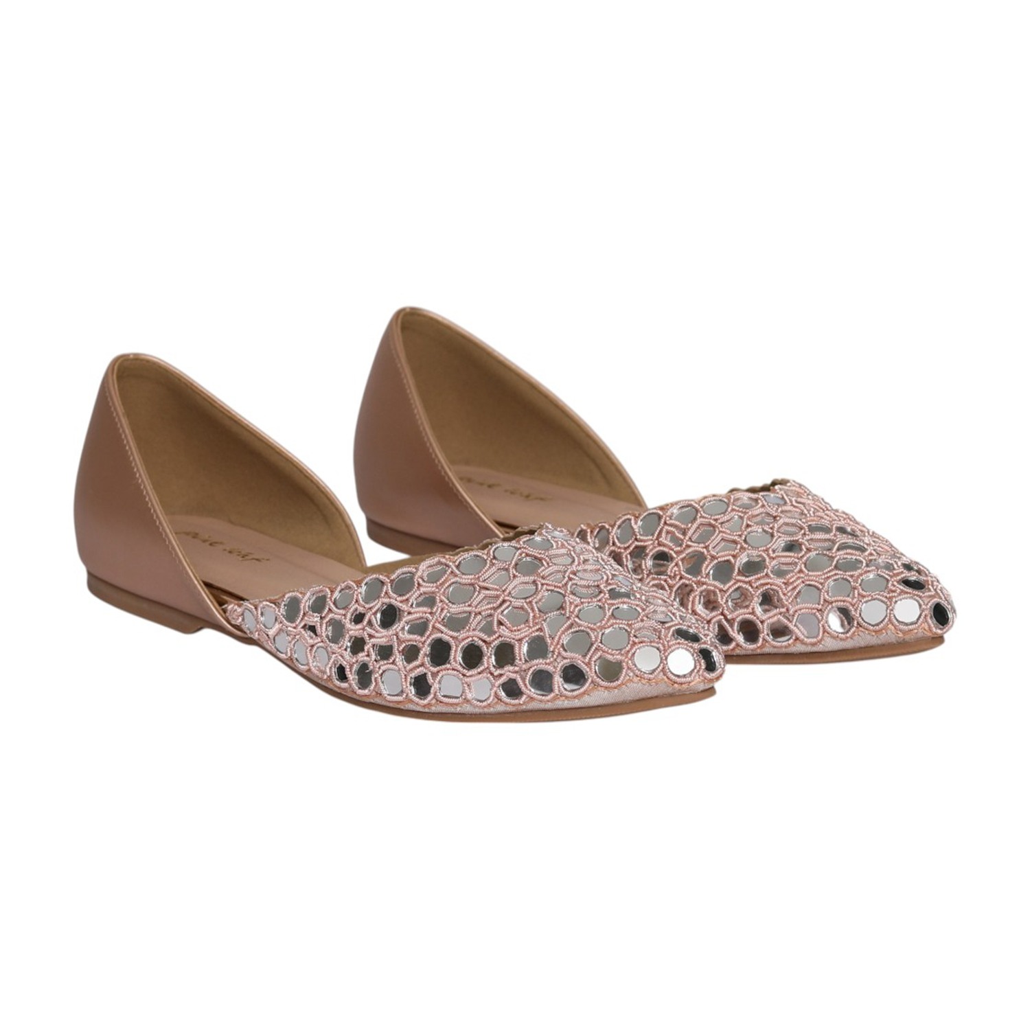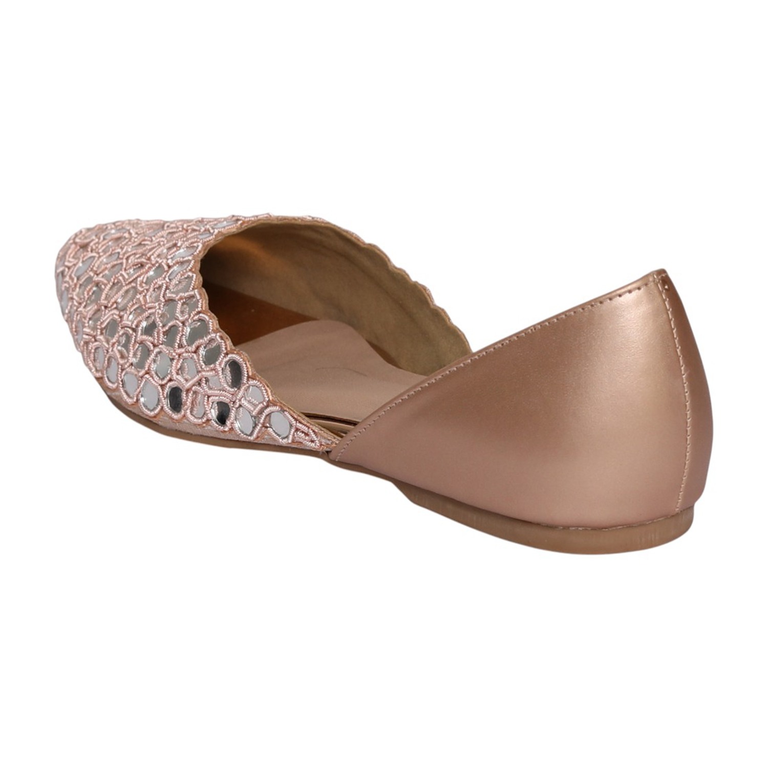 Stylish D’Orsay-style flats featuring a chic open side design offer a modern and elegant look, while the intricate sultan embroidery with mirror embellishments adds a beautiful festive sparkle. The pointed toe shape enhances overall elegance and creates a flattering silhouette, complemented by a soft inner lining that ensures all-day comfort and ease of wear. Designed with a lightweight and flexible sole for effortless movement, these flats are perfect for weddings, parties, festive occasions, and ethnic outfits. Their versatile gold tone pairs seamlessly with both traditional and contemporary attire, making them a must-have addition to any wardrobe.