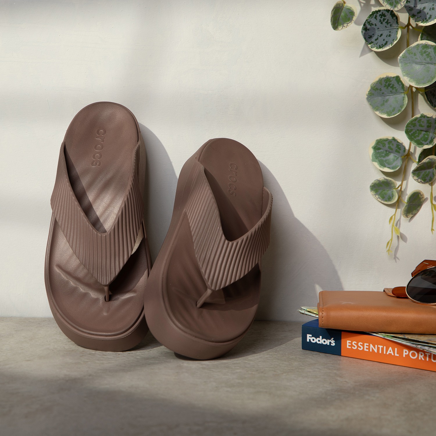 The Crocs Getaway Collection with new Free Feel Technology™ introduces our most seamless comfort innovation yet The soft, flexible Free Feel Technology™ upper feels like nothing at all, floating on top of your foot and moving with you without restriction With a variety of heights and stylish silhouettes, you will have a sandal for every occasion and all your getaways! This version features a platform flip silhouette and resort inspired texture Once you step in, you will never want to take them off Getaway Groove Platform Flip Details: Roomy fit We recommend 1/2 sizes to size down Resort inspired texture on upper straps “Feels like Nothing at All” Free Feel Technology™ Upper SOFT Supremely smooth straps SEAMLESS Unrestricted comfort LIGHTWEIGHT Impossibly light for all-day wear FLEXIBLE Moves with you and your every step Sink-in soft Croslite™ footbed Platform height of 1 5 inches | 40 5mm | 4 05cm