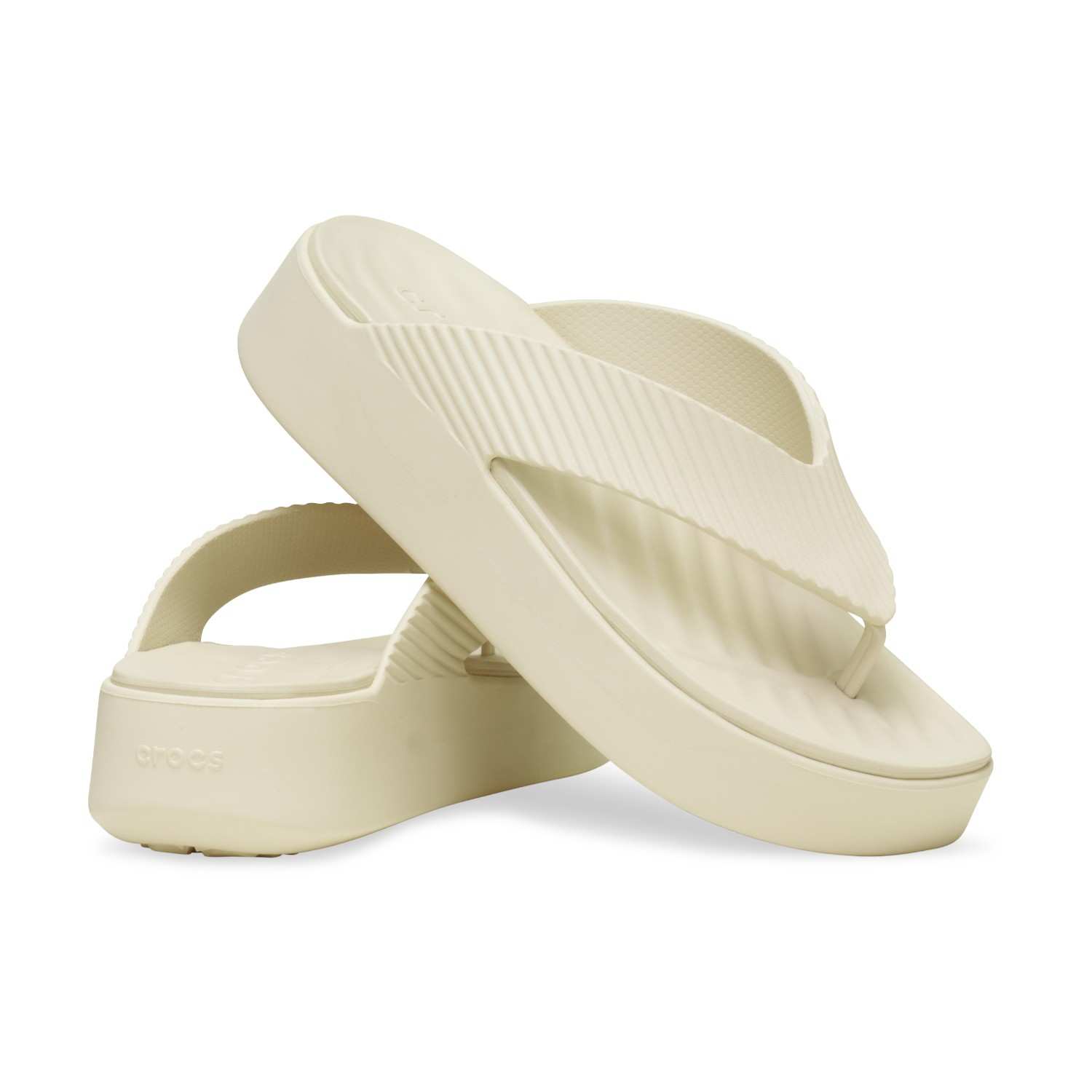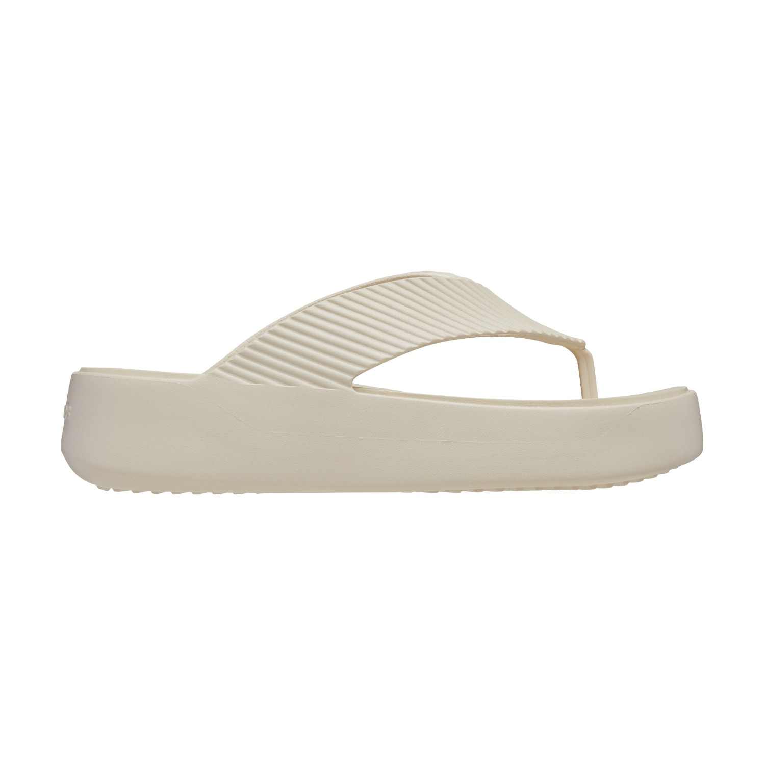The Crocs Getaway Collection with new Free Feel Technology™ introduces our most seamless comfort innovation yet The soft, flexible Free Feel Technology™ upper feels like nothing at all, floating on top of your foot and moving with you without restriction With a variety of heights and stylish silhouettes, you will have a sandal for every occasion and all your getaways! This version features a platform flip silhouette and resort inspired texture Once you step in, you will never want to take them off