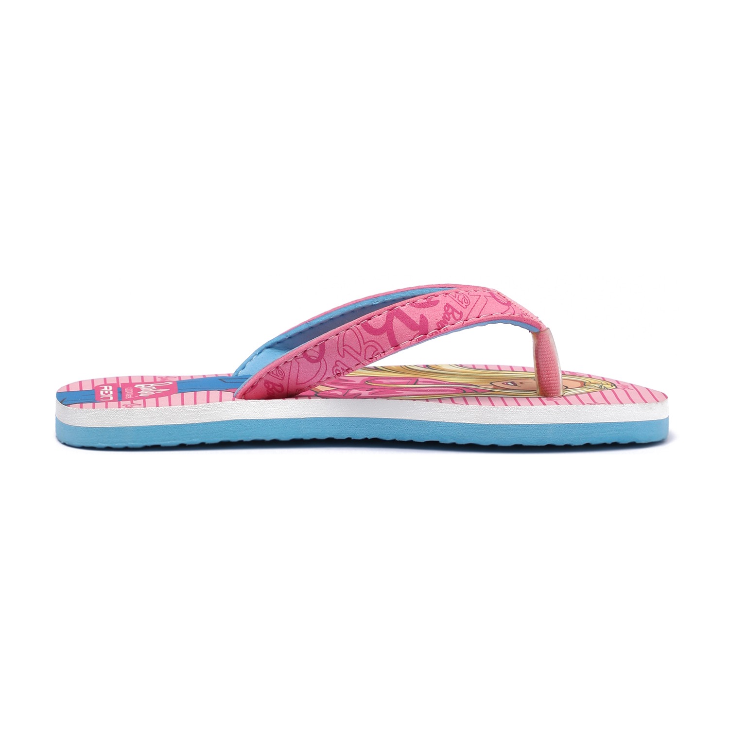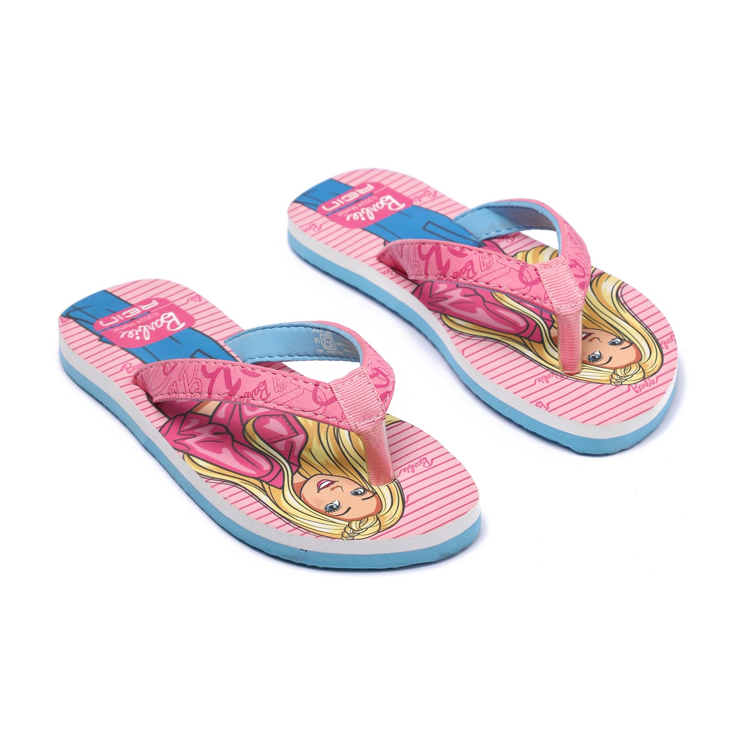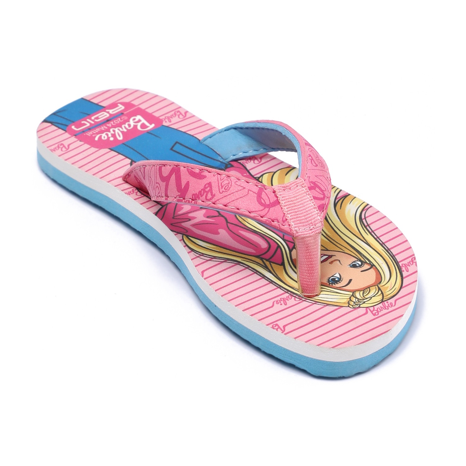 Brighten up your child's steps with these charming Barbie flip-flops for girls. Showcasing a fun Barbie print on a pink striped footbed, these sandals come with soft, wide pink straps featuring Barbie-themed graphics for added flair. The contrast blue sole adds a pop of color and provides lightweight comfort, making them ideal for daily wear.