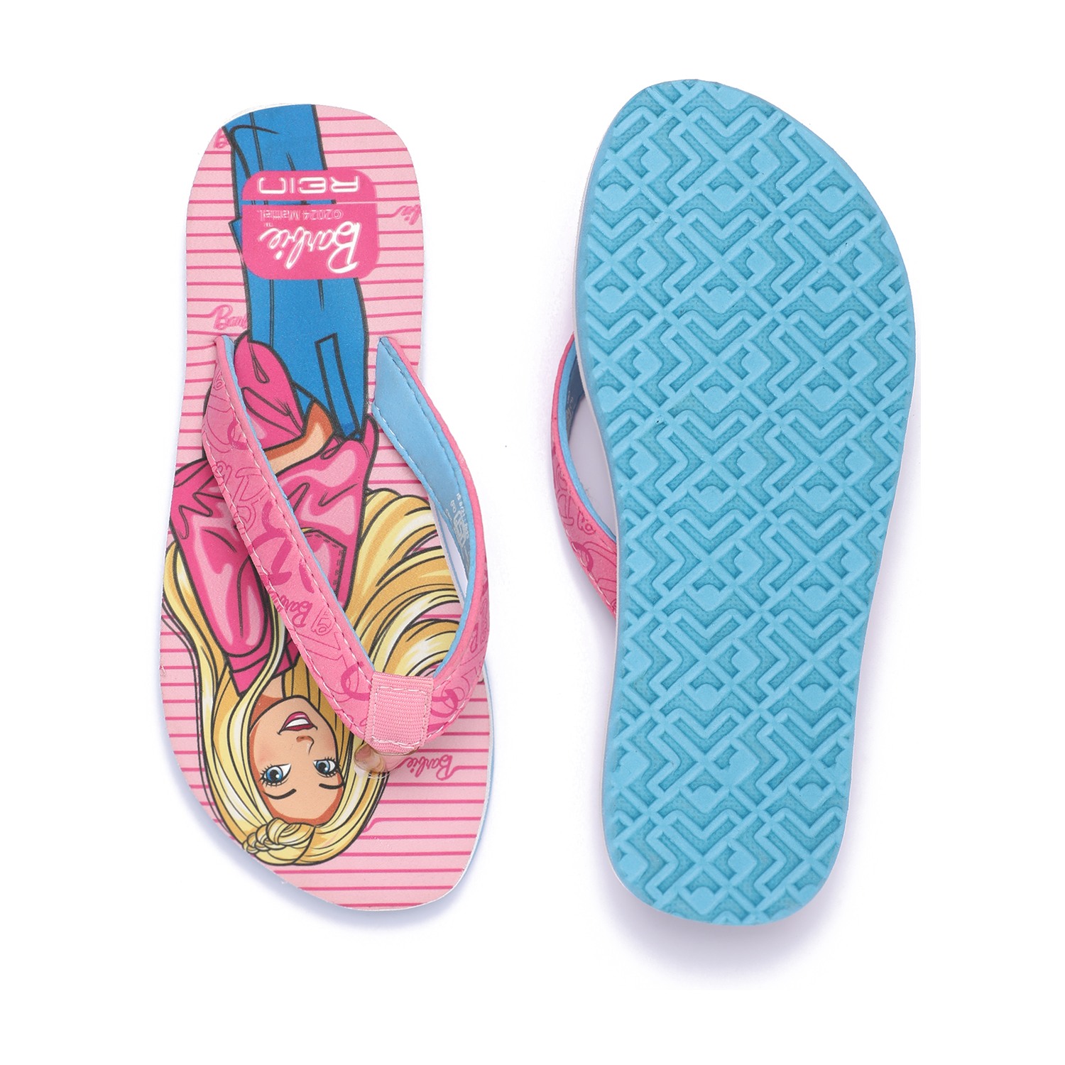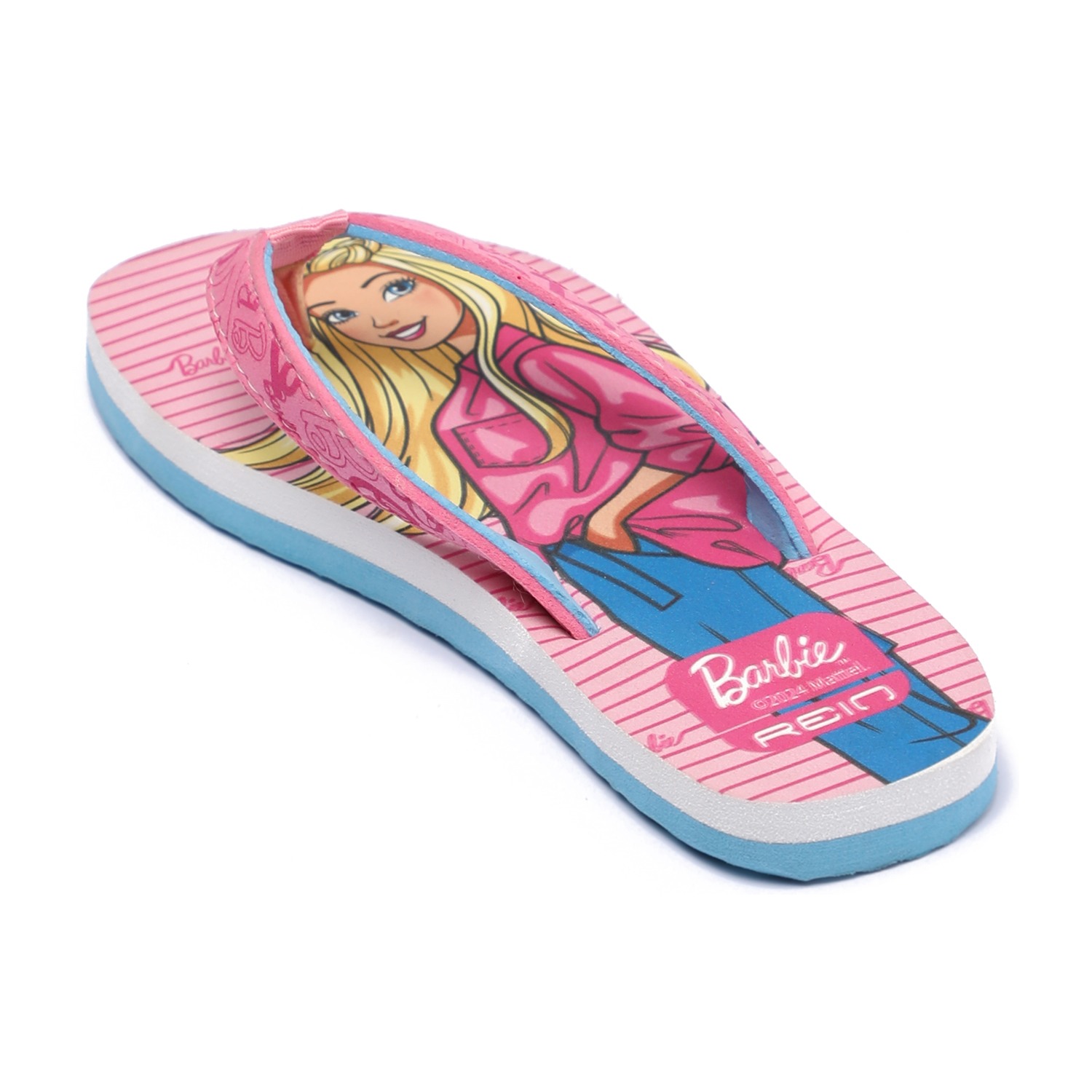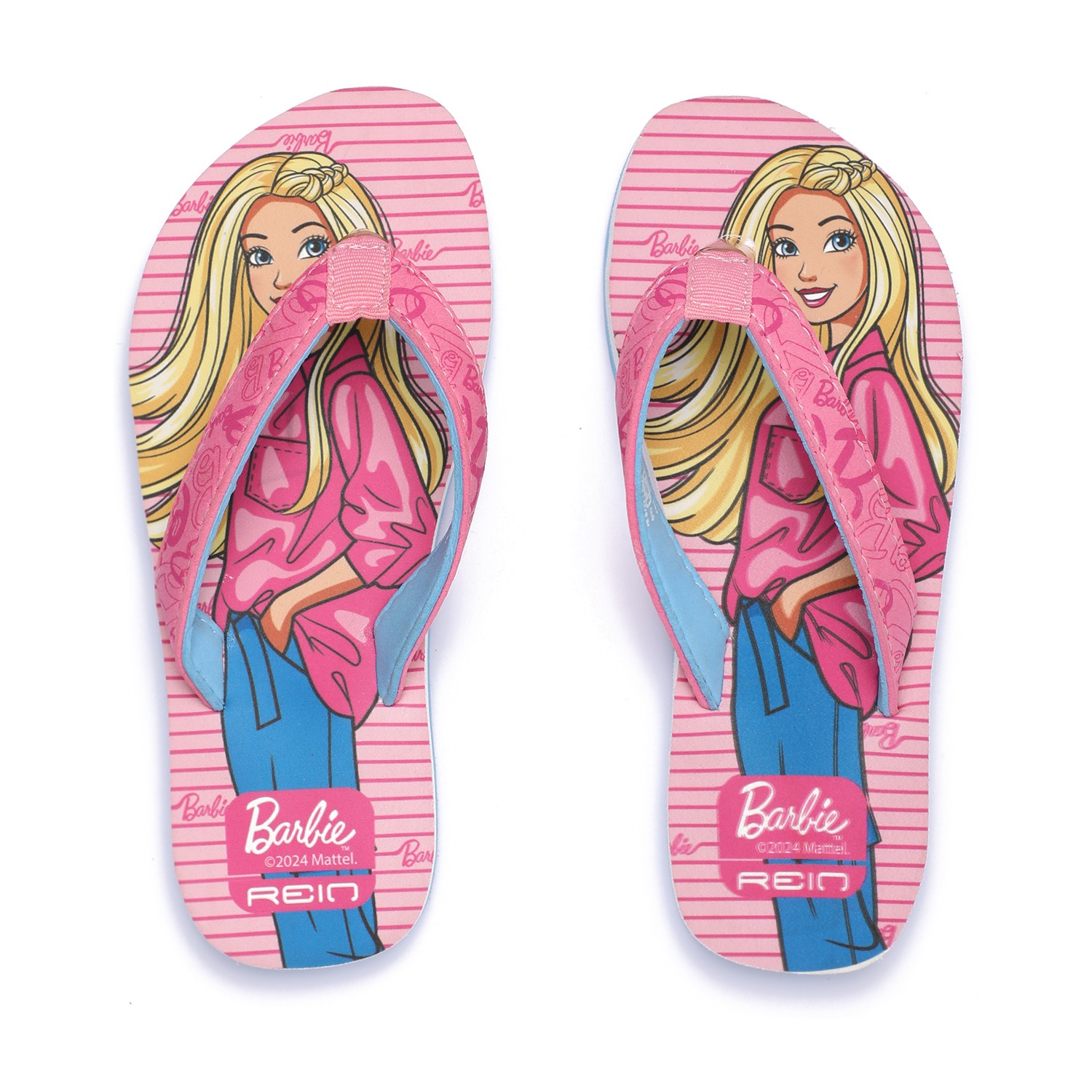 Brighten up your child's steps with these charming Barbie flip-flops for girls. Showcasing a fun Barbie print on a pink striped footbed, these sandals come with soft, wide pink straps featuring Barbie-themed graphics for added flair. The contrast blue sole adds a pop of color and provides lightweight comfort, making them ideal for daily wear.