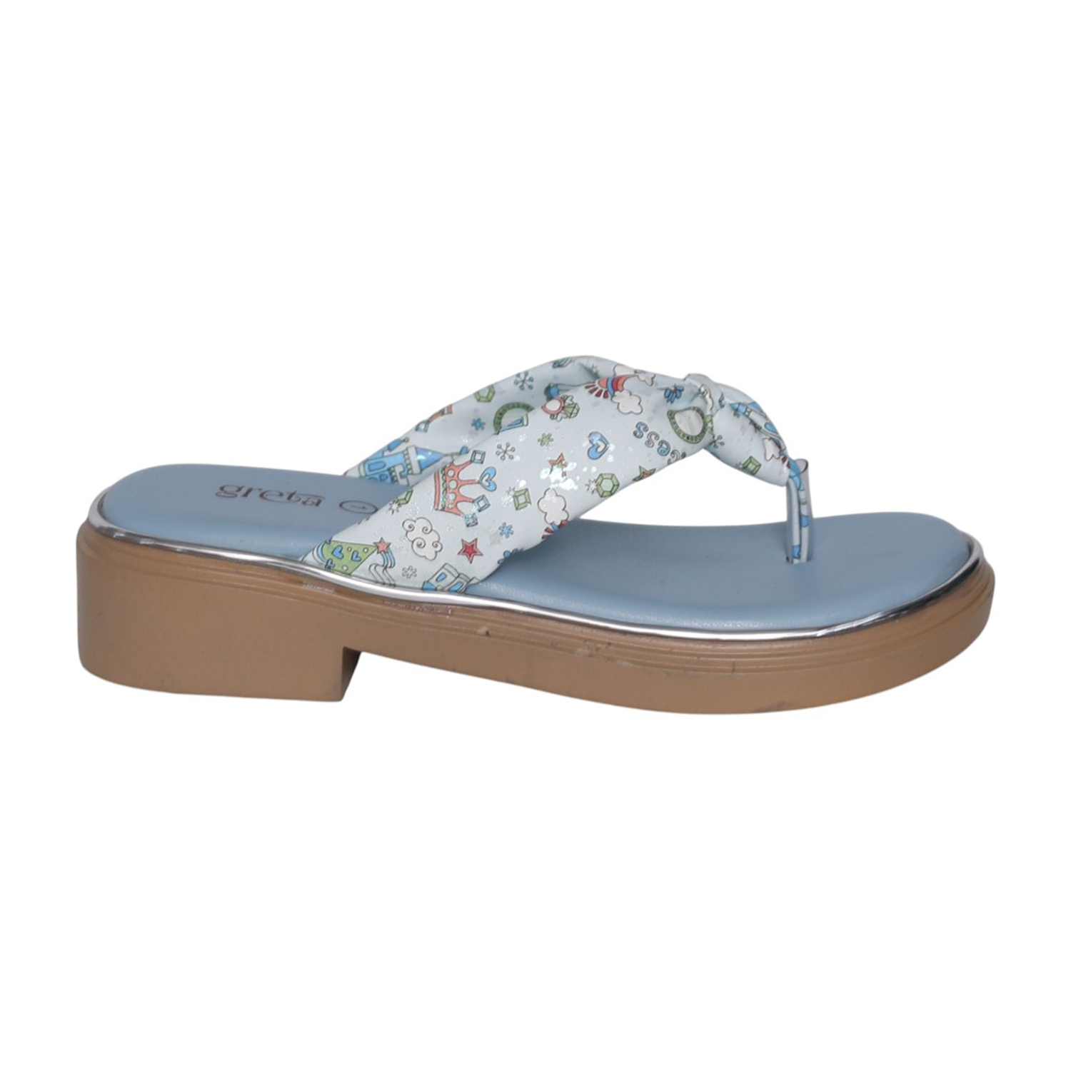 Add a playful touch to your little one’s outfit with these adorable blue printed toe-post sandals. Designed with a soft cushioned footbed and a lightweight wedge sole, these sandals provide all-day comfort while keeping style in focus. The cute multi-color print on the strap adds a fun, cheerful vibe—perfect for casual outings, summer days, or daily wear. Easy to slip on and designed for a secure fit, these sandals are a must-have for active girls who love both comfort and style.