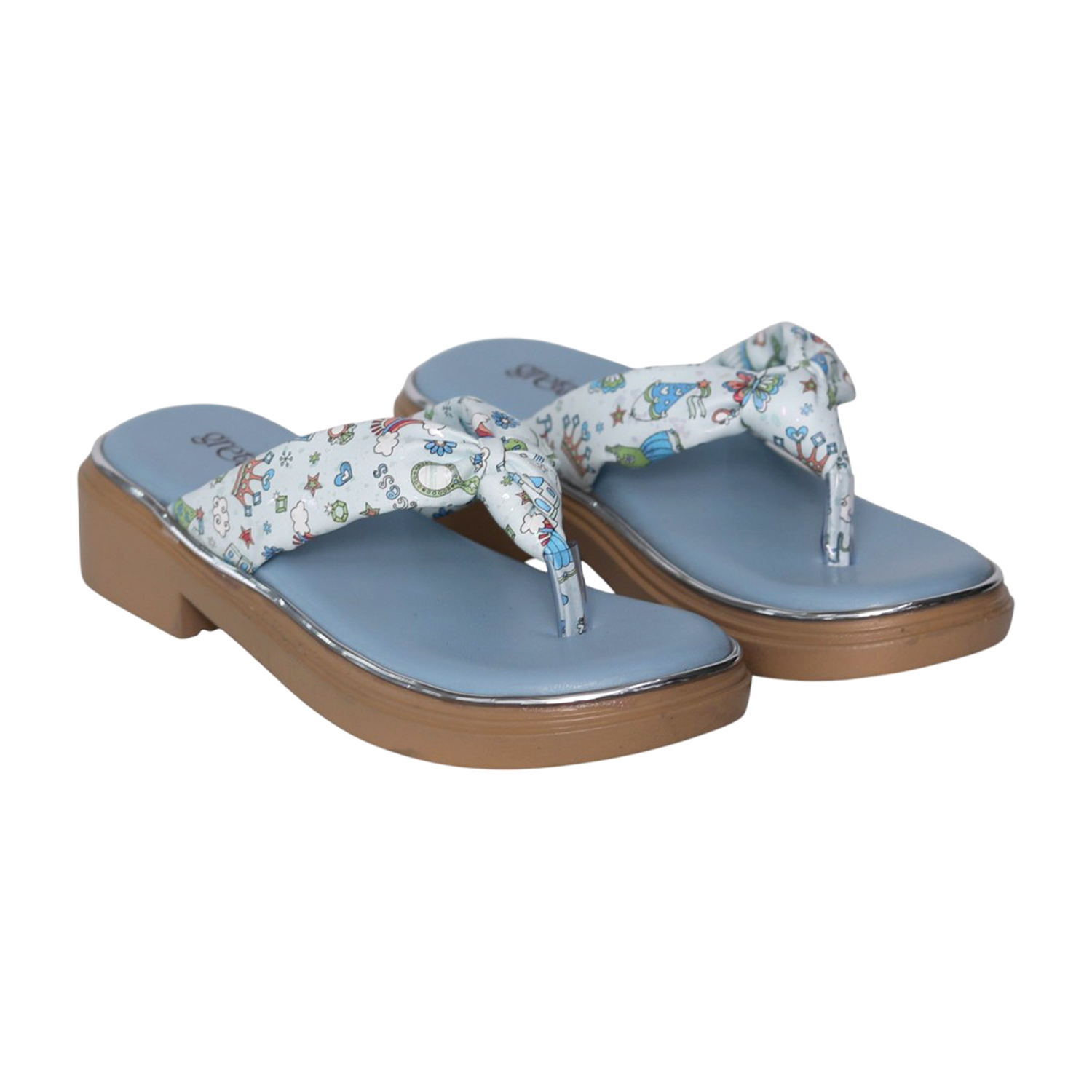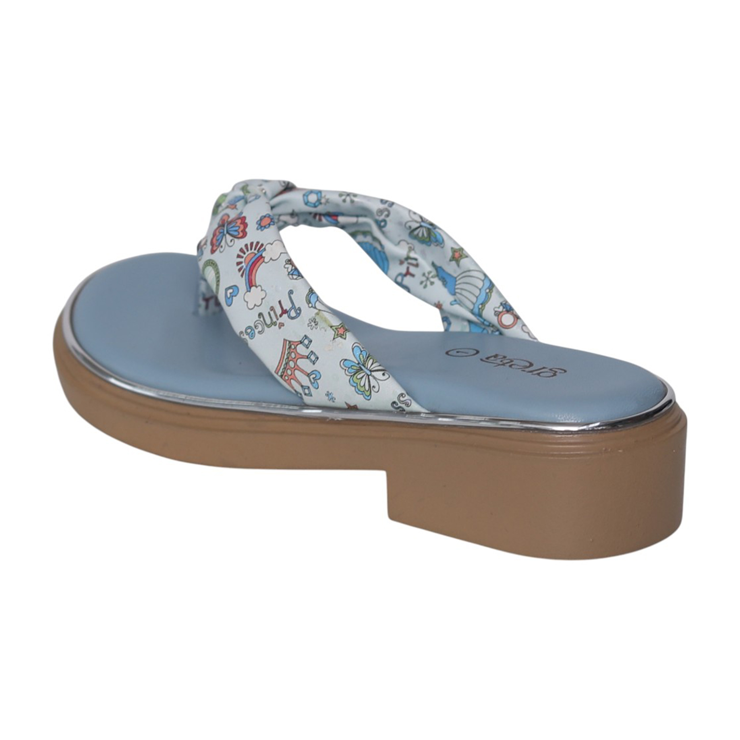 Add a playful touch to your little one’s outfit with these adorable blue printed toe-post sandals. Designed with a soft cushioned footbed and a lightweight wedge sole, these sandals provide all-day comfort while keeping style in focus. The cute multi-color print on the strap adds a fun, cheerful vibe—perfect for casual outings, summer days, or daily wear. Easy to slip on and designed for a secure fit, these sandals are a must-have for active girls who love both comfort and style.
