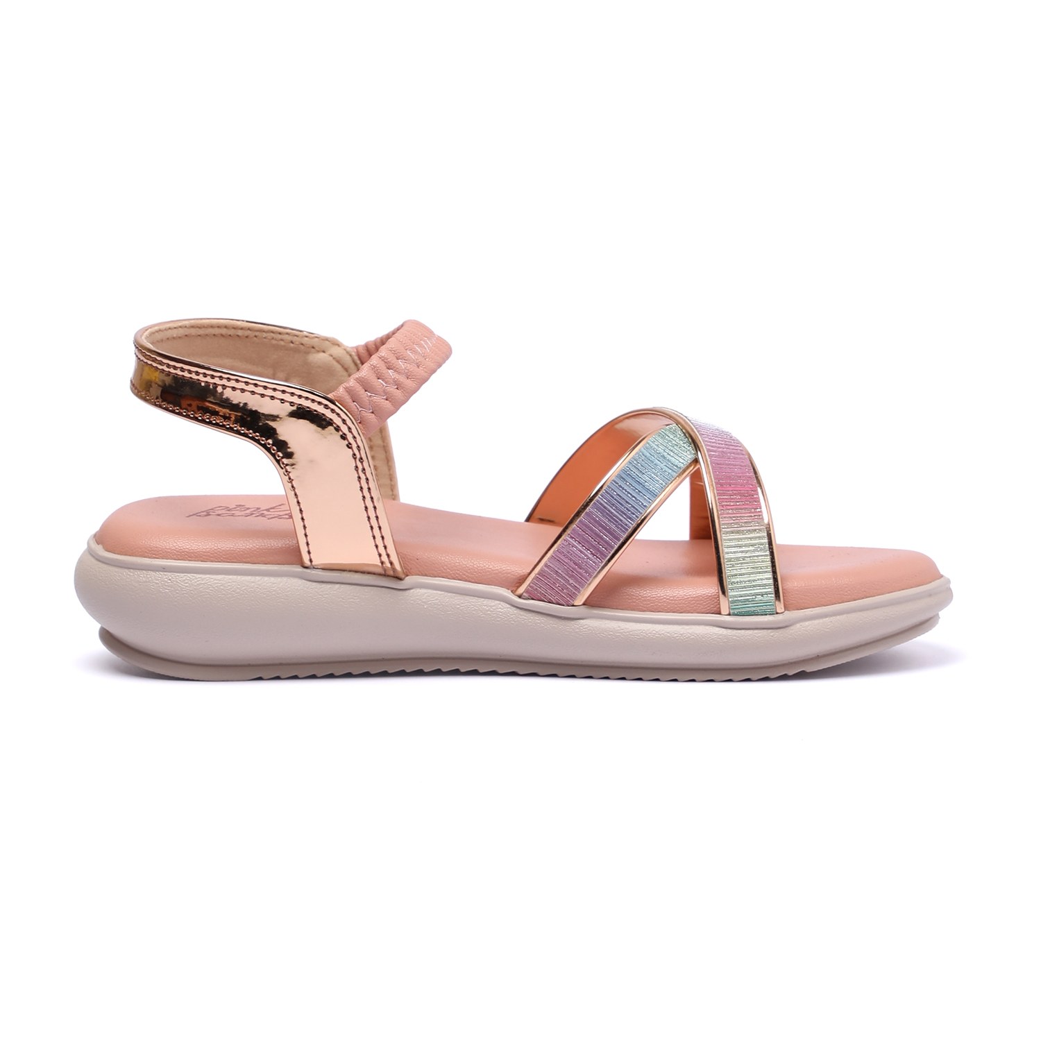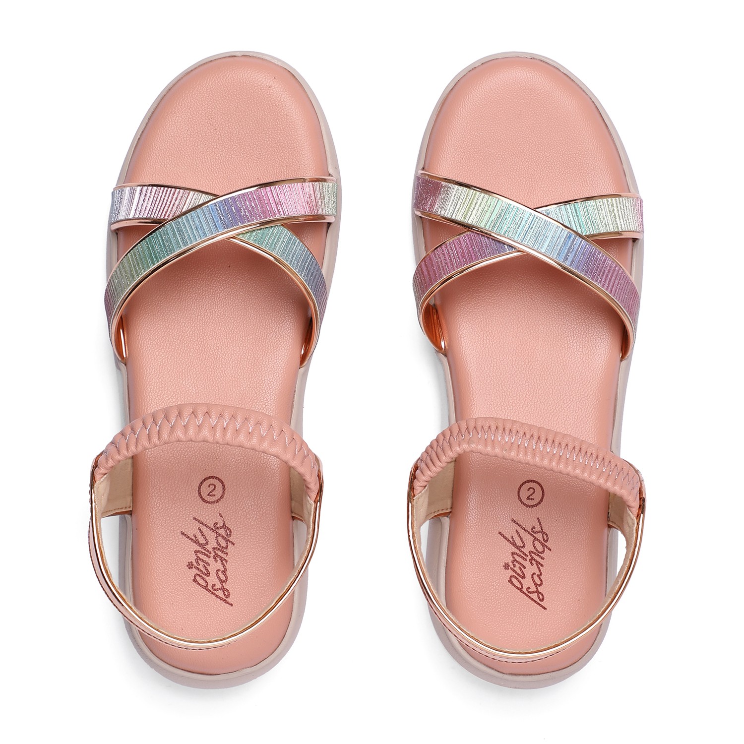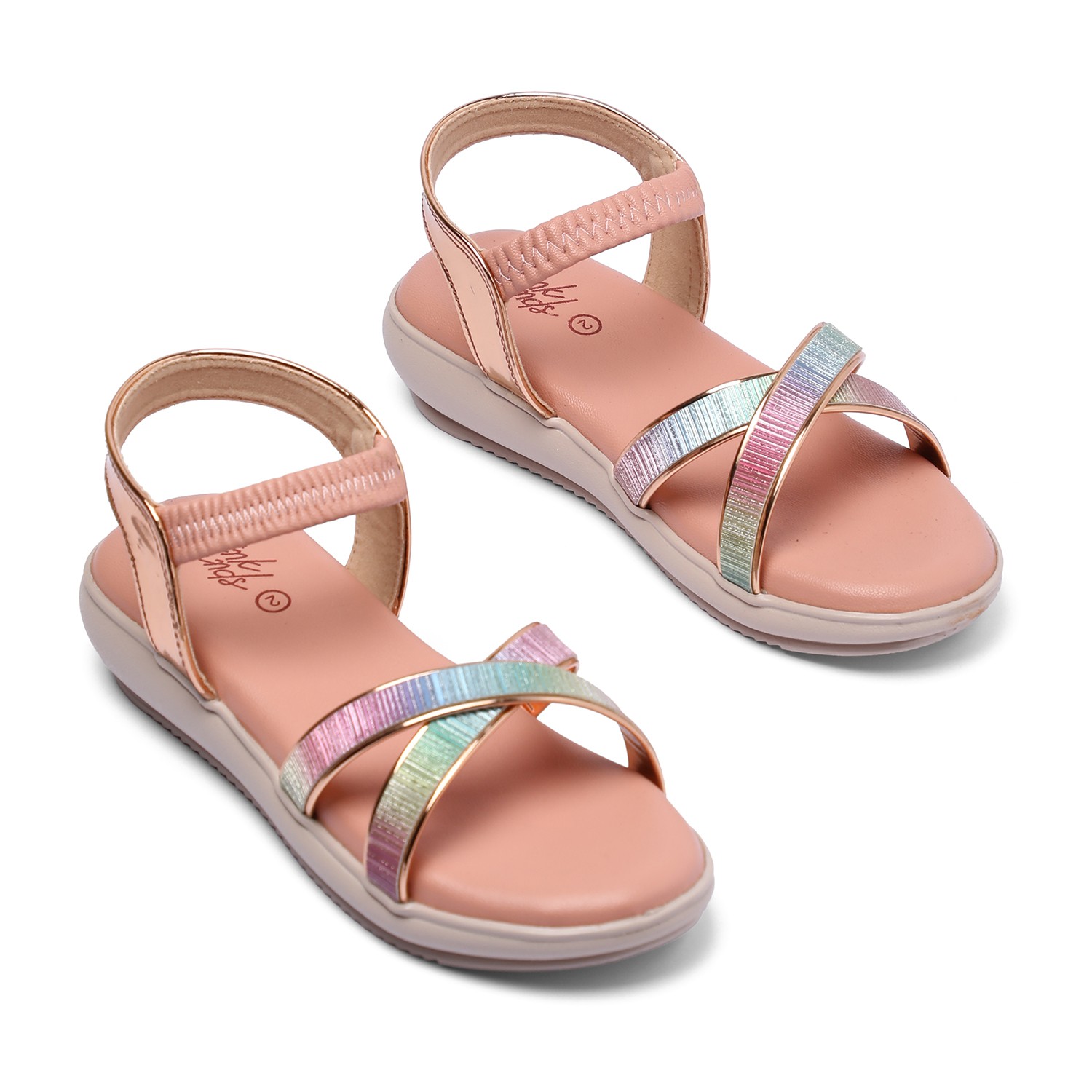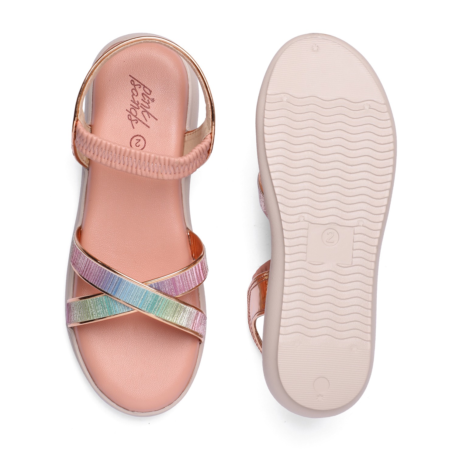 Brighten up your little girl's day with these adorable rainbow strap sandals! Designed in a soft pink base with shimmering multicolor crisscross straps, these sandals offer both style and comfort. The elastic back strap ensures a secure fit, making them easy to slip on and off for daily wear.