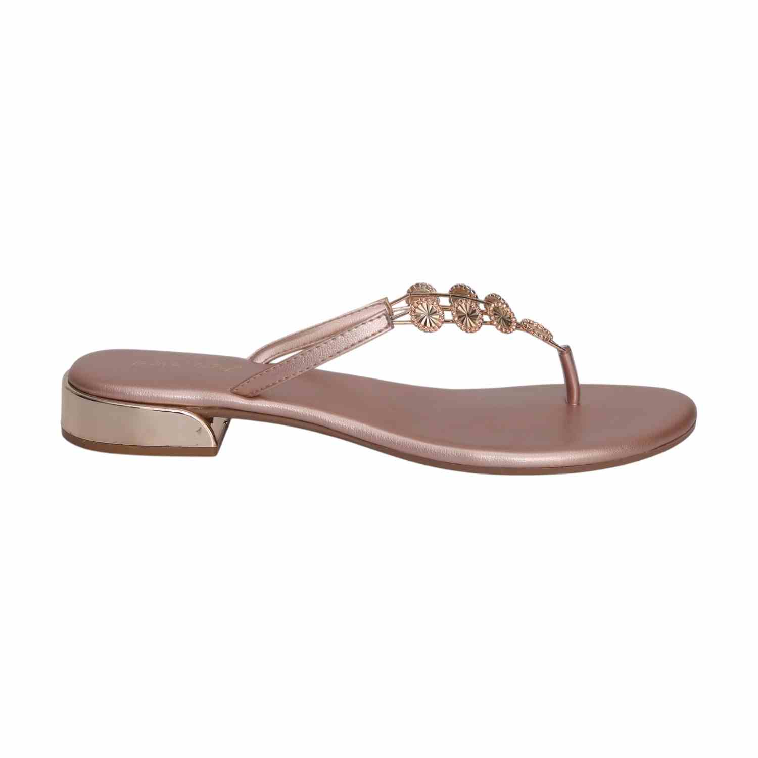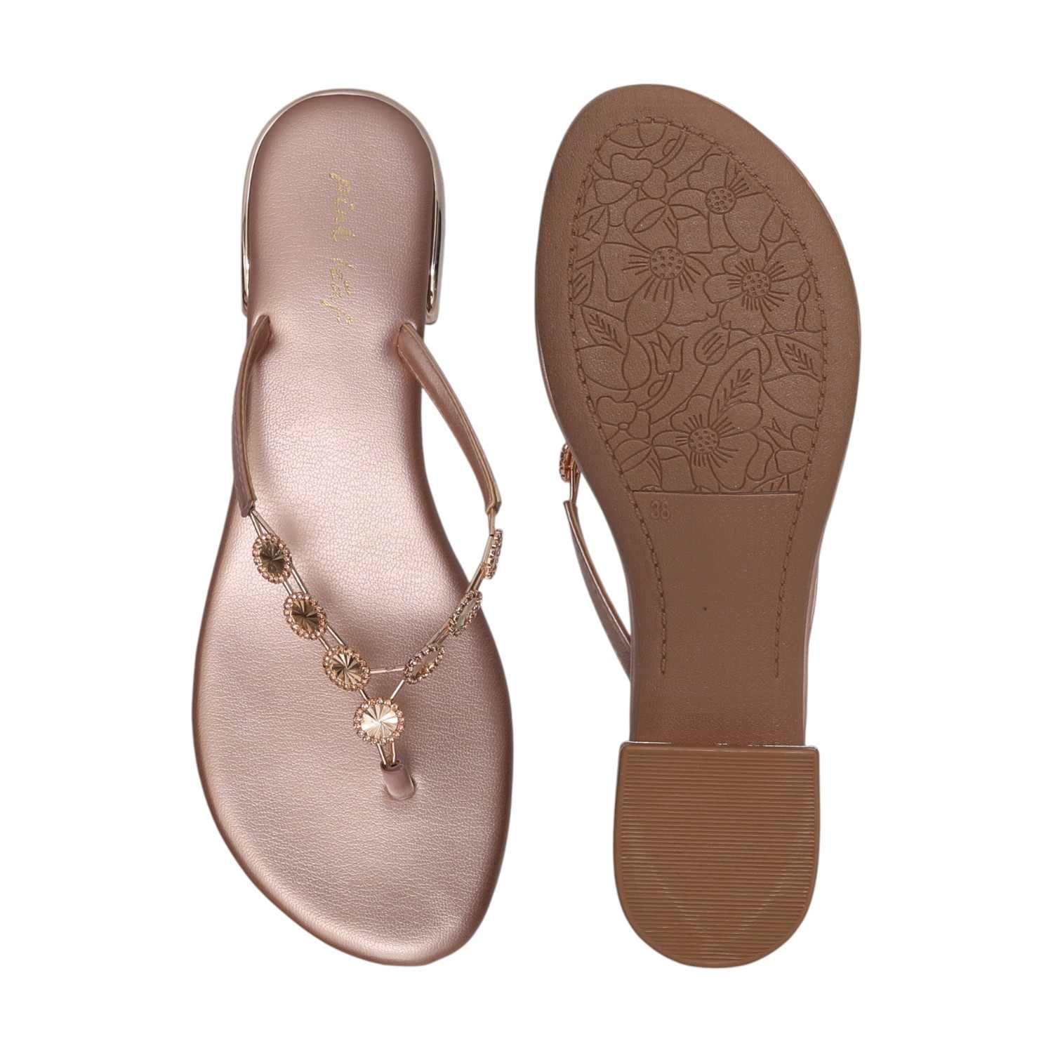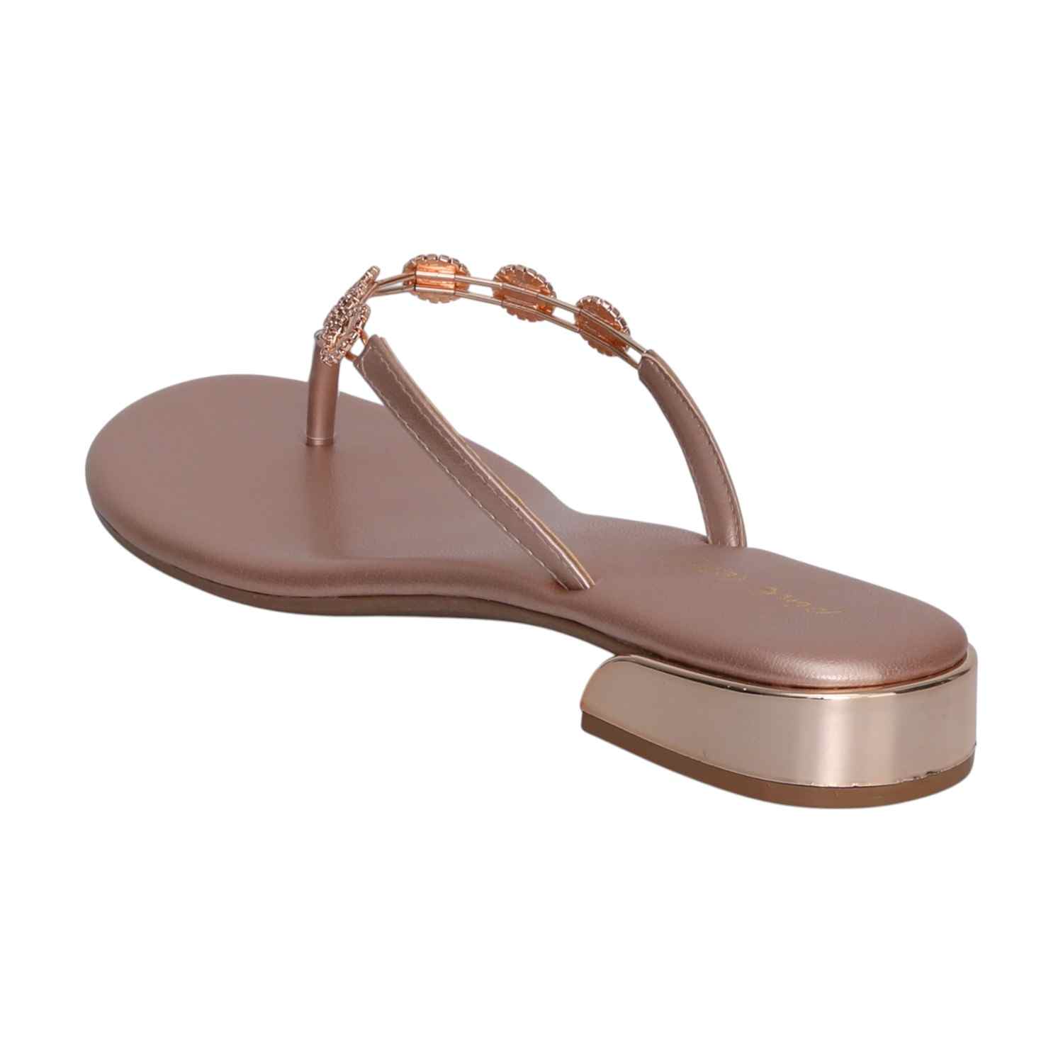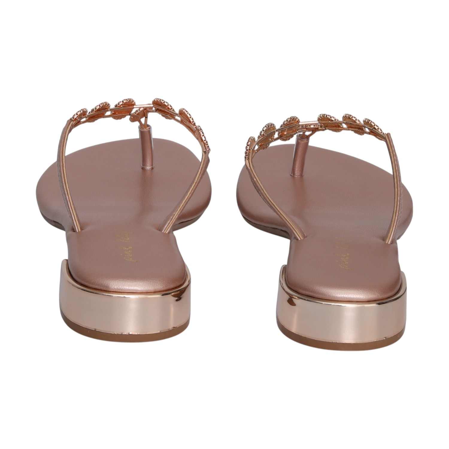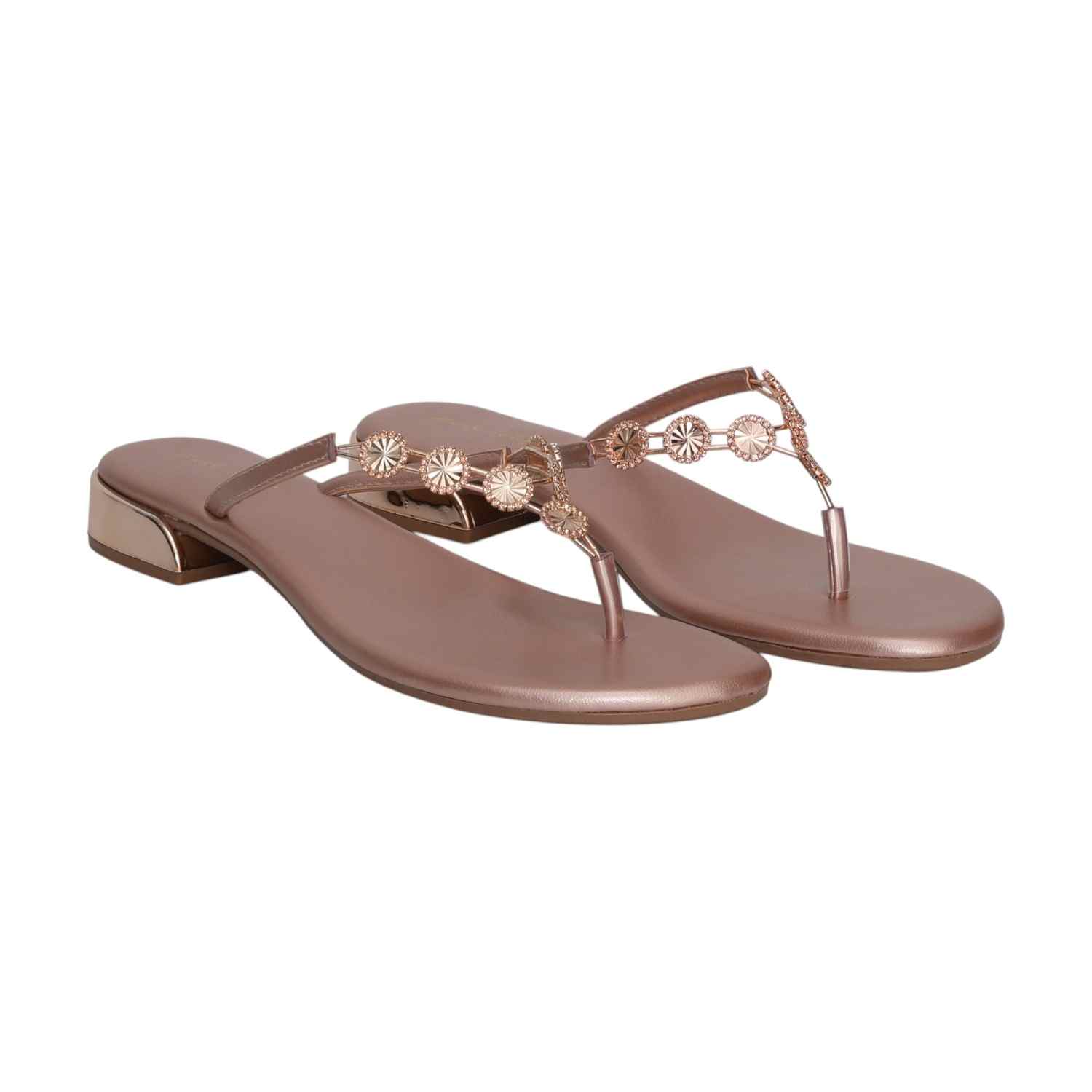 Chic and comfortable, these rose gold thong sandals sparkle with delicate embellishments and a low block heel, perfect for a touch of elevated everyday style.