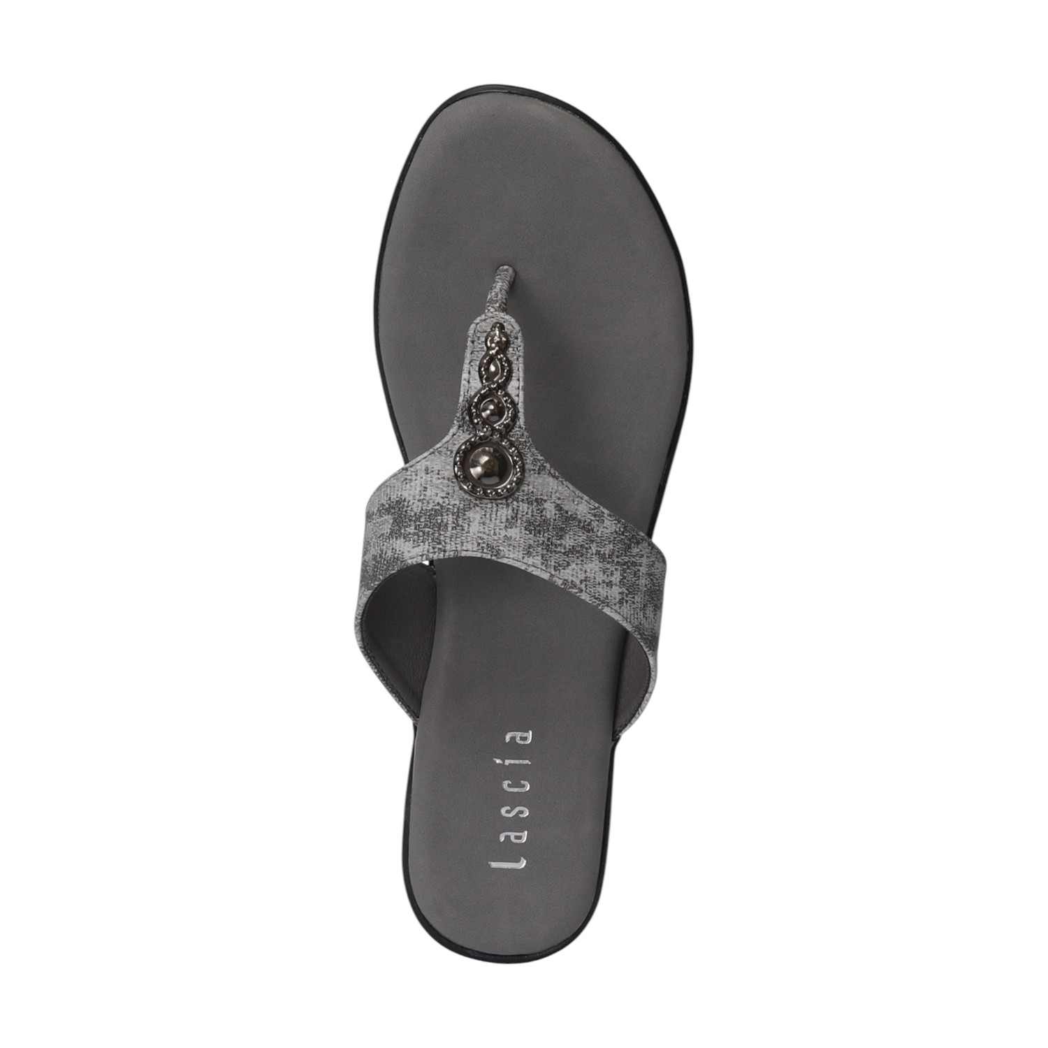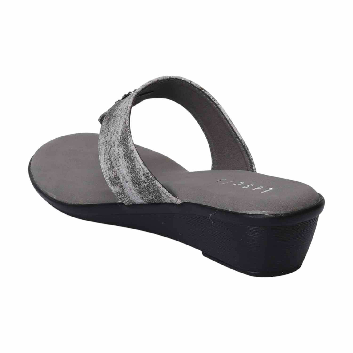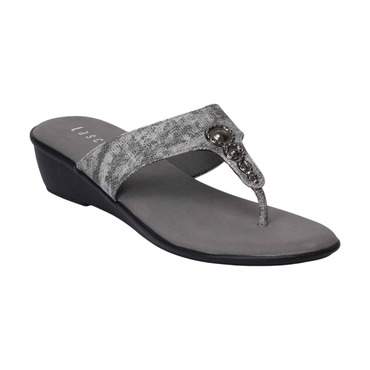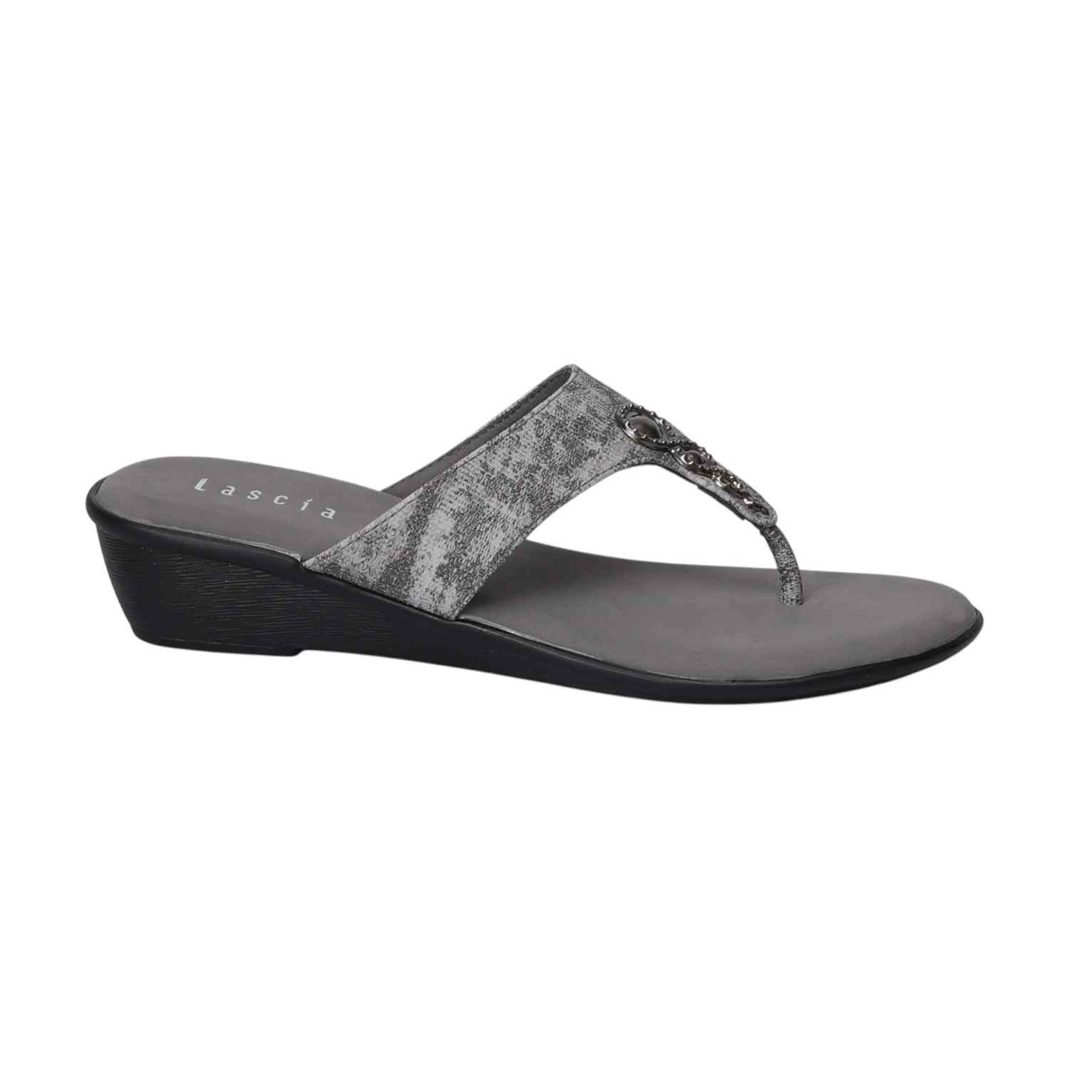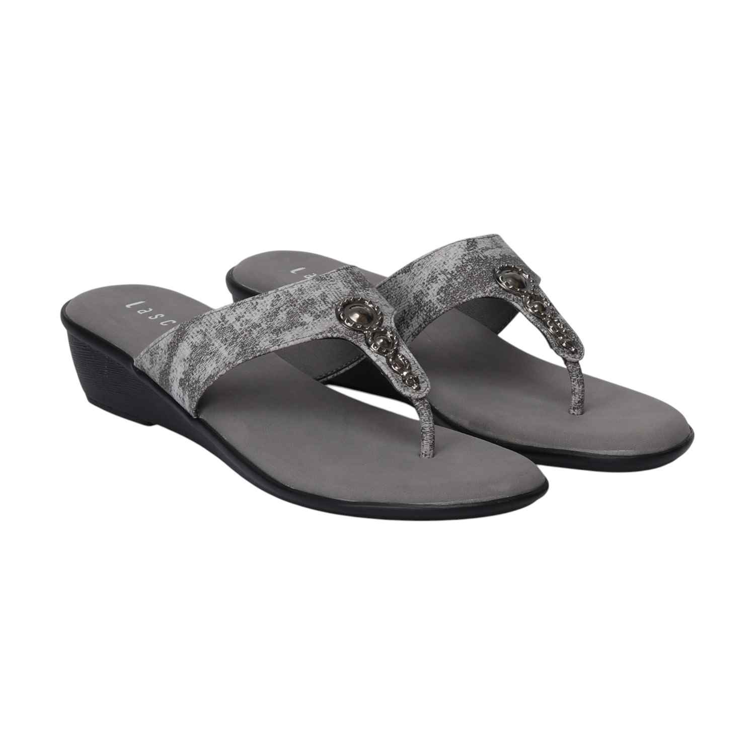 A perfect blend of fashion and function, these Grey textured strap wedges combine a sleek thong silhouette with the comfort of a stable wedge. The subtly textured strap and delicate embellishments add unique visual interest, ensuring these sandals are a chic and practical addition to your footwear collection.