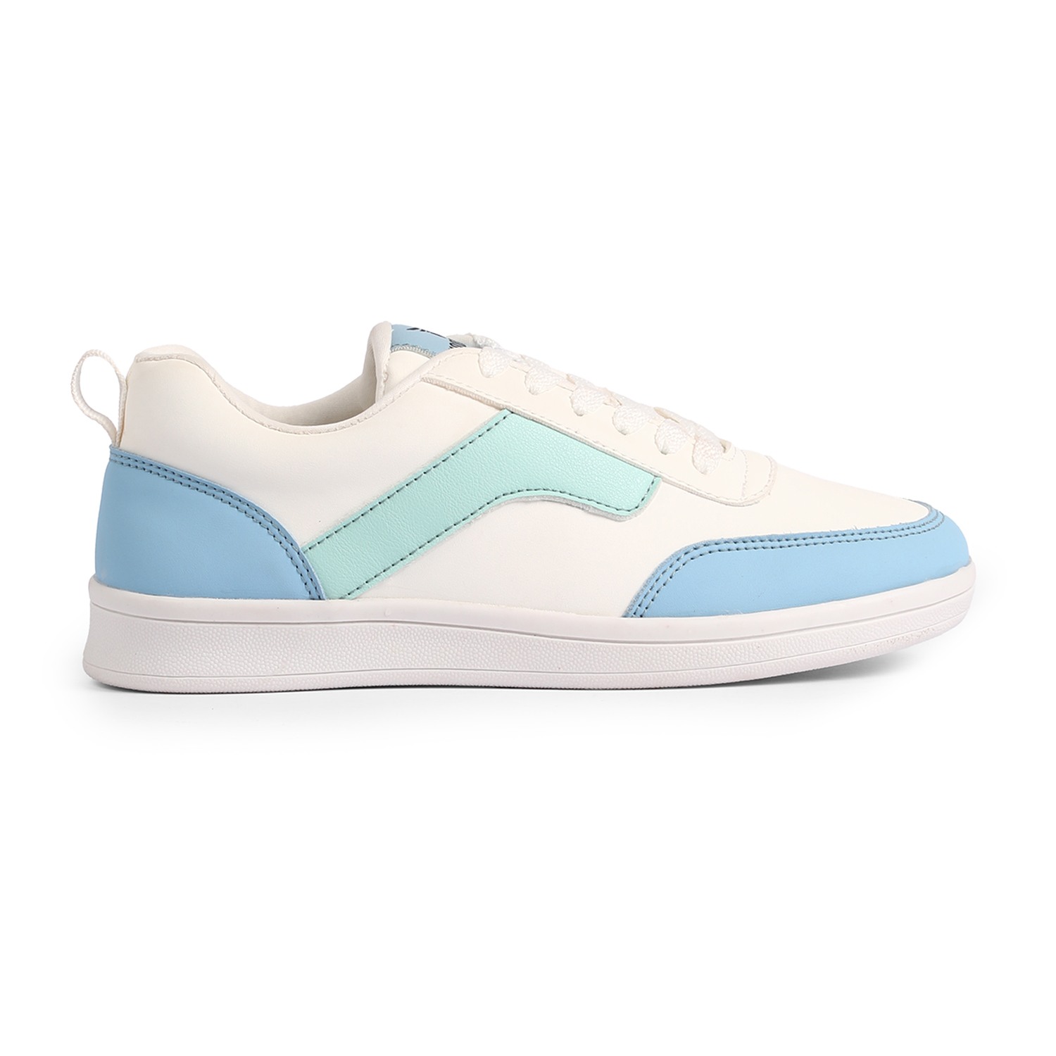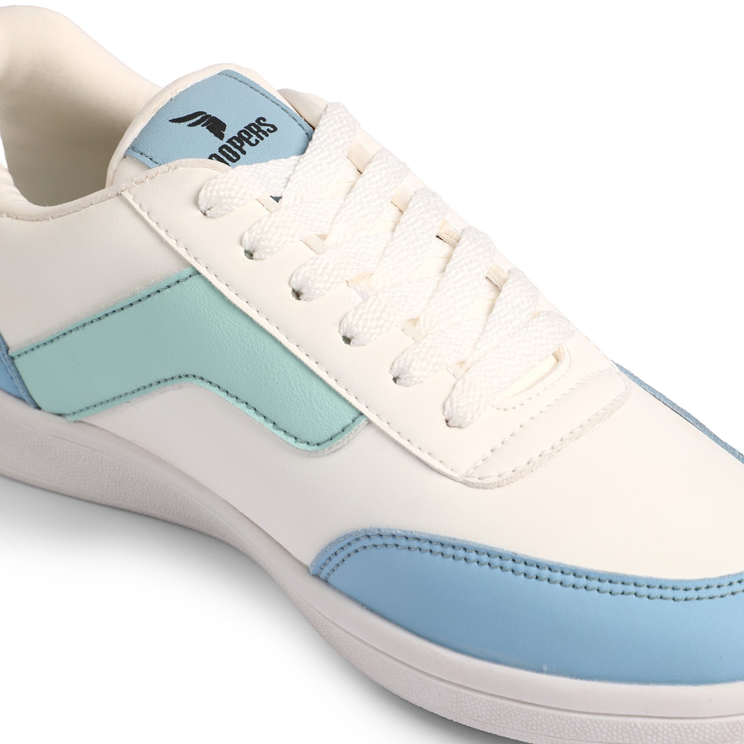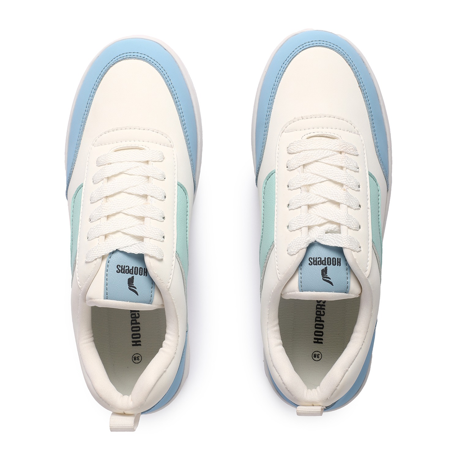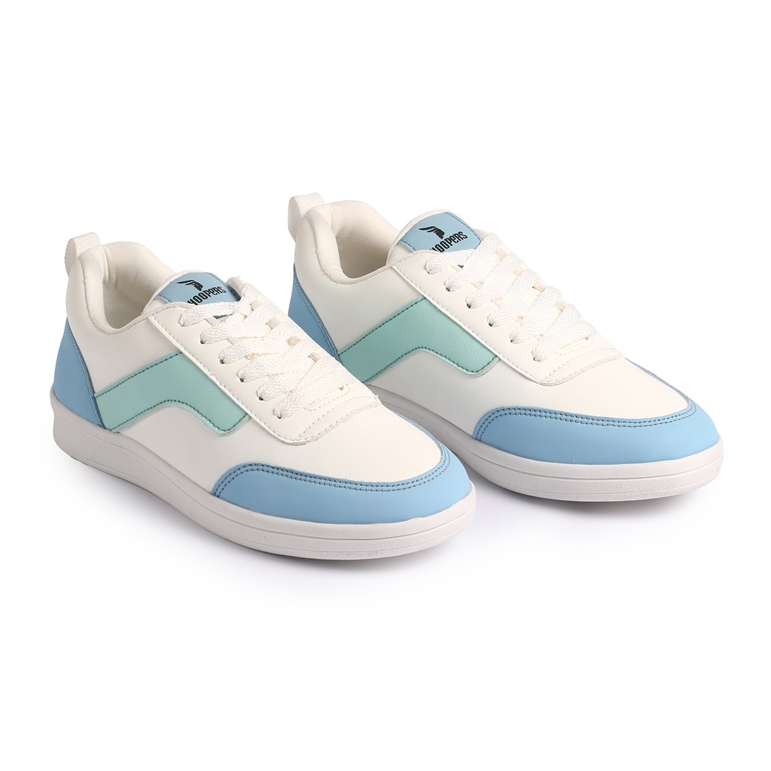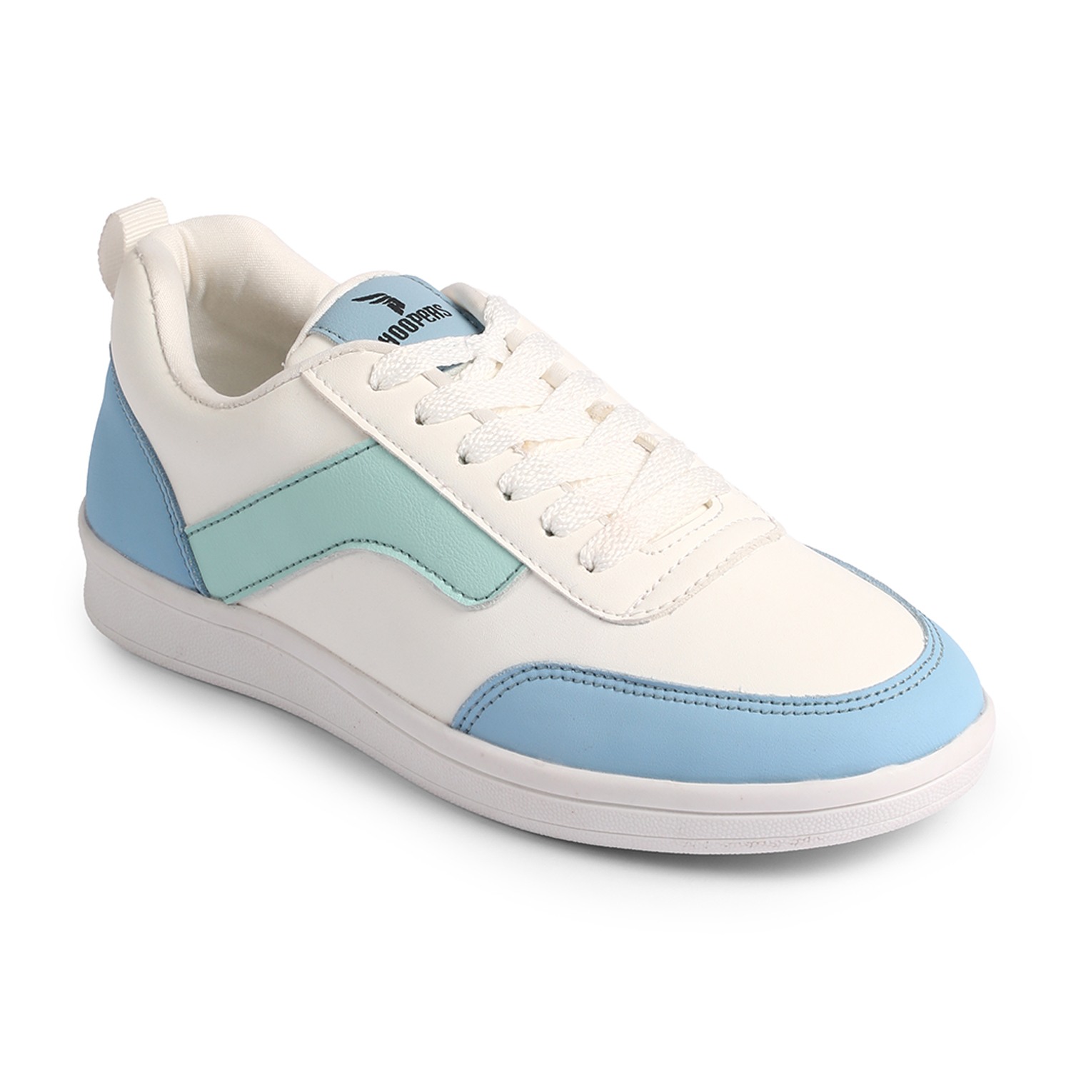 Ride the style tide with our refreshing Ocean Wave Sneakers. These women's lace-up trainers boast a crisp white base, elegantly accented with captivating light blue and mint green wavy stripes on the side, reminiscent of ocean currents. With matching blue accents around the heel and 'HOOPERS' branding on the tongue, they offer a perfect blend of casual charm and athletic comfort for your everyday adventures