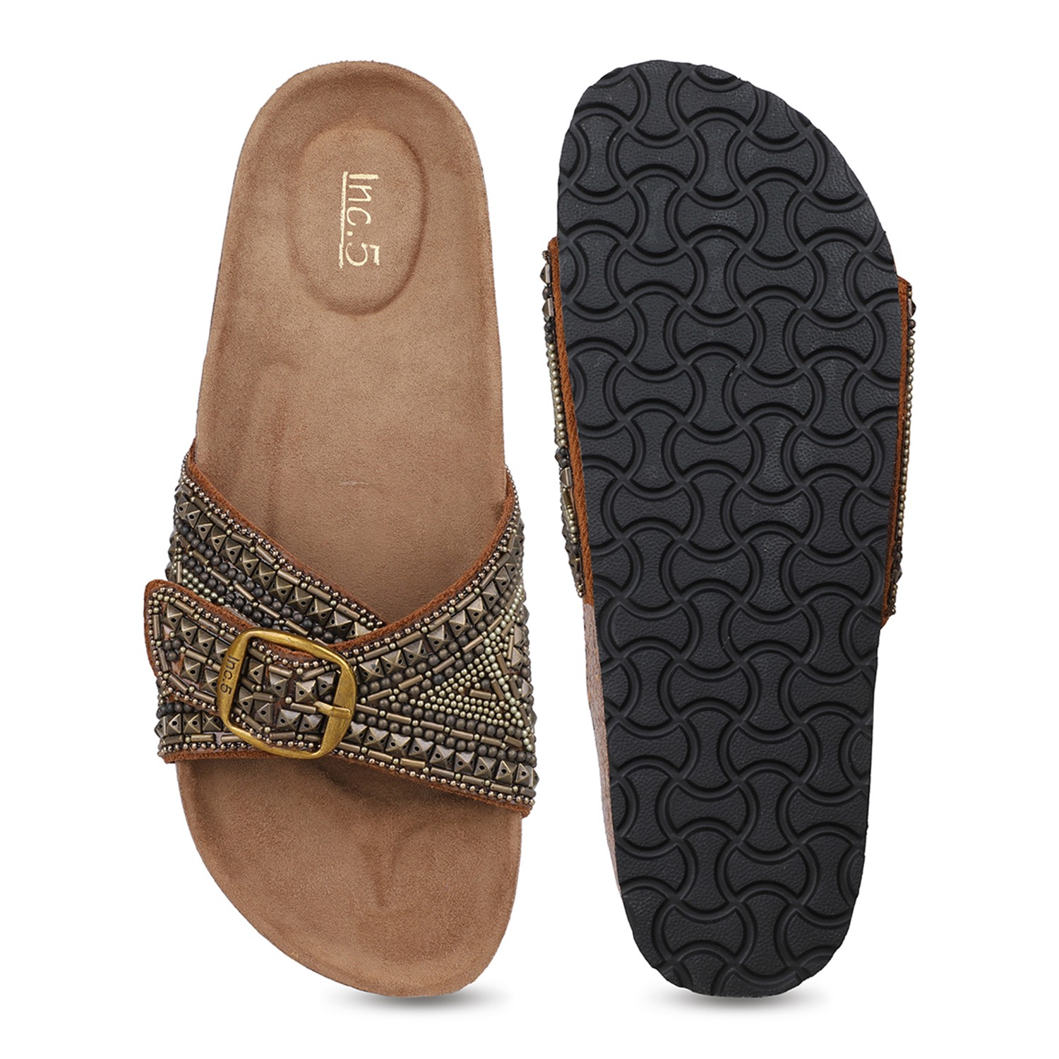 Shimmer with elegance in these golden embellished slip-ons. The intricate ethnic work and cushioned sole ensure comfort and charm with every step.