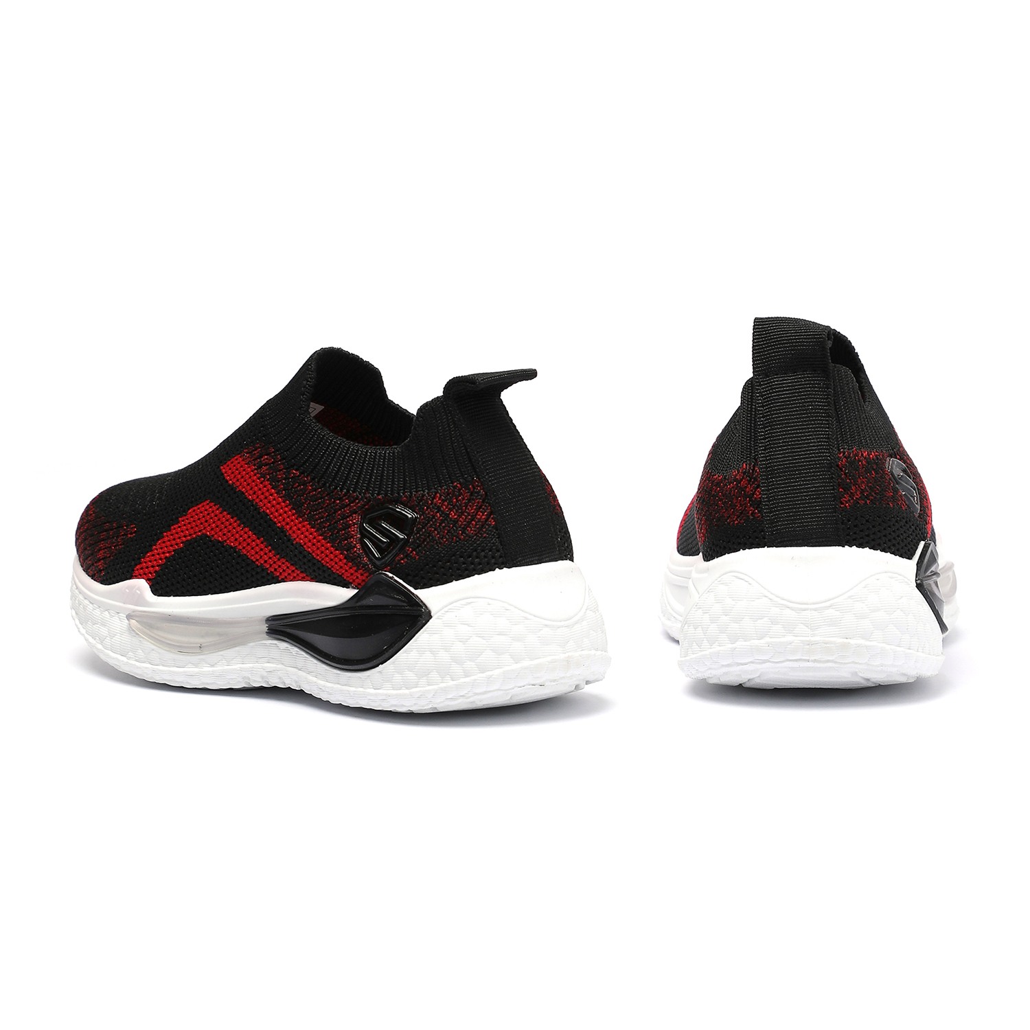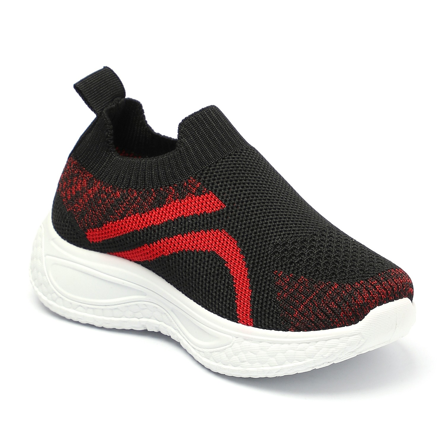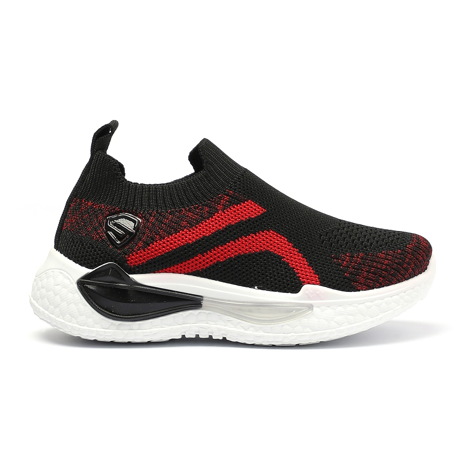 Step into comfort and style with these kids black and red slip-on sports shoes. Crafted with a breathable knit mesh upper, these shoes offer a snug sock-like fit and superior flexibility. The bold red accents add a sporty edge, while the cushioned white sole provides excellent support and shock absorption for active play.