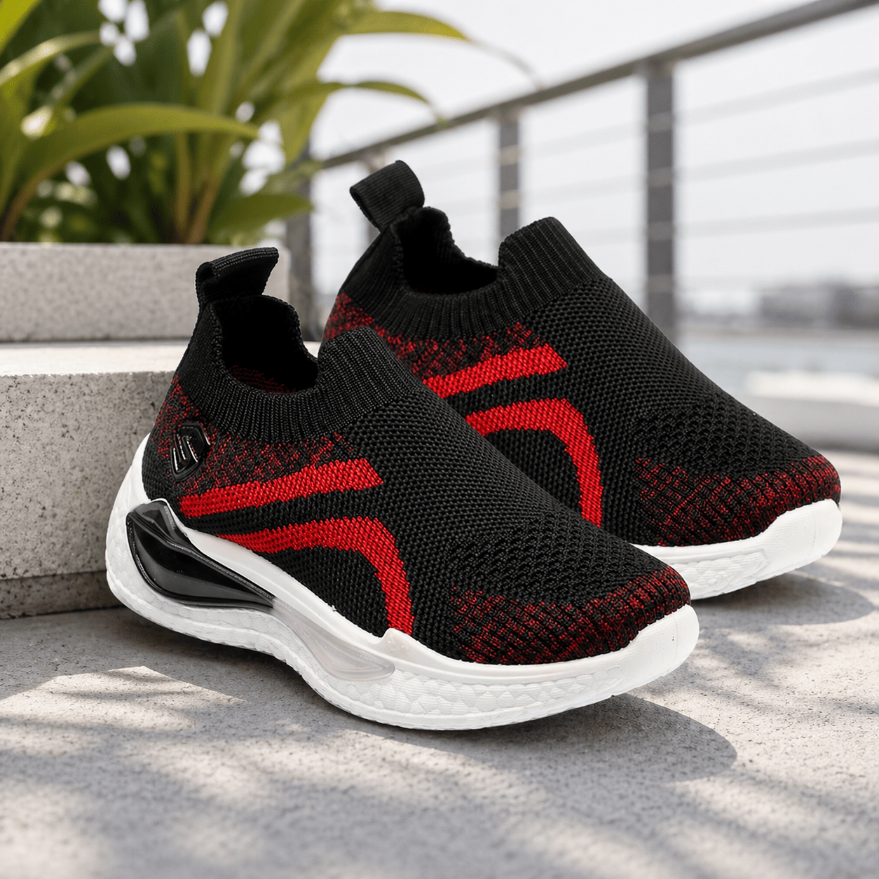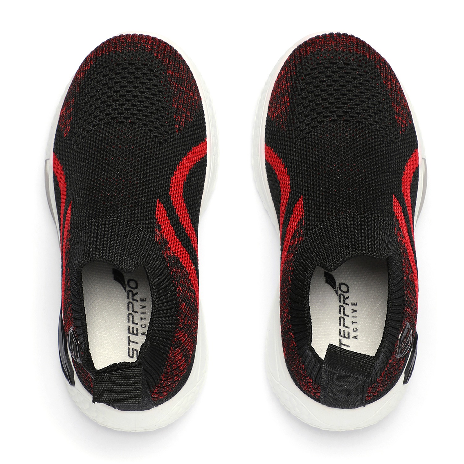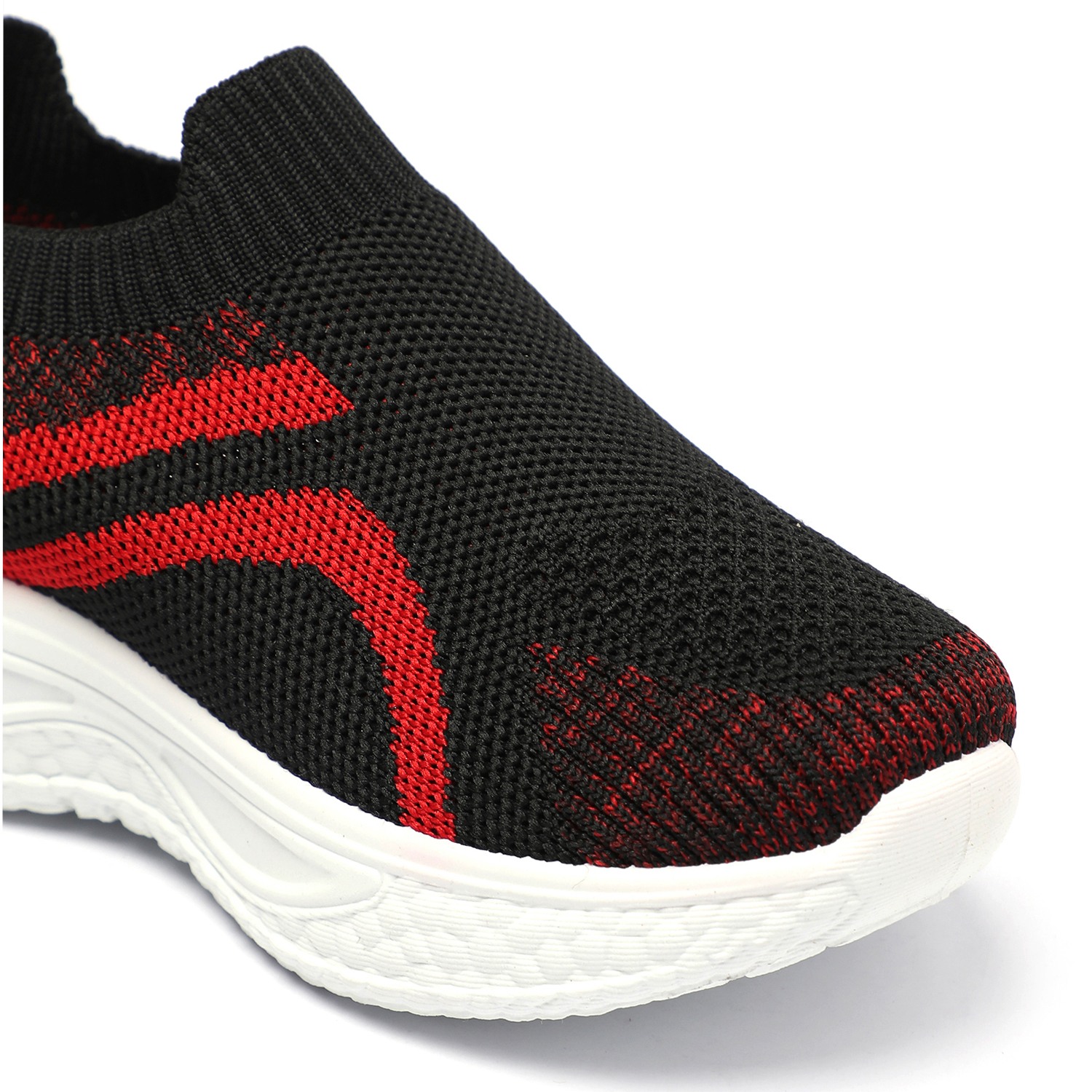 Step into comfort and style with these kids black and red slip-on sports shoes. Crafted with a breathable knit mesh upper, these shoes offer a snug sock-like fit and superior flexibility. The bold red accents add a sporty edge, while the cushioned white sole provides excellent support and shock absorption for active play.
