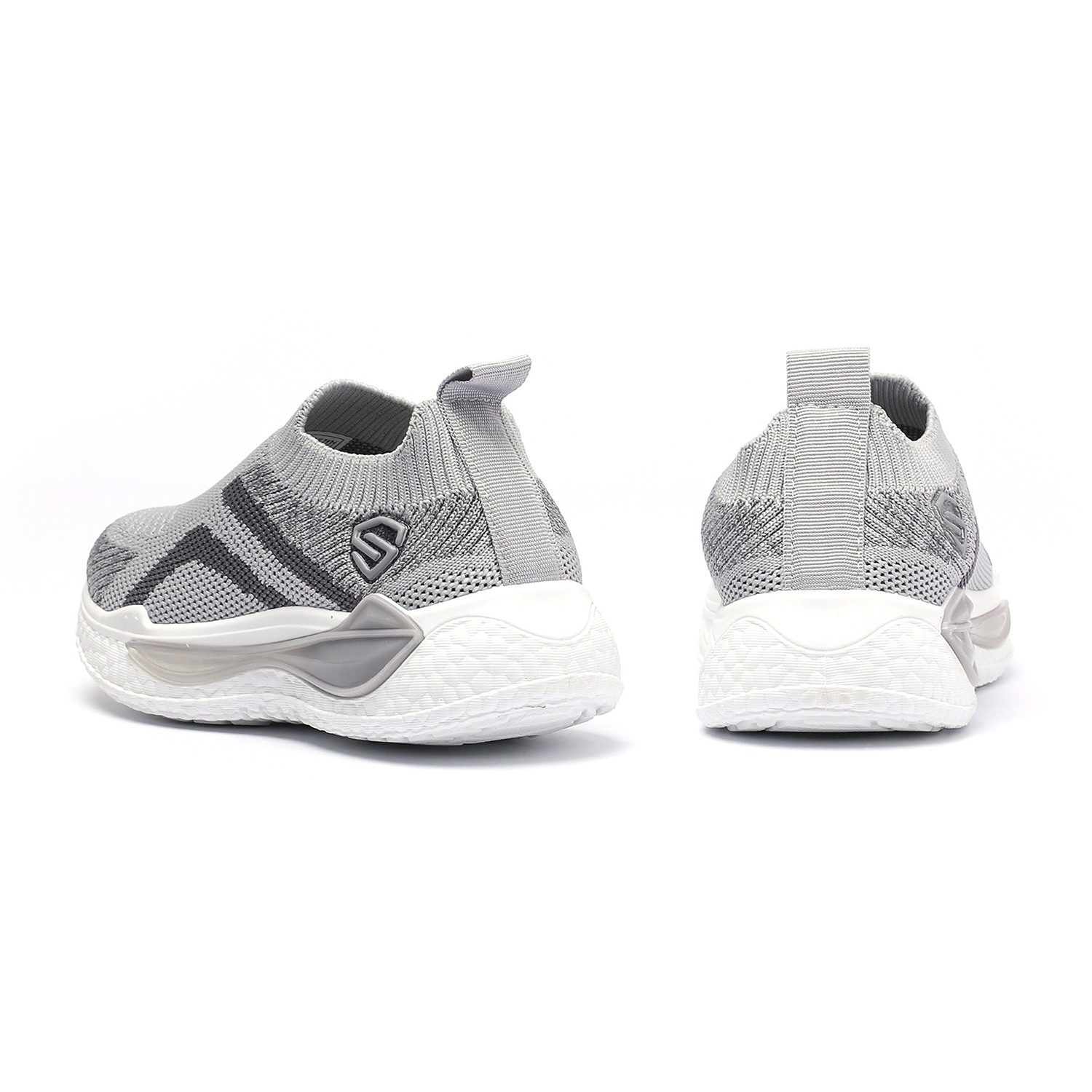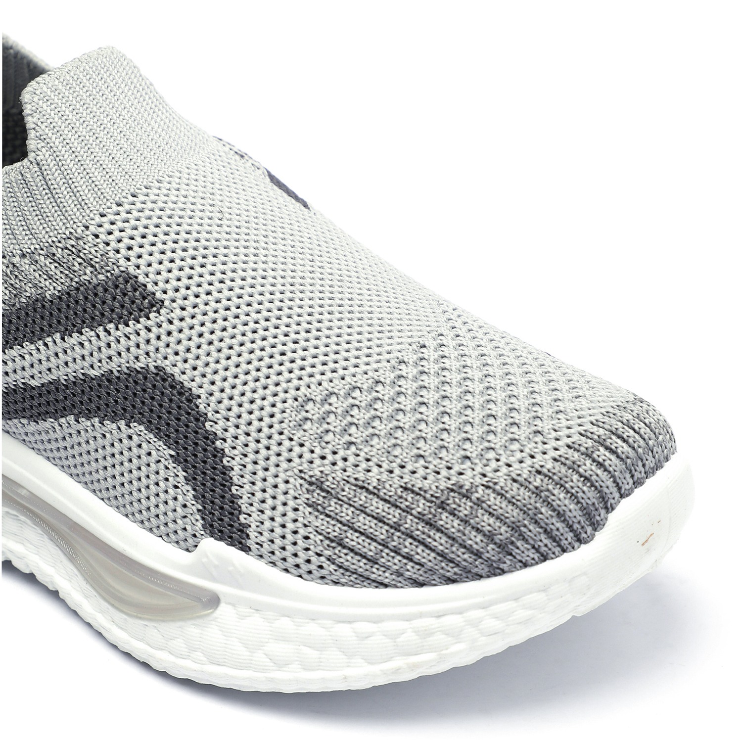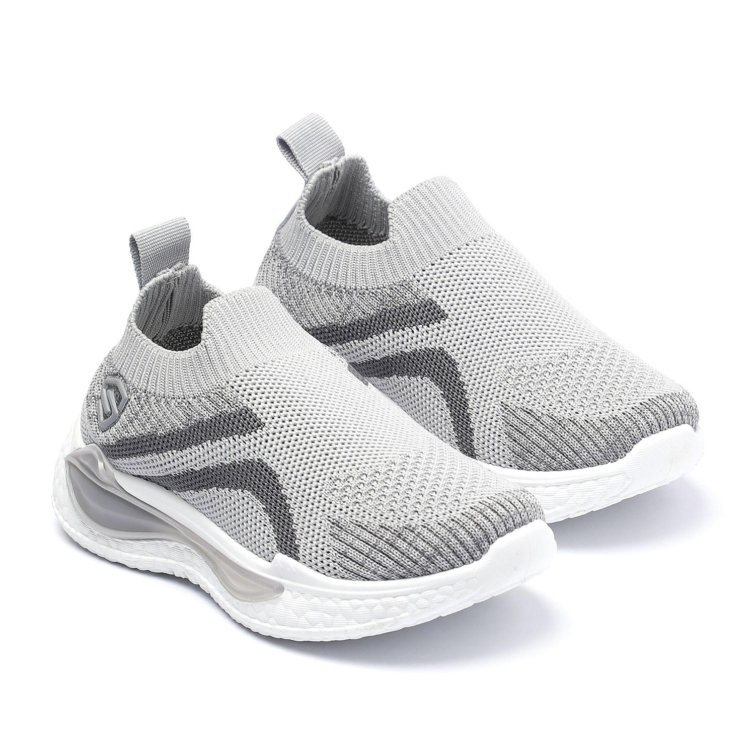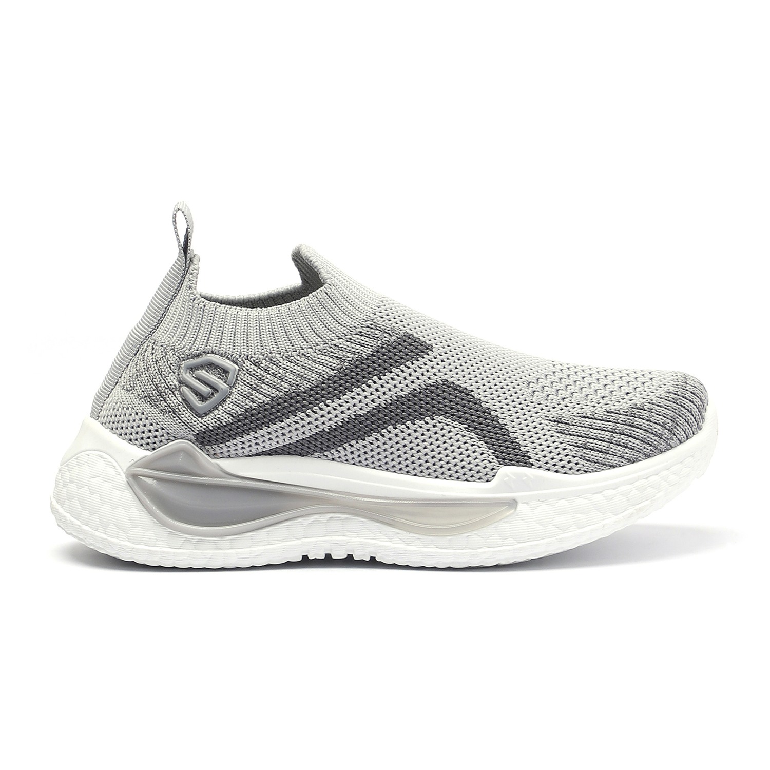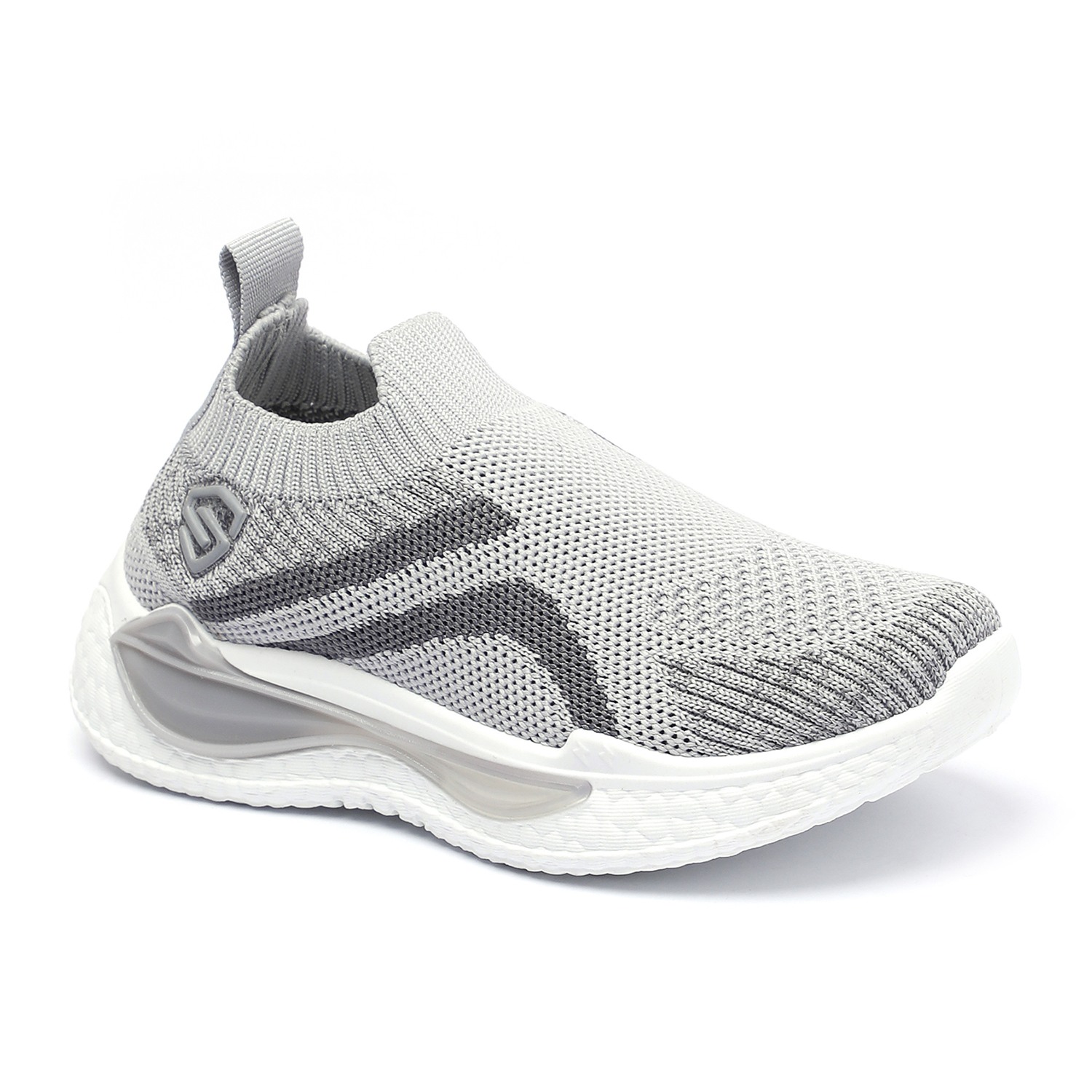 Step into comfort and style with these kids grey and black slip-on sports shoes. Crafted with a breathable knit mesh upper, these shoes offer a snug sock-like fit and superior flexibility. The bold black accents add a sporty edge, while the cushioned white sole provides excellent support and shock absorption for active play.