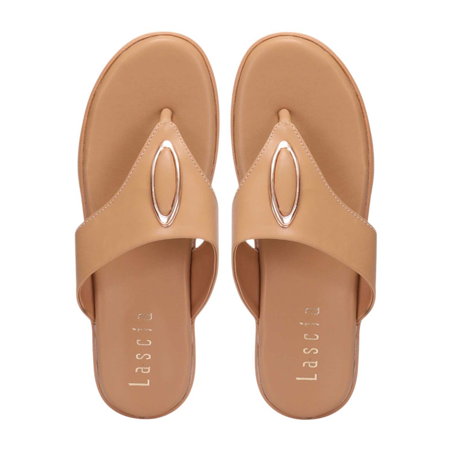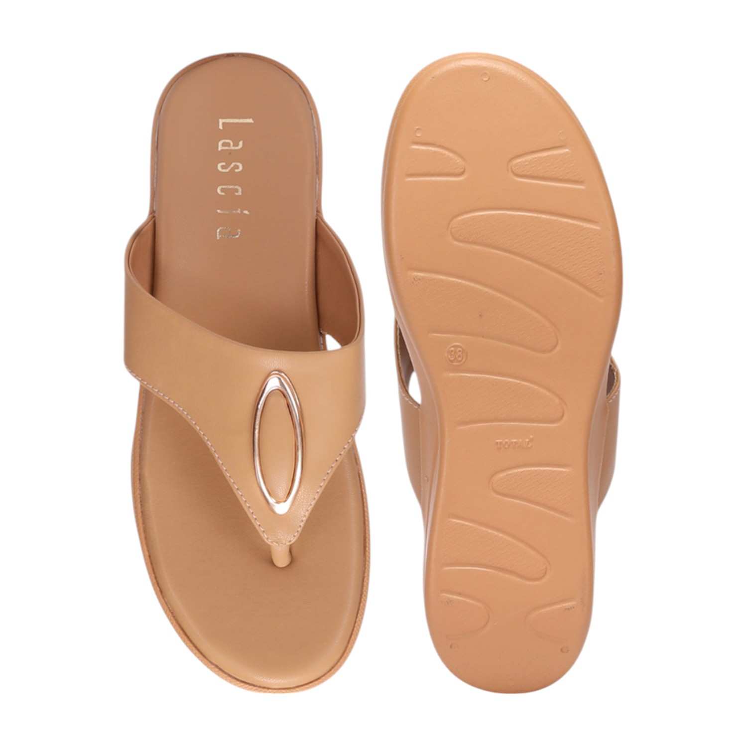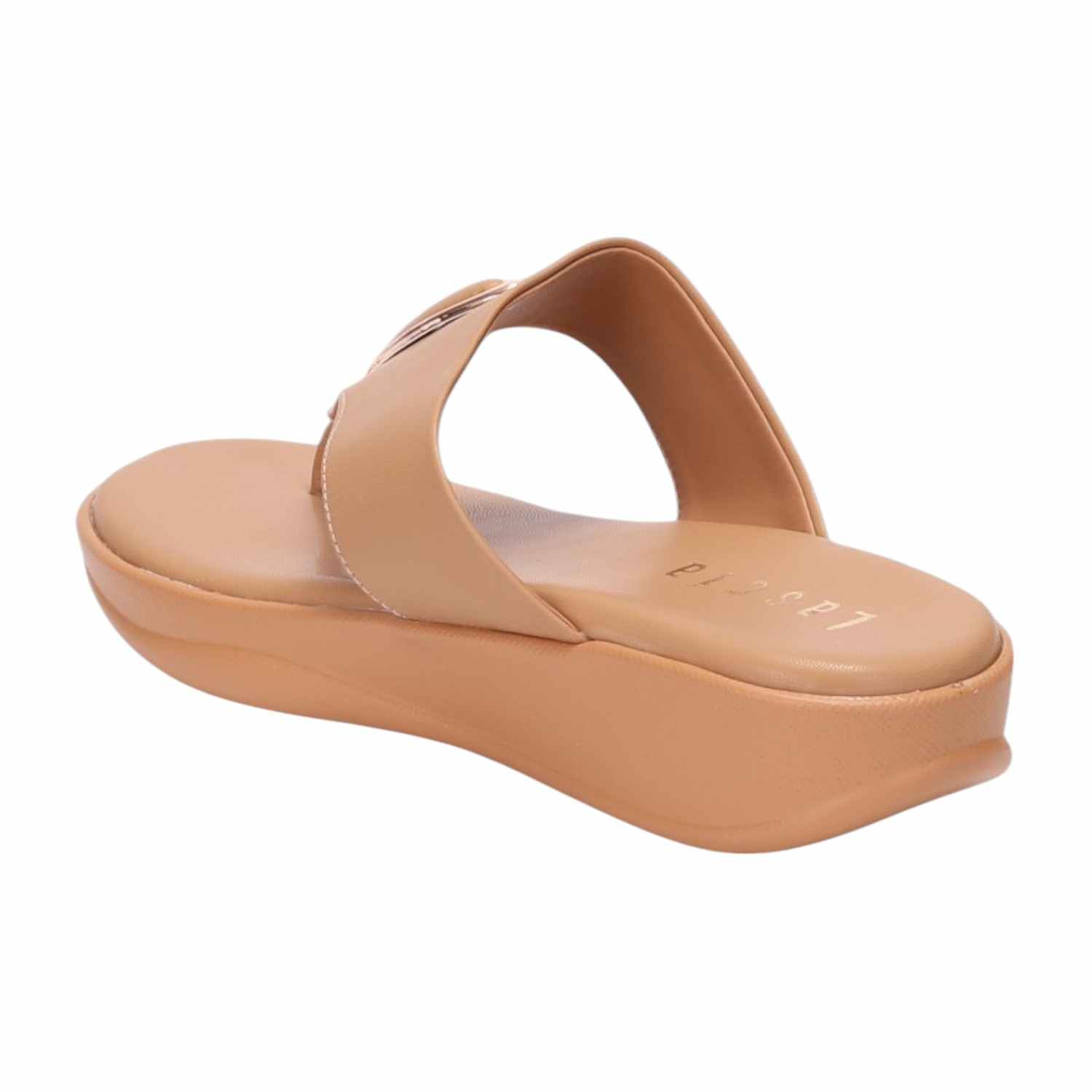 Designed for effortless wear, these chic honey Tan thong slides combine a subtle wedge heel with a distinctive metallic accent. The rich Honey Tan hue pairs beautifully with various ensembles, providing a stylish and comfortable option for your casual footwear needs.