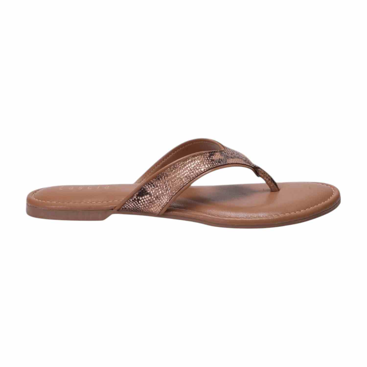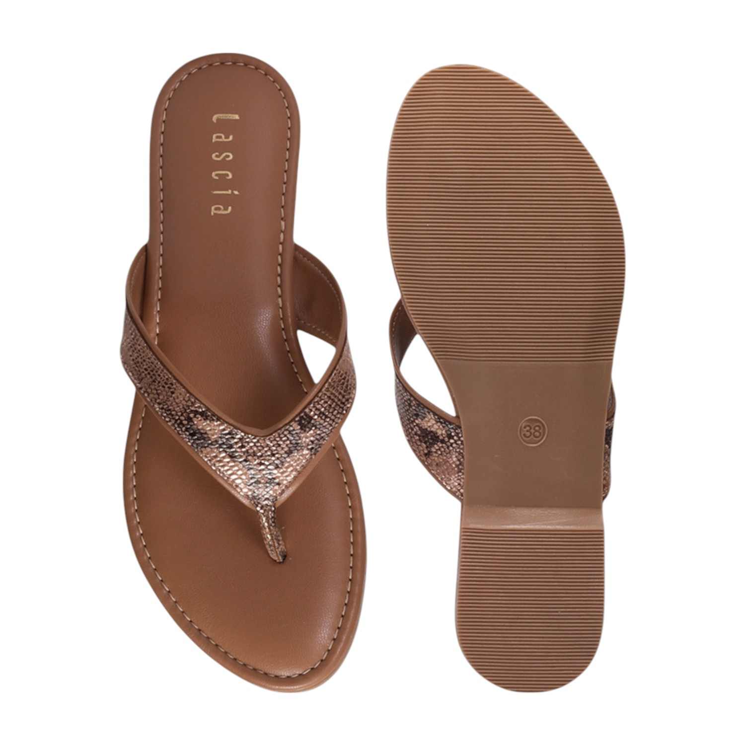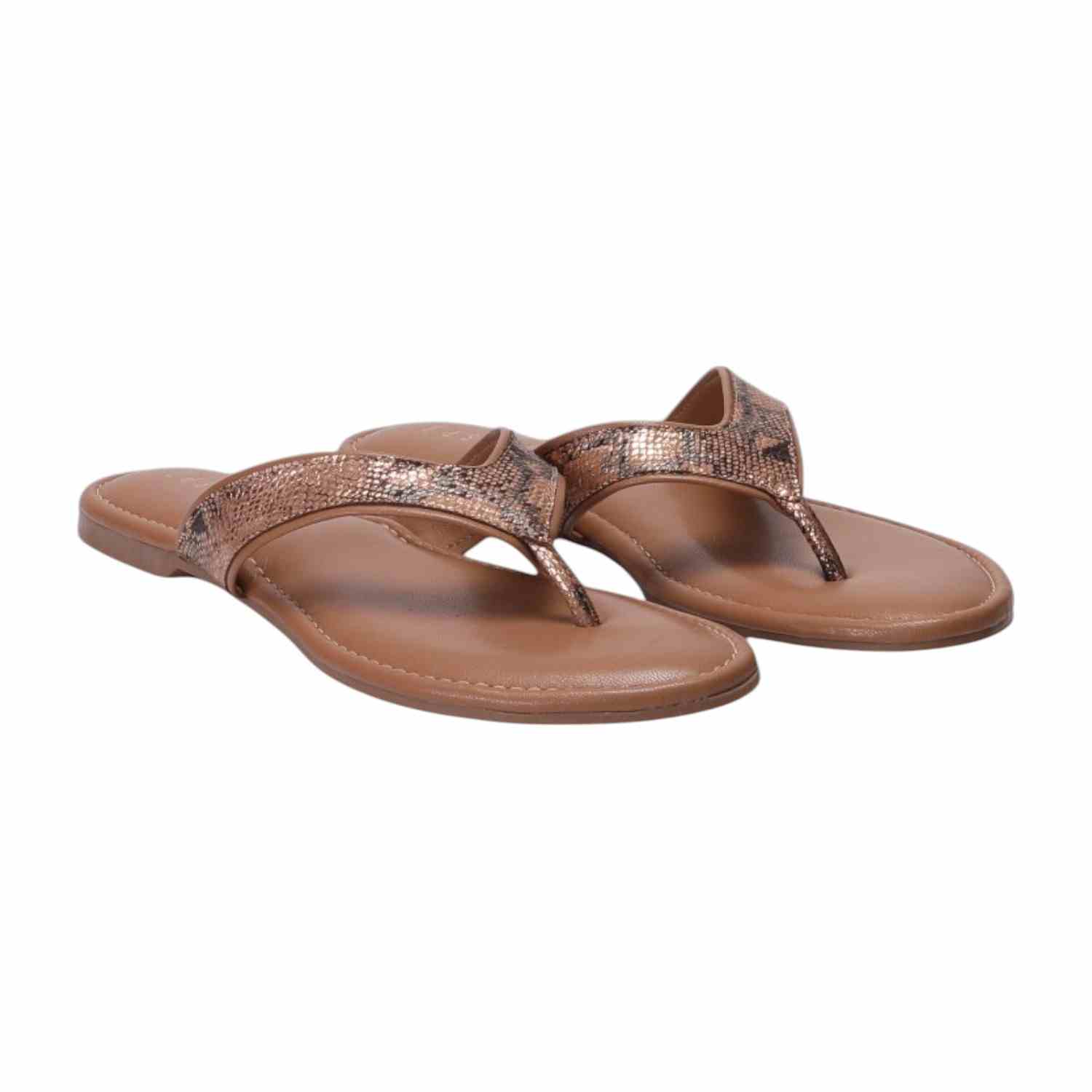 These Women Tan Casual Flat Thongs offer a blend of delicate charm and comfortable style. They feature a thong strap with a subtle metallic snakeskin pattern, set on a matching Tan footbed and a flat sole, perfect for adding a refined touch to your casual ensemble