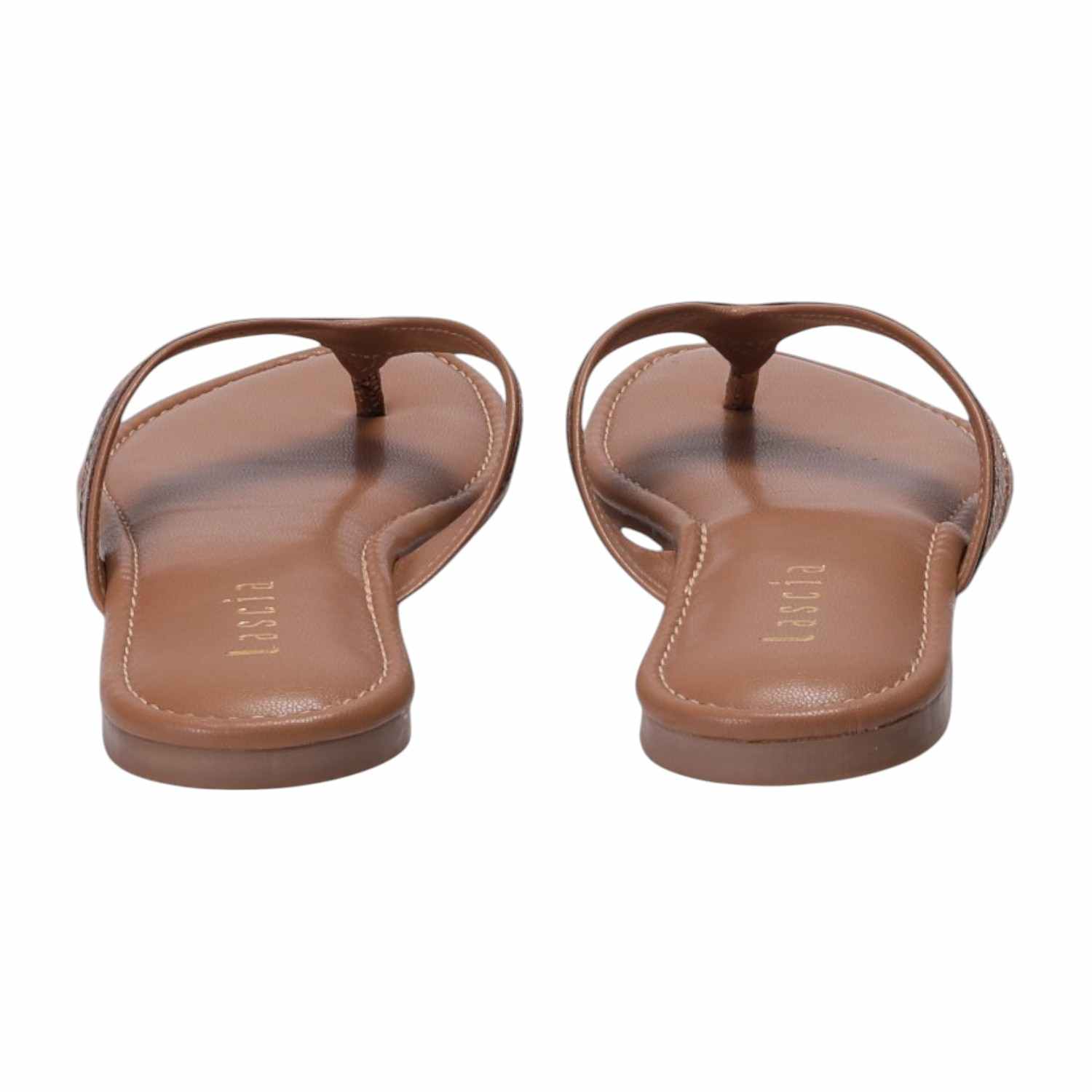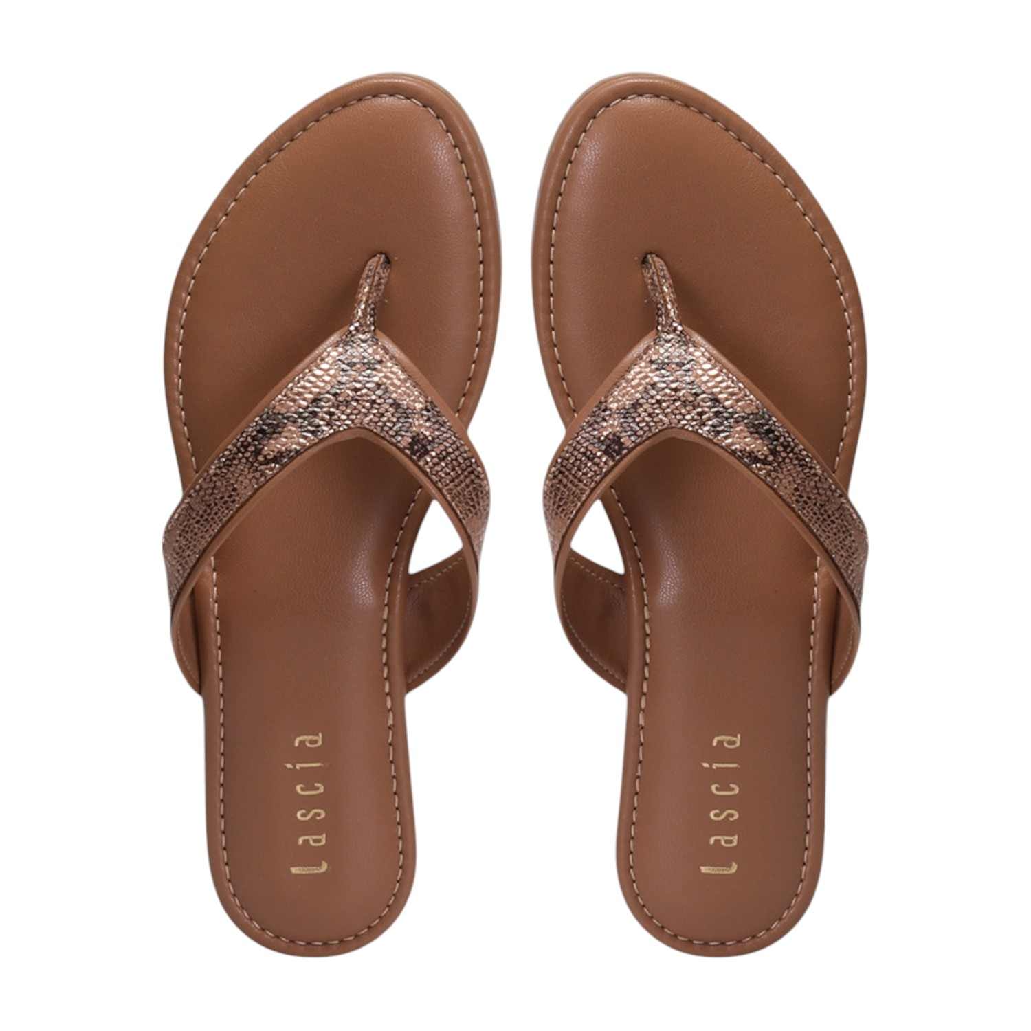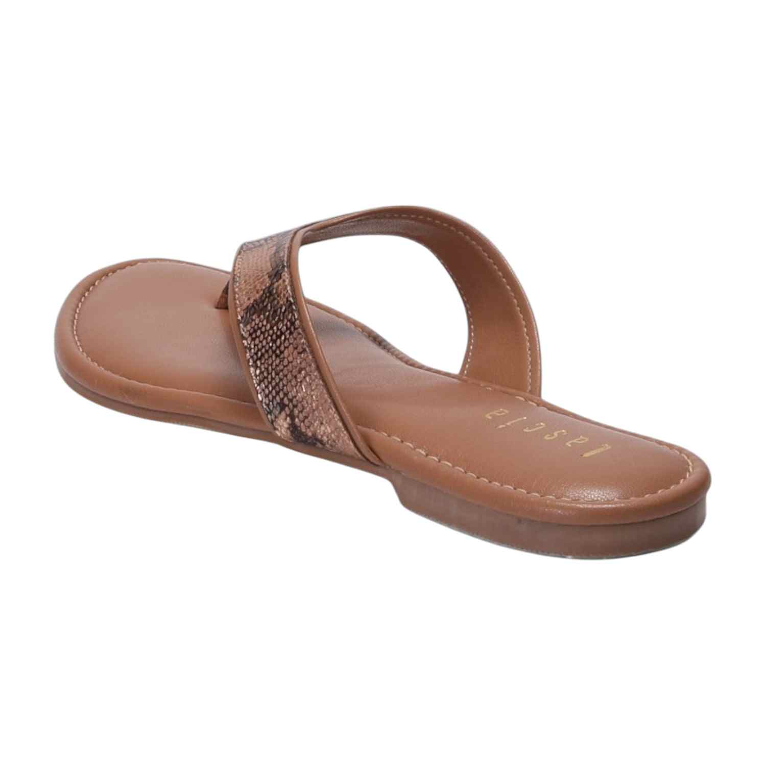 These Women Tan Casual Flat Thongs offer a blend of delicate charm and comfortable style. They feature a thong strap with a subtle metallic snakeskin pattern, set on a matching Tan footbed and a flat sole, perfect for adding a refined touch to your casual ensemble