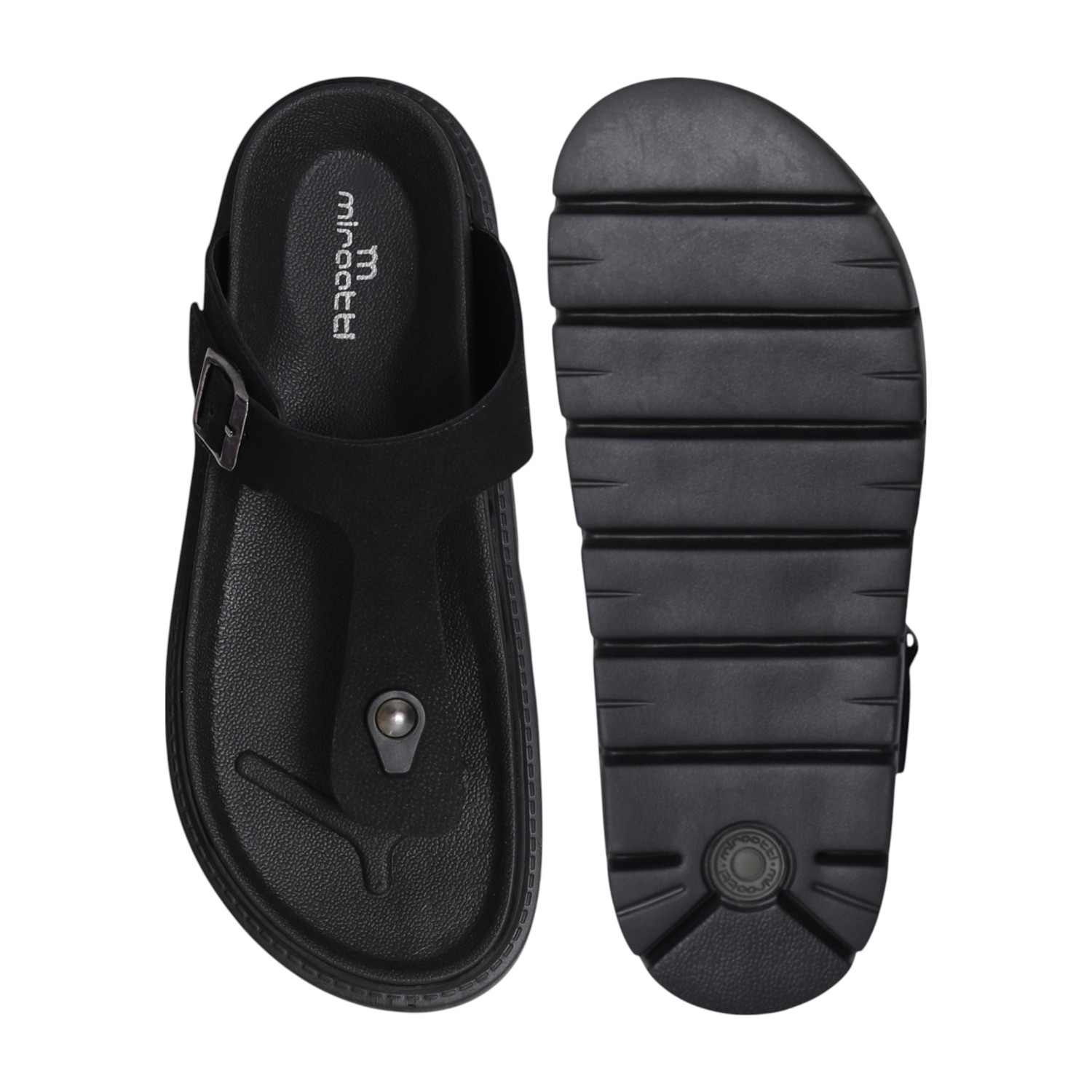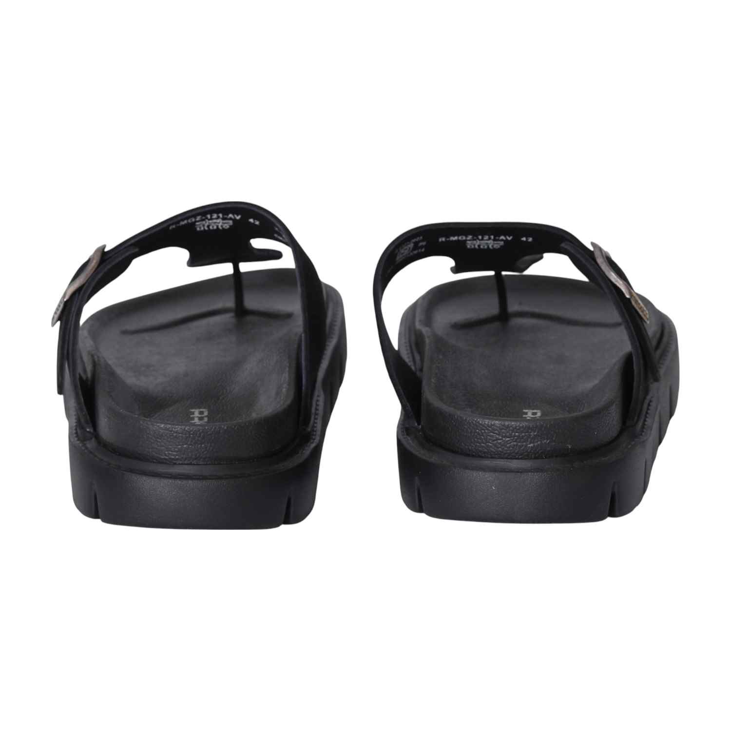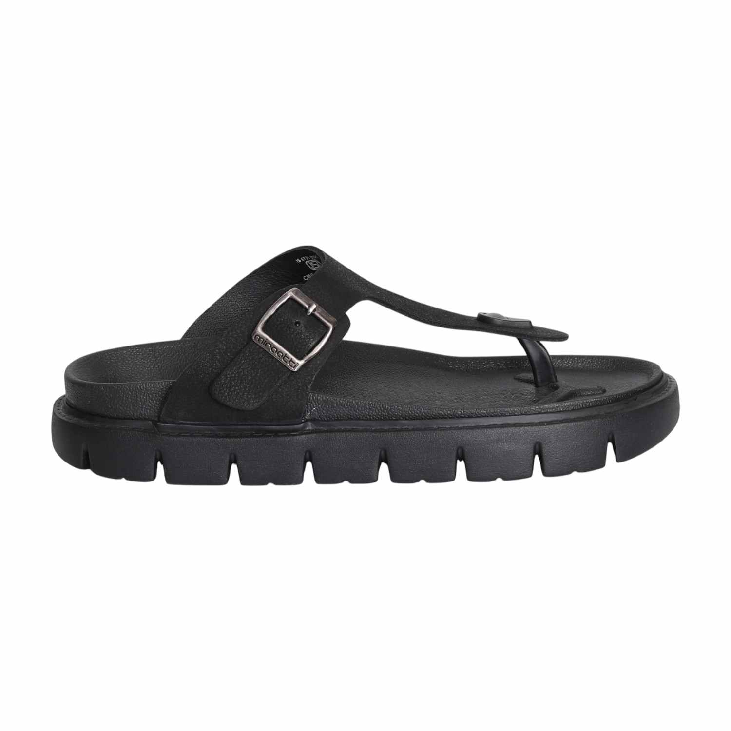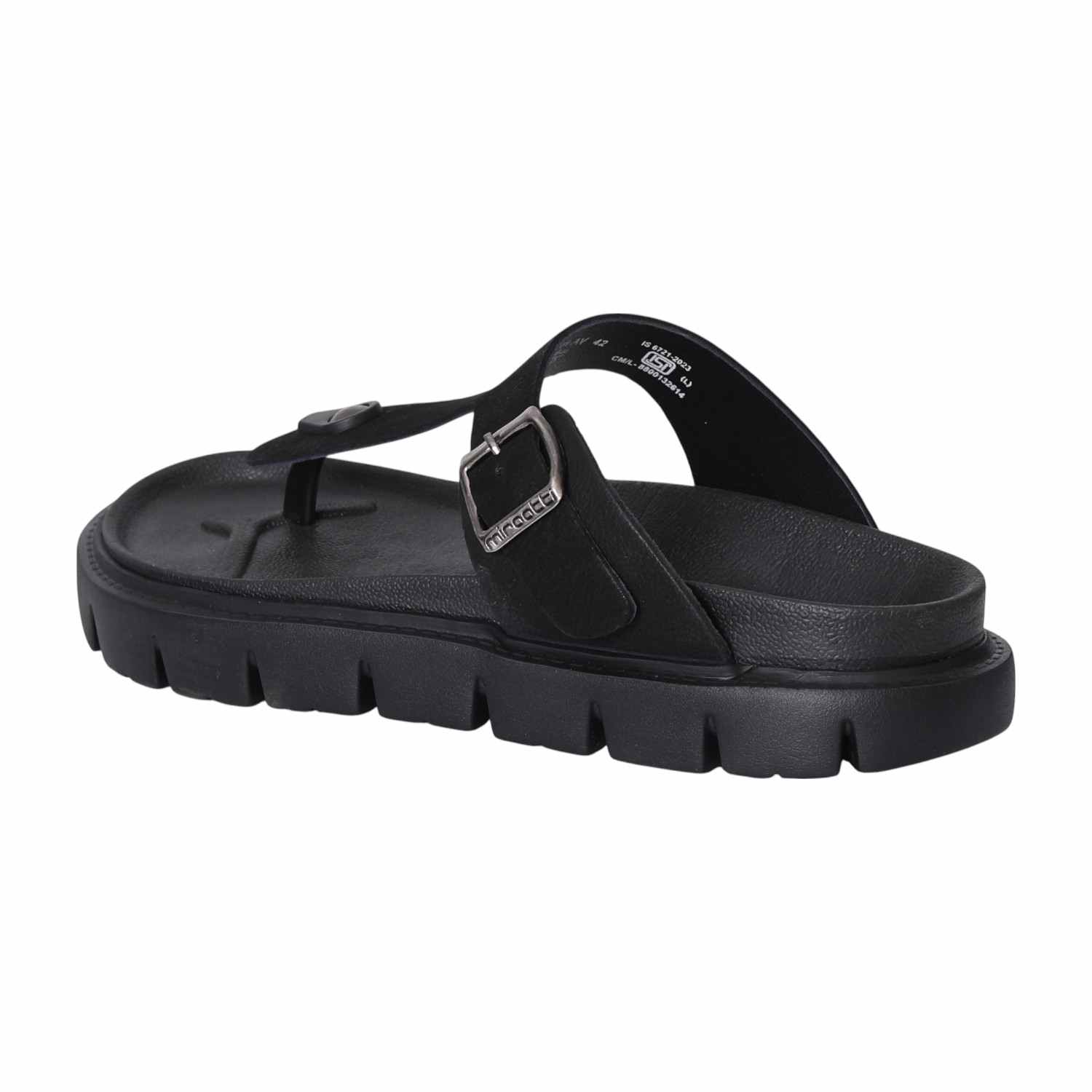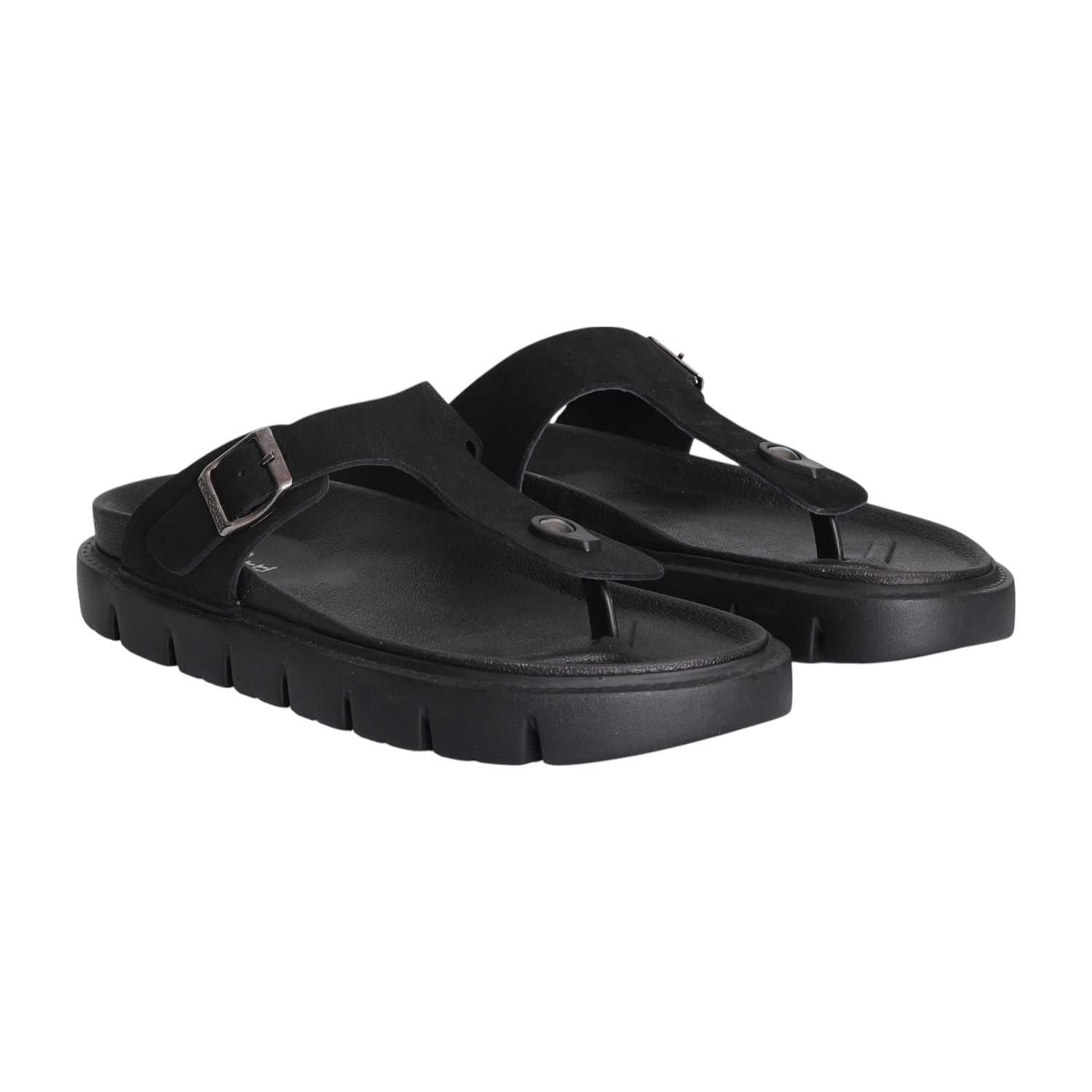 Step into bold style with our Black Chunky Thong Sandal. This striking sandal features an all-black design, grounded by a very thick, chunky, and ridged sole for a contemporary, robust look. The wide main strap boasts a textured surface, adorned with a prominent silver-toned rectangular buckle, adding to its distinctive appeal. Perfect for those seeking a statement piece that offers both commanding presence and comfortable wear for casual or fashion-forward ensembles.