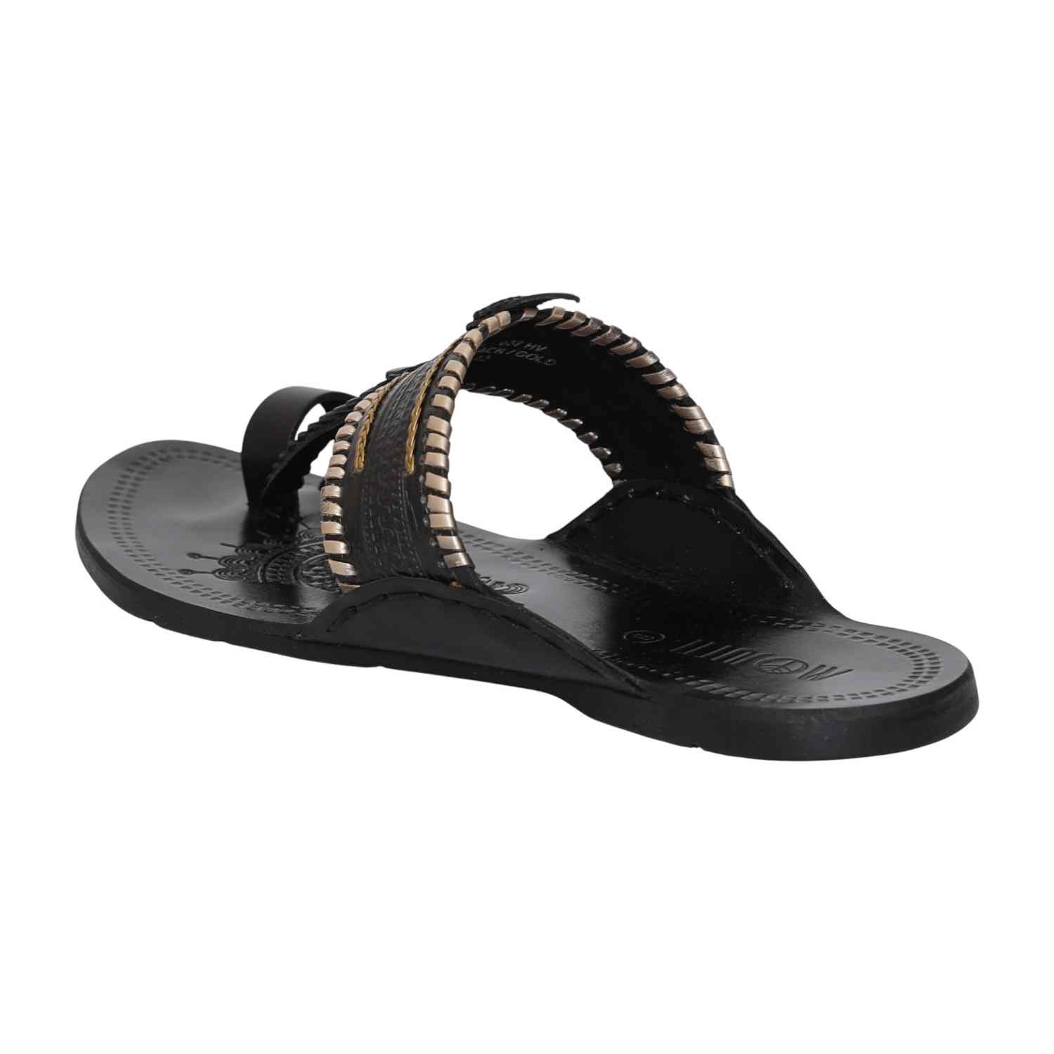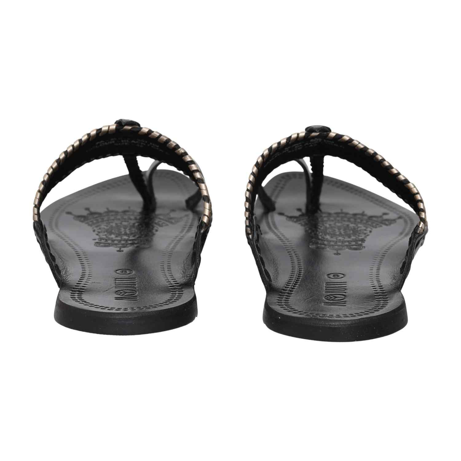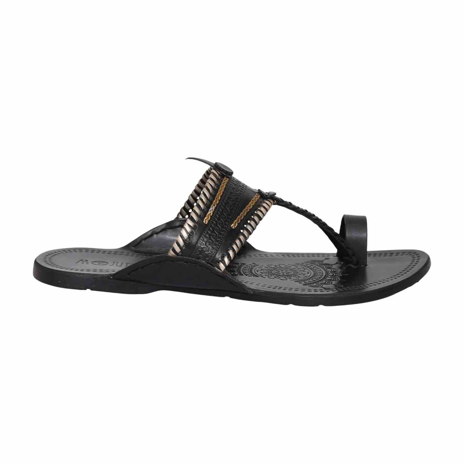 This handcrafted Kolhapuri sandal combines classic artistry with a bold contemporary edge. Made with premium leather, it features intricate weaving, metallic accents, and a deep black tone that gives it a statement-making appeal. Ideal for ethnic occasions or casual sophistication, it merges cultural heritage with modern versatility.