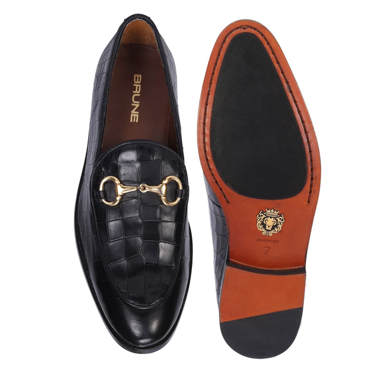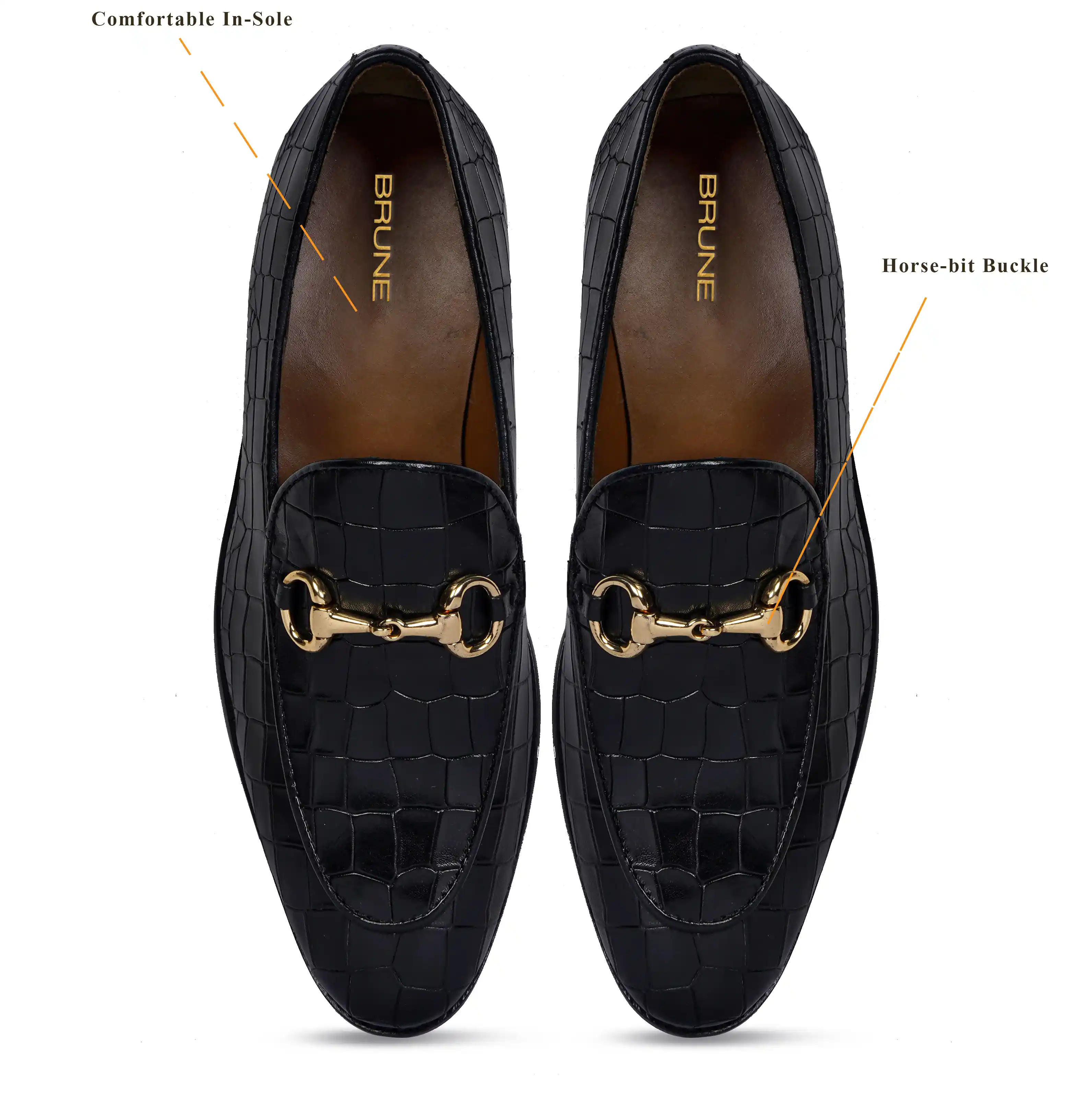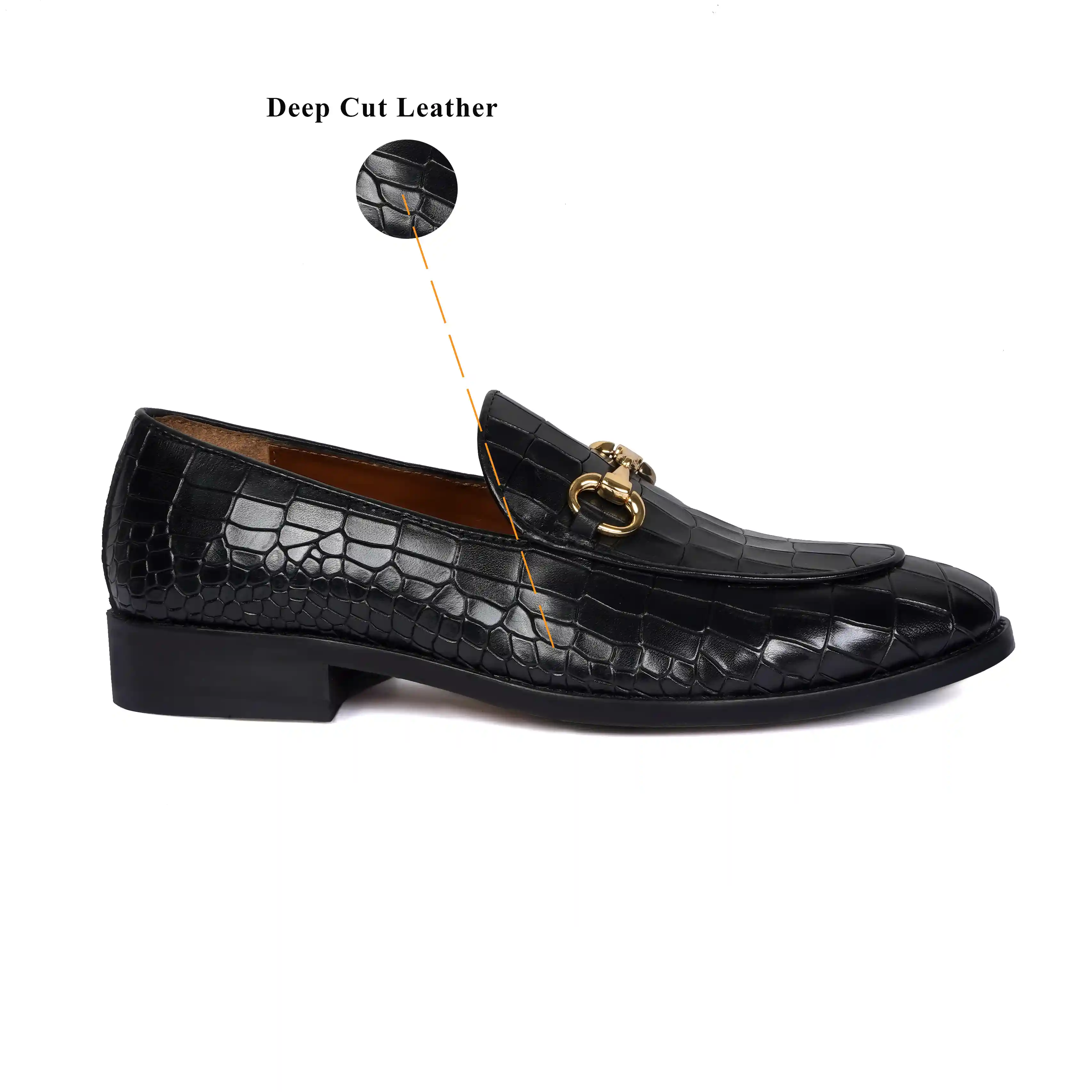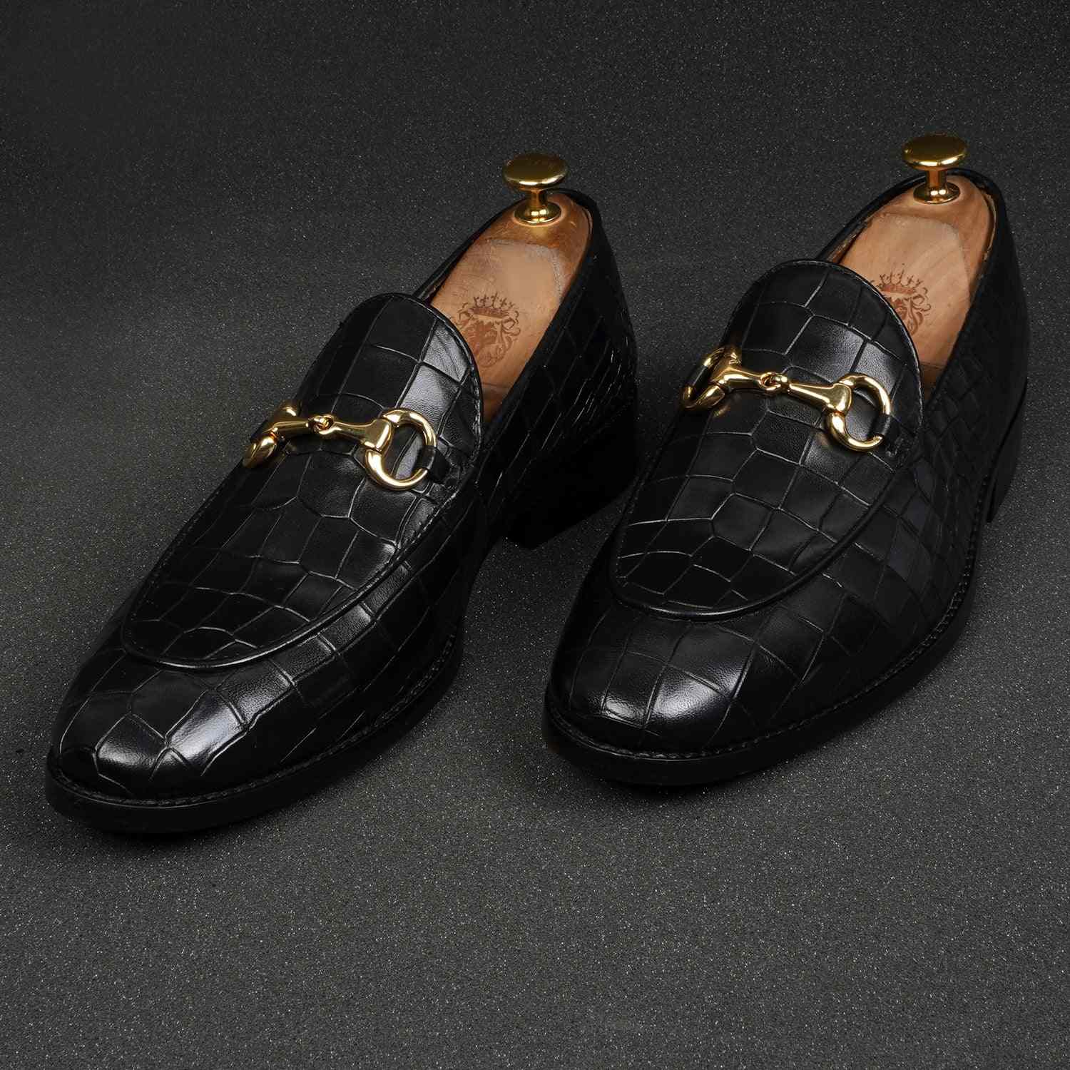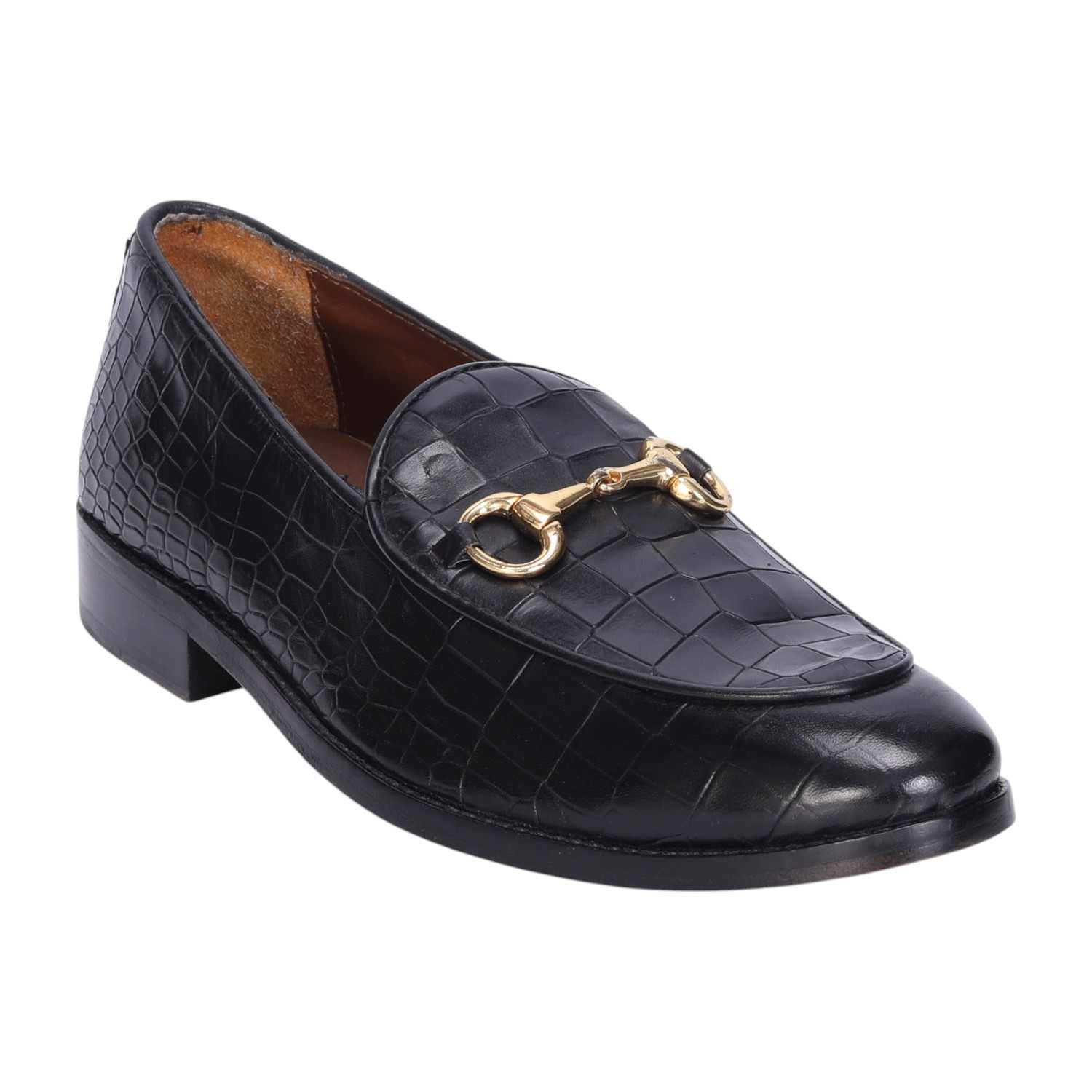 Make your everyday special with these classy men's loafers. It is the best shoe category for any men's closet. Loafers remain the favorite style of shoes, as they are convenient to use and spell minimum fuss. The Black Deep Cut Croco Leather shoe looks lavishing with metal horse-bit on it. And when they are made of exemplary fitting and finish as that of the brand Brune & Bareskin, you can be sure that the shoes are nothing short of excellence. These black leather shoes, with a perfectly round apron toe design, have a very rich appearance. This is a must-have pair in your footwear collection.