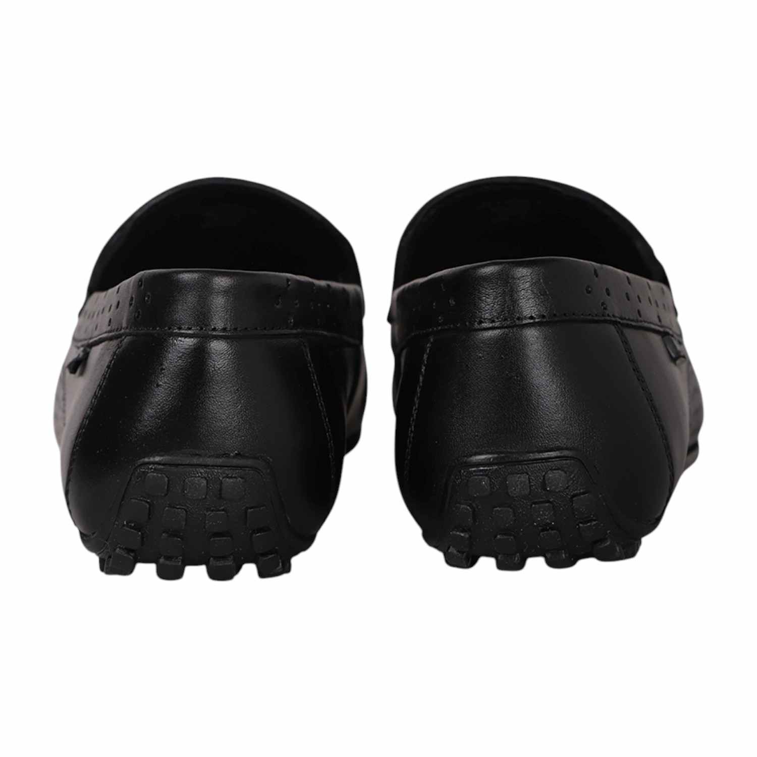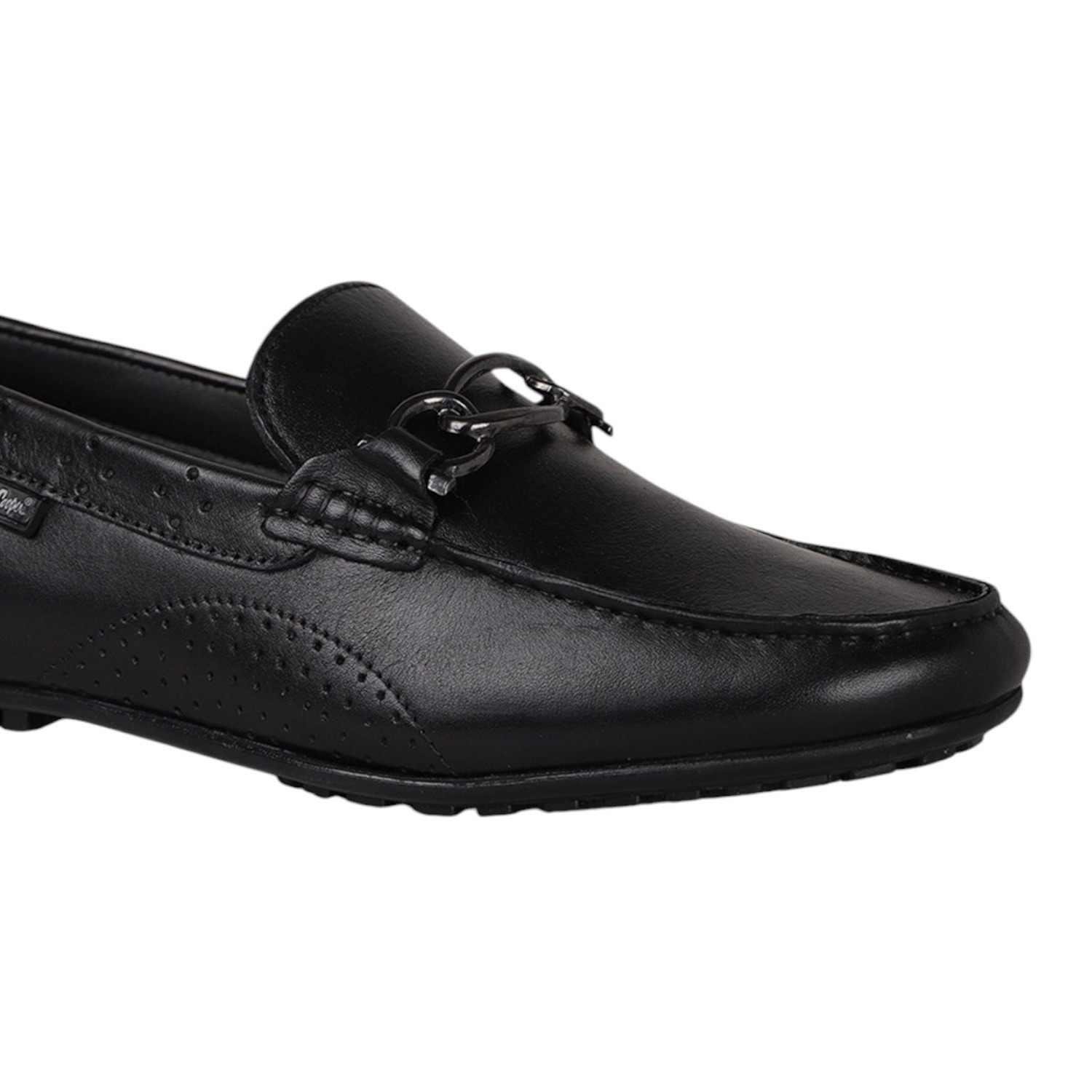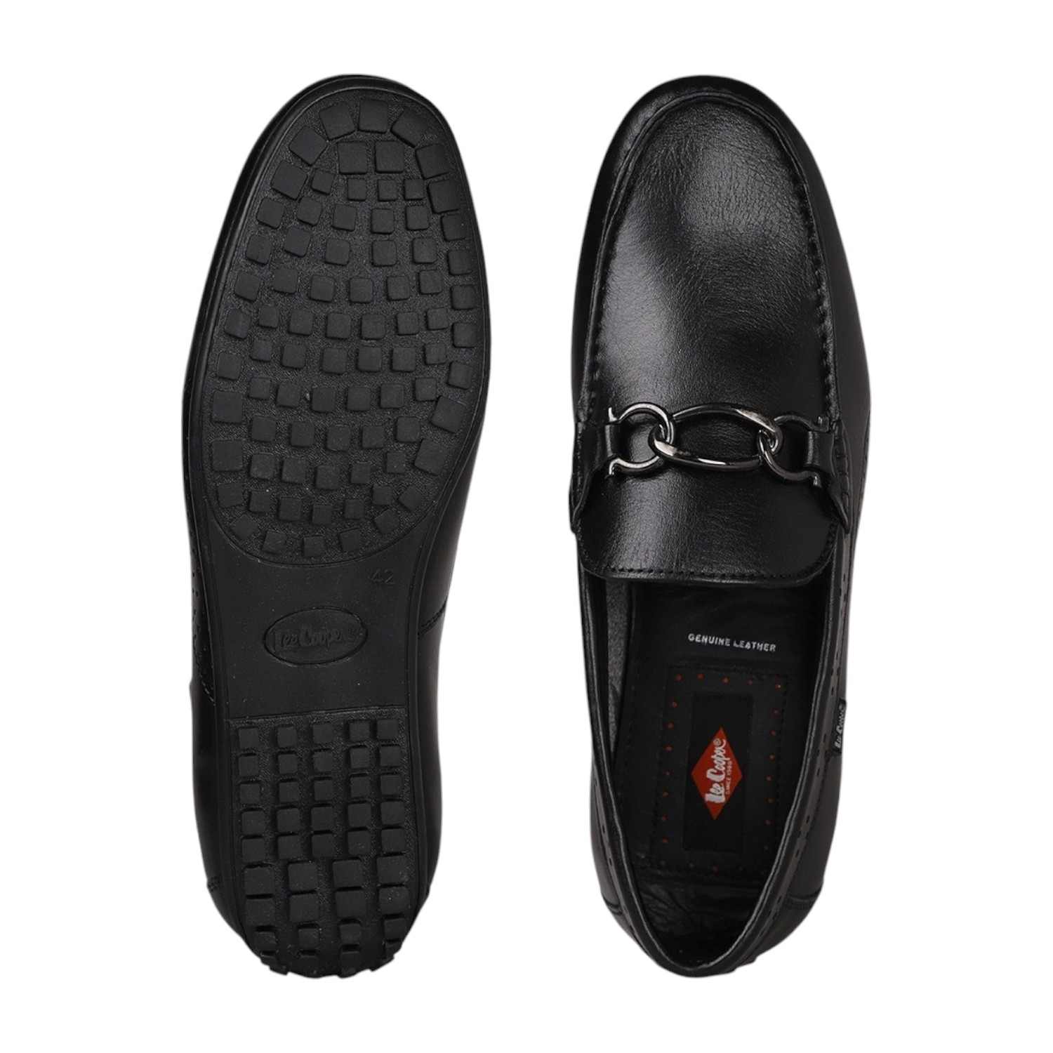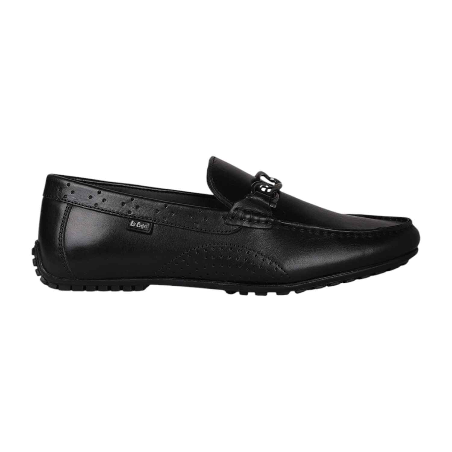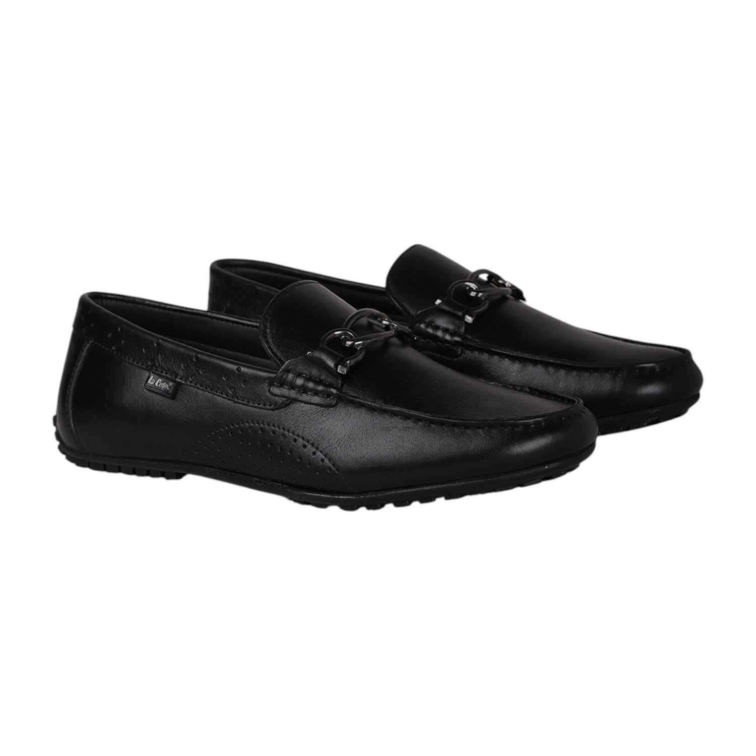 Step into timeless elegance with these black leather loafers from Lee cooper, designed for the modern gentleman. Crafted with a sleek finish, the shoes feature subtle perforated detailing and a classic metal bit ornament on the vamp for a refined touch. The low-profile rubber sole ensures comfort and grip, making them ideal for both formal and semi-casual wear