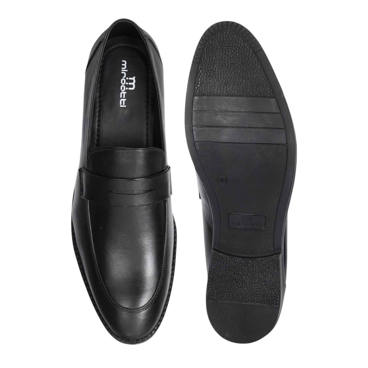 The Miraatti Black Polished Slip-On Dress Shoes combine style with ease. Their slip-on construction allows for quick wear, while the cushioned insole ensures comfort throughout your busy day. A polished upper completes the look, making them ideal for both work and formal occasions.